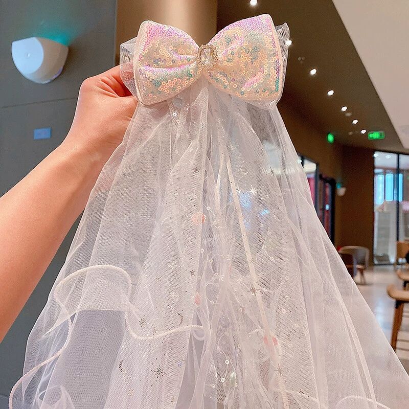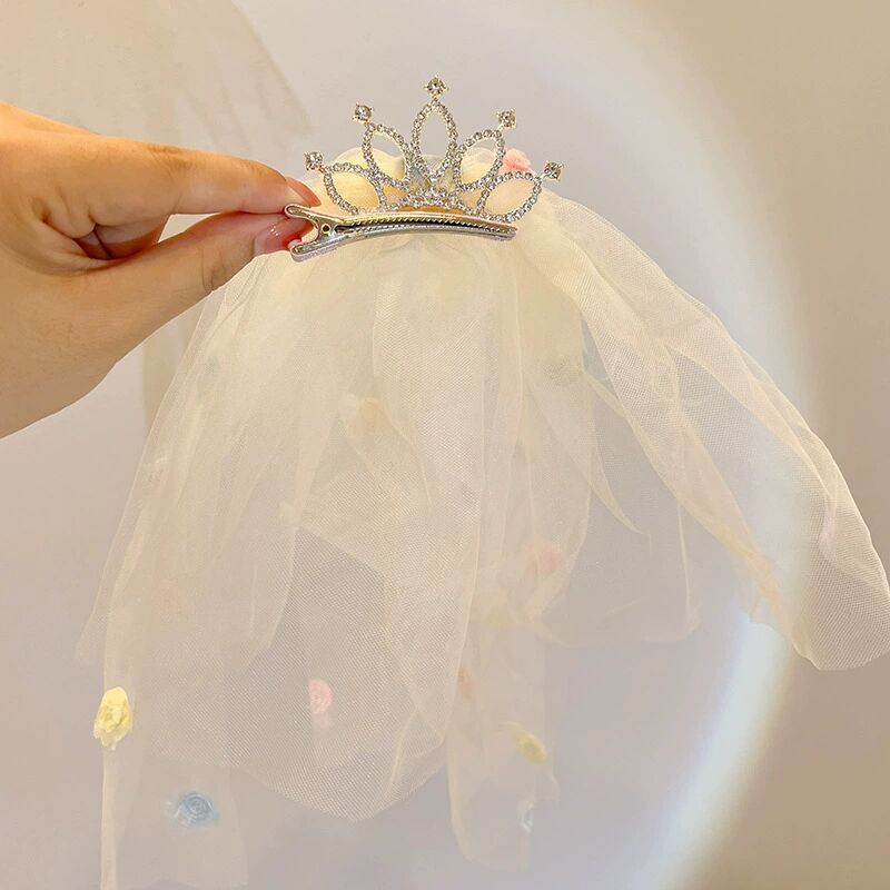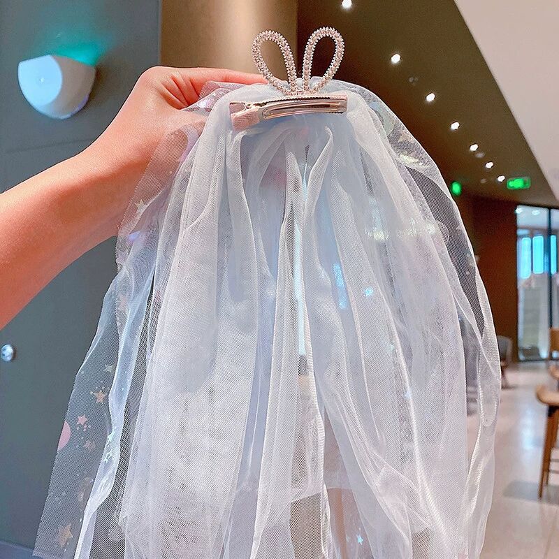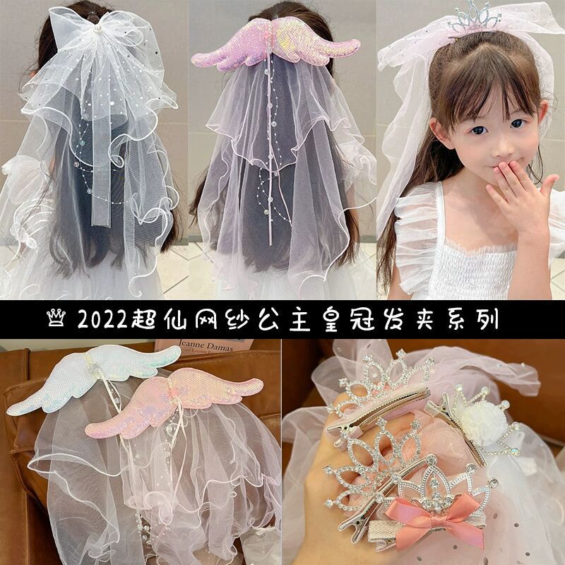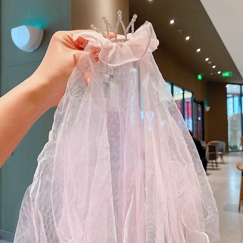 儿童超仙头纱女童公主皇冠头饰拍照道具发夹宝宝白色网纱女孩发卡