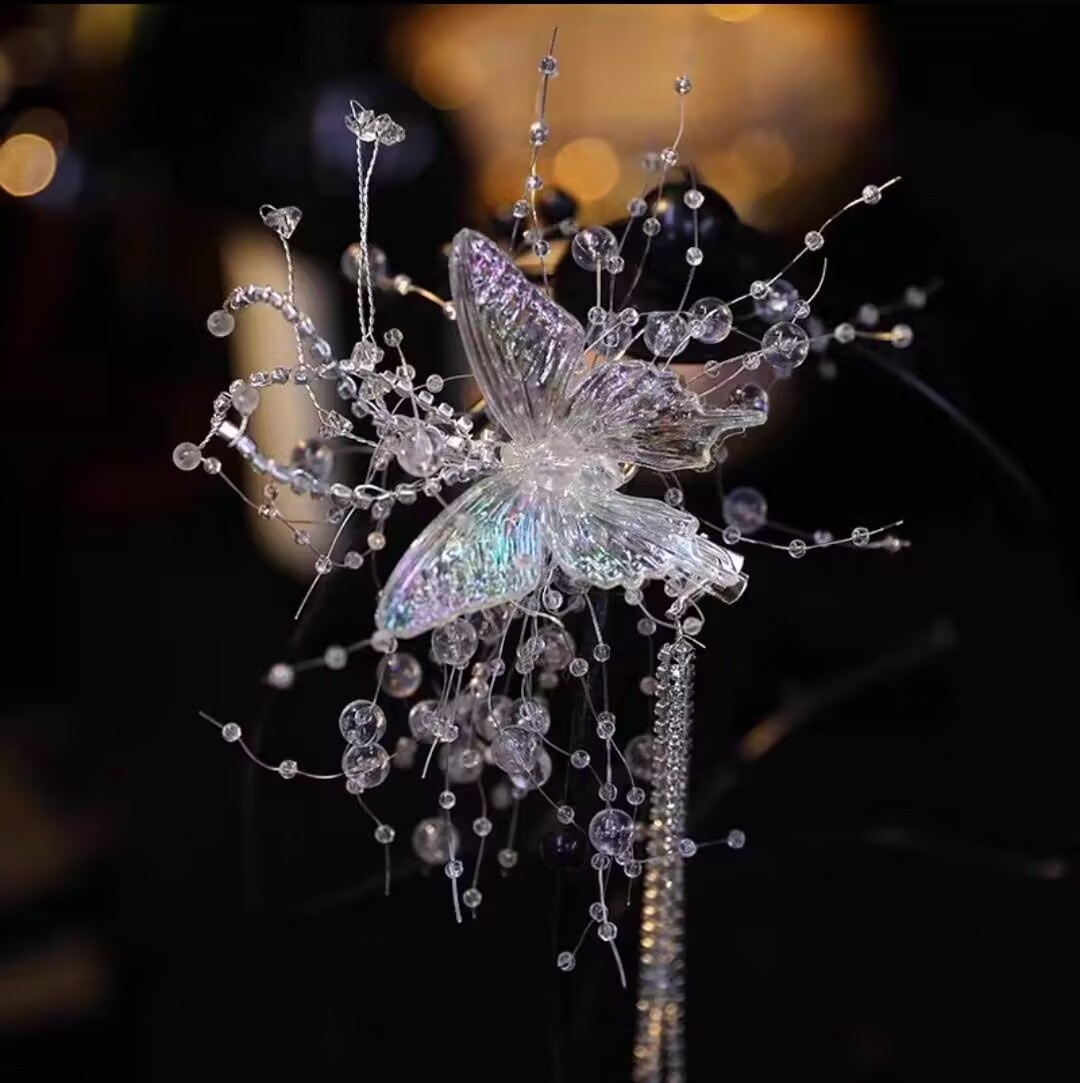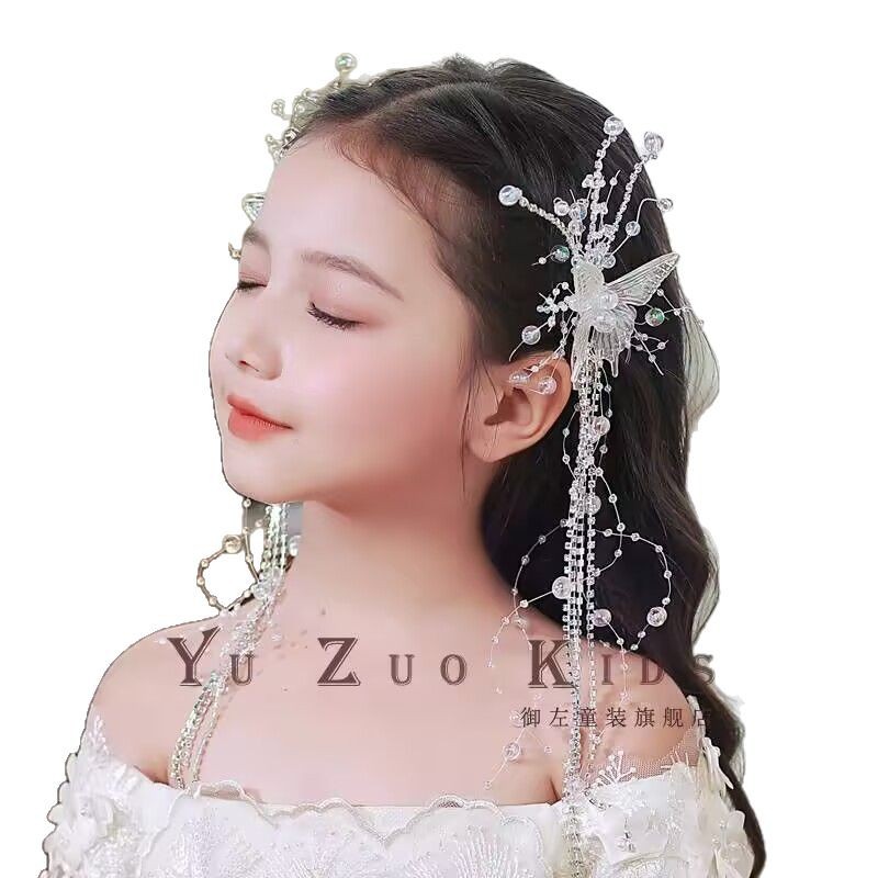 儿童头饰超仙水晶蝴蝶流苏侧边发夹女童礼服演出走秀舞蹈表演发饰