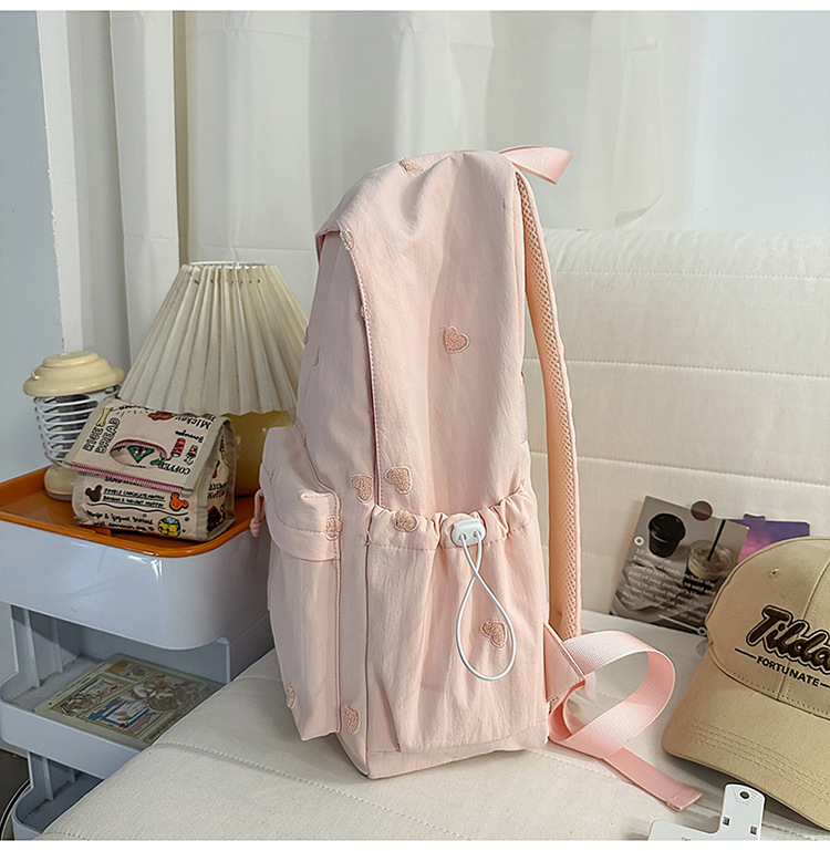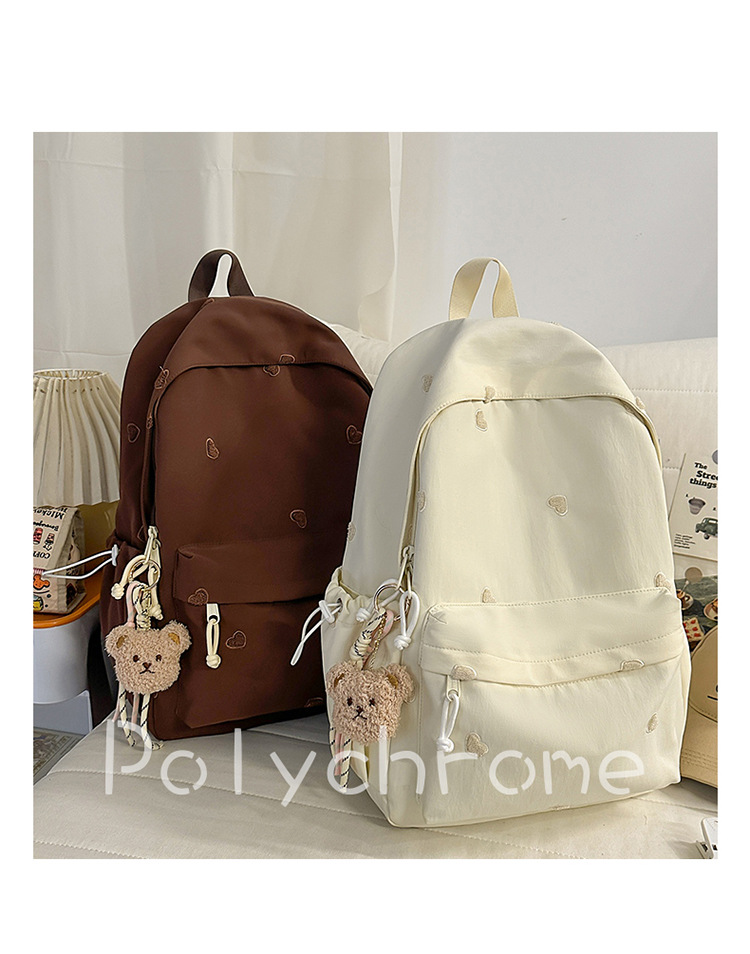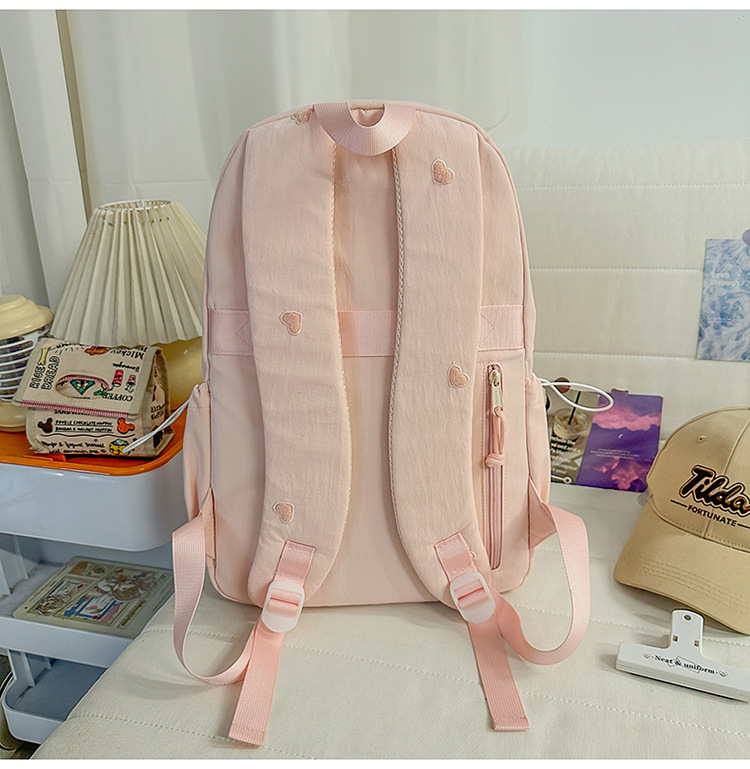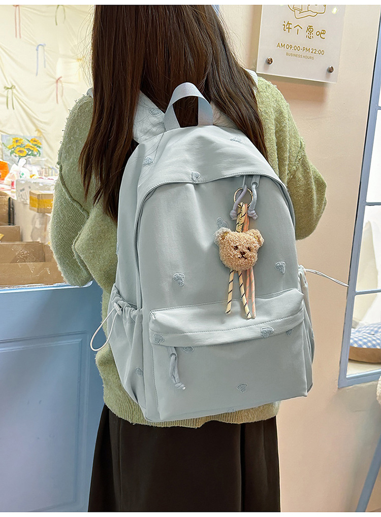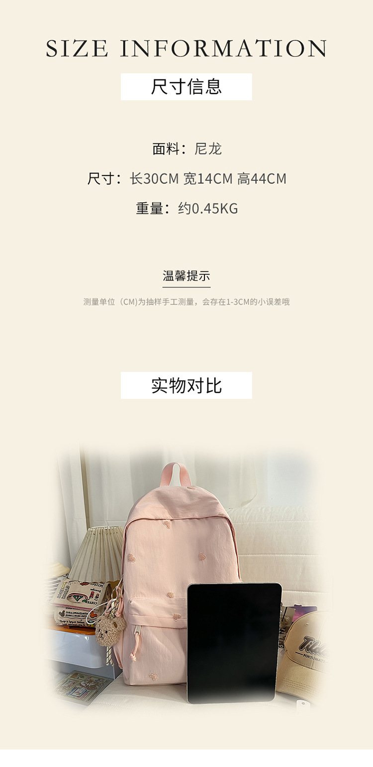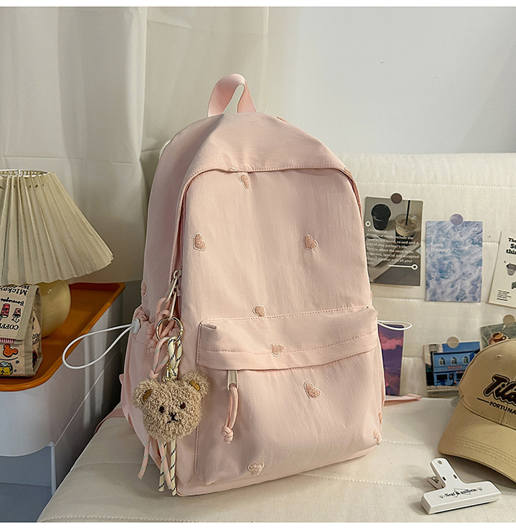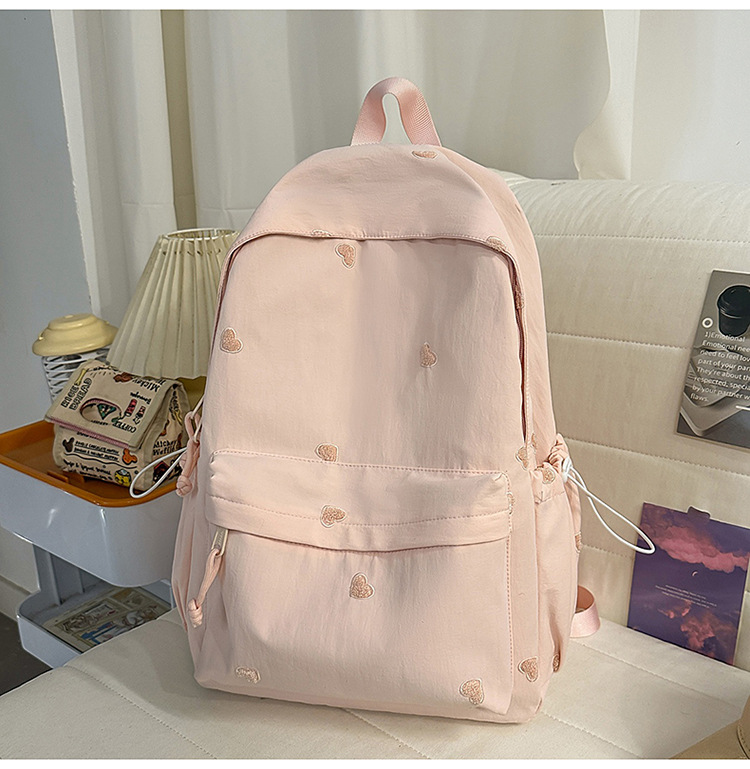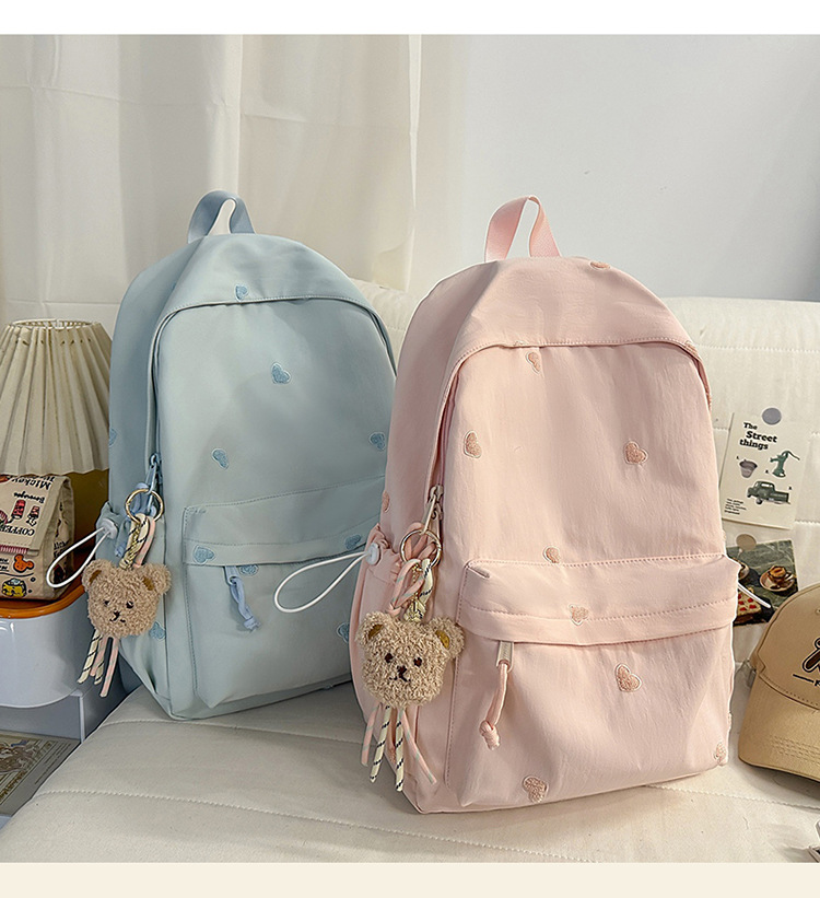 书包少女简约百搭双肩包大学生中学生爱心刺绣纯色补课包出游背包