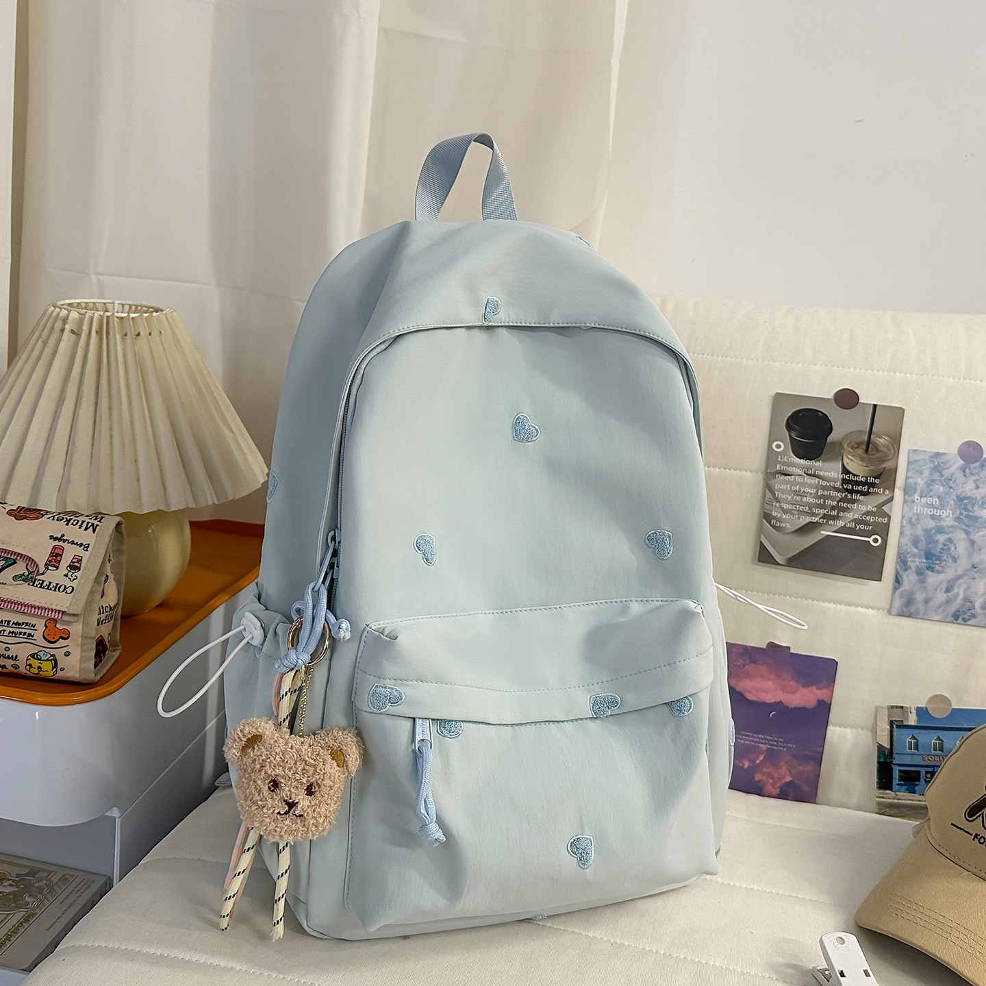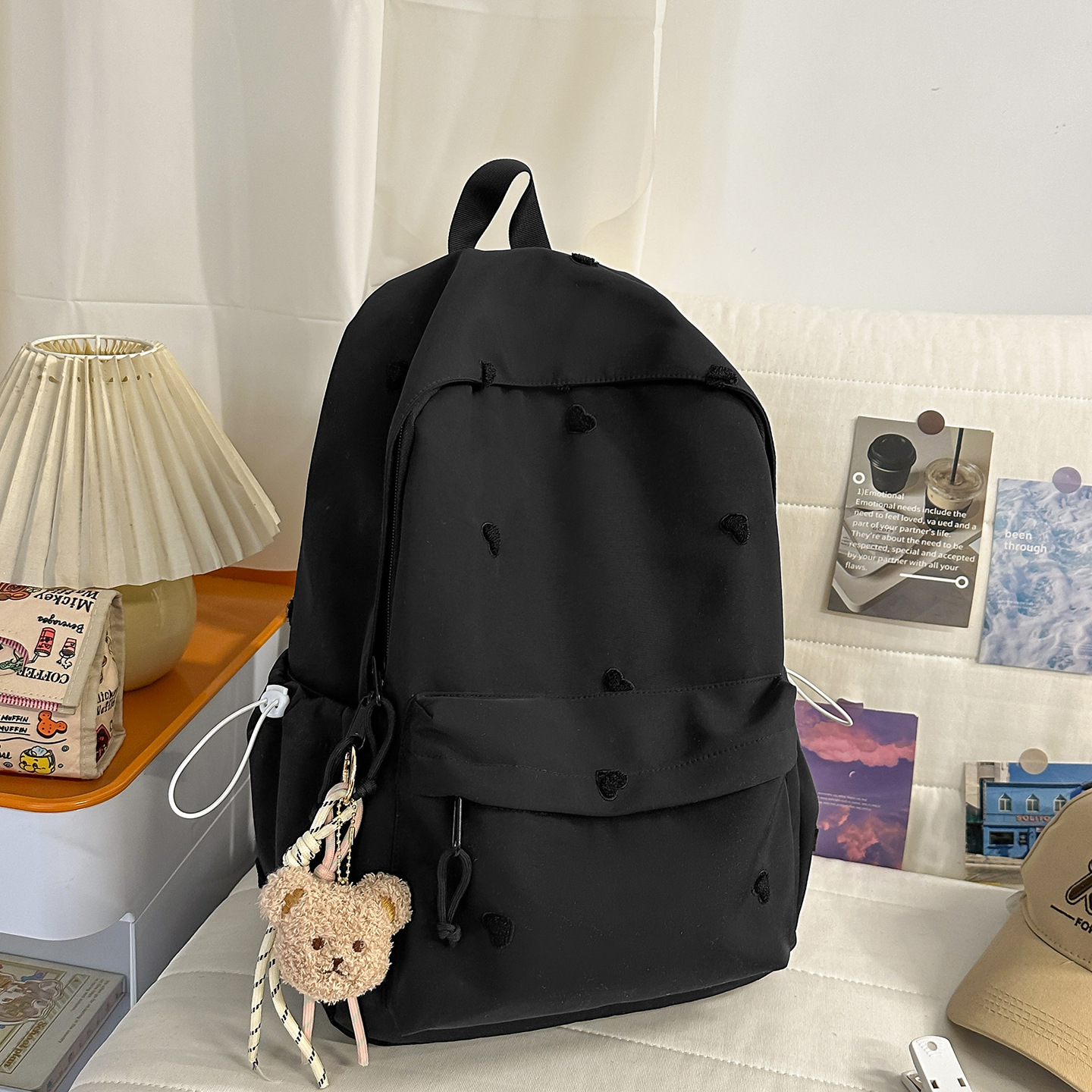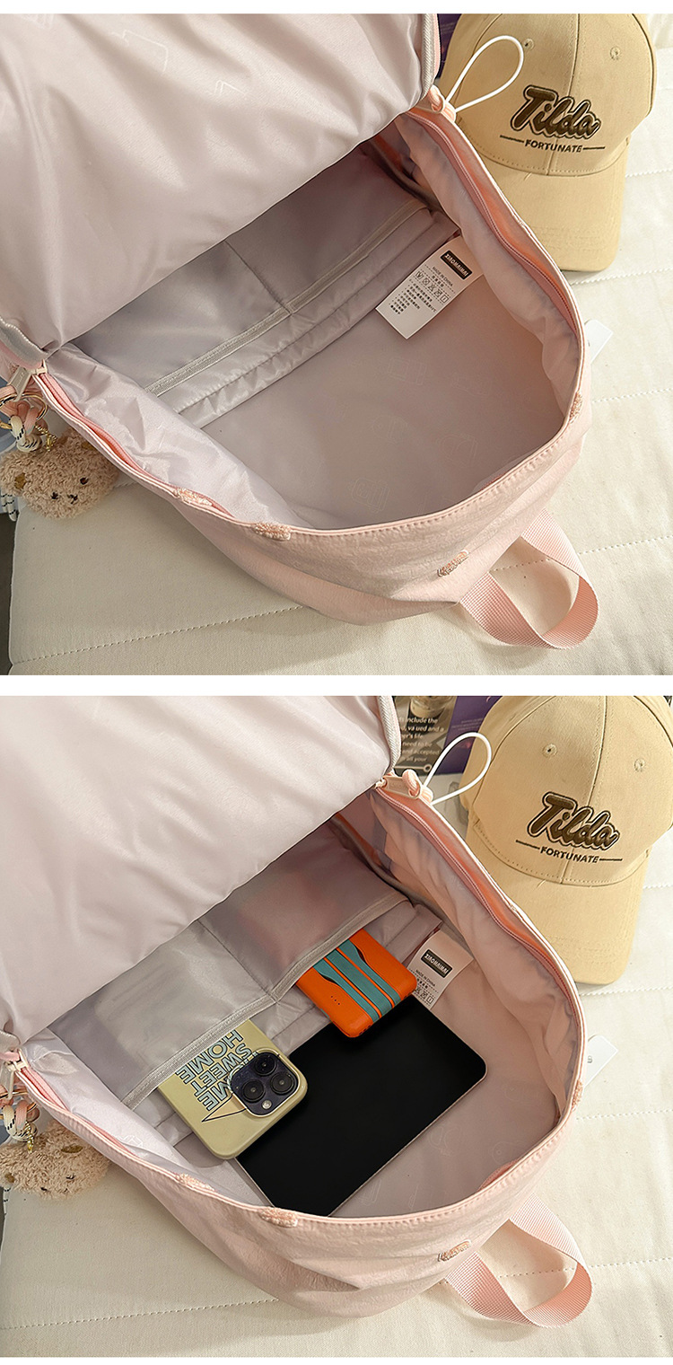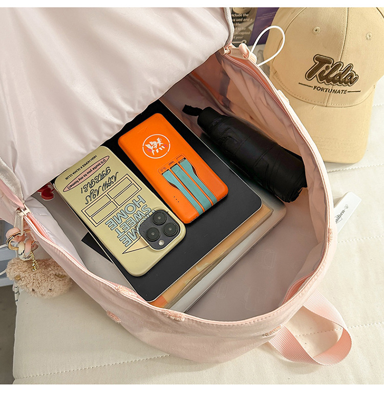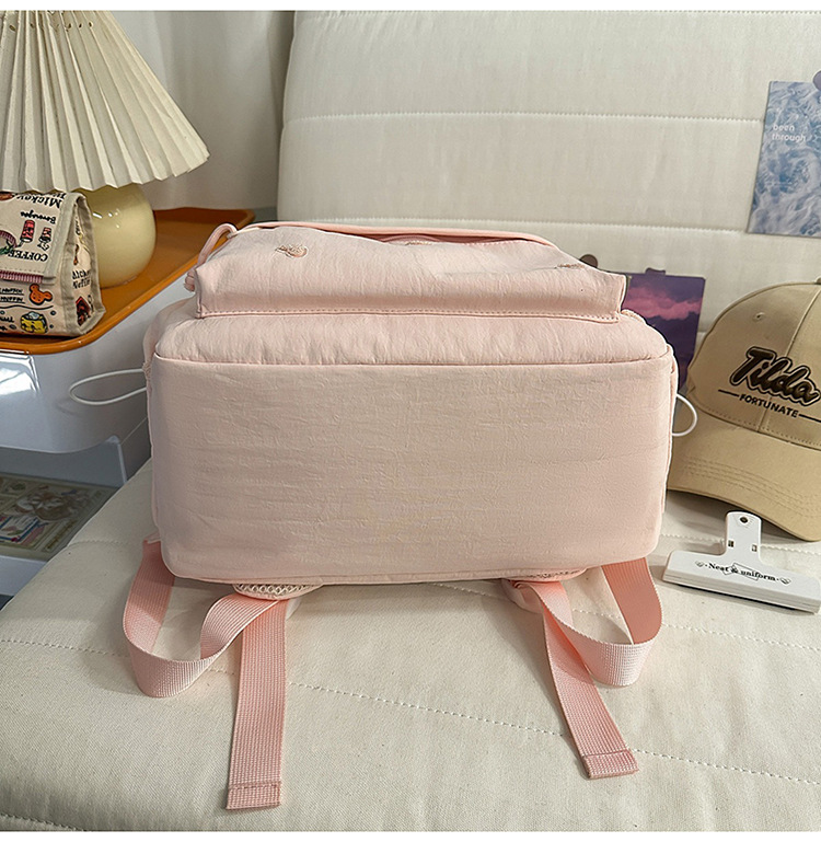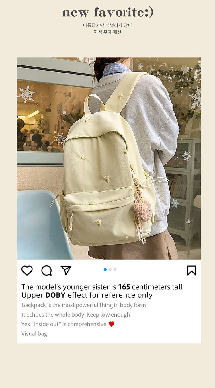 书包少女简约百搭双肩包大学生中学生爱心刺绣纯色补课包出游背包