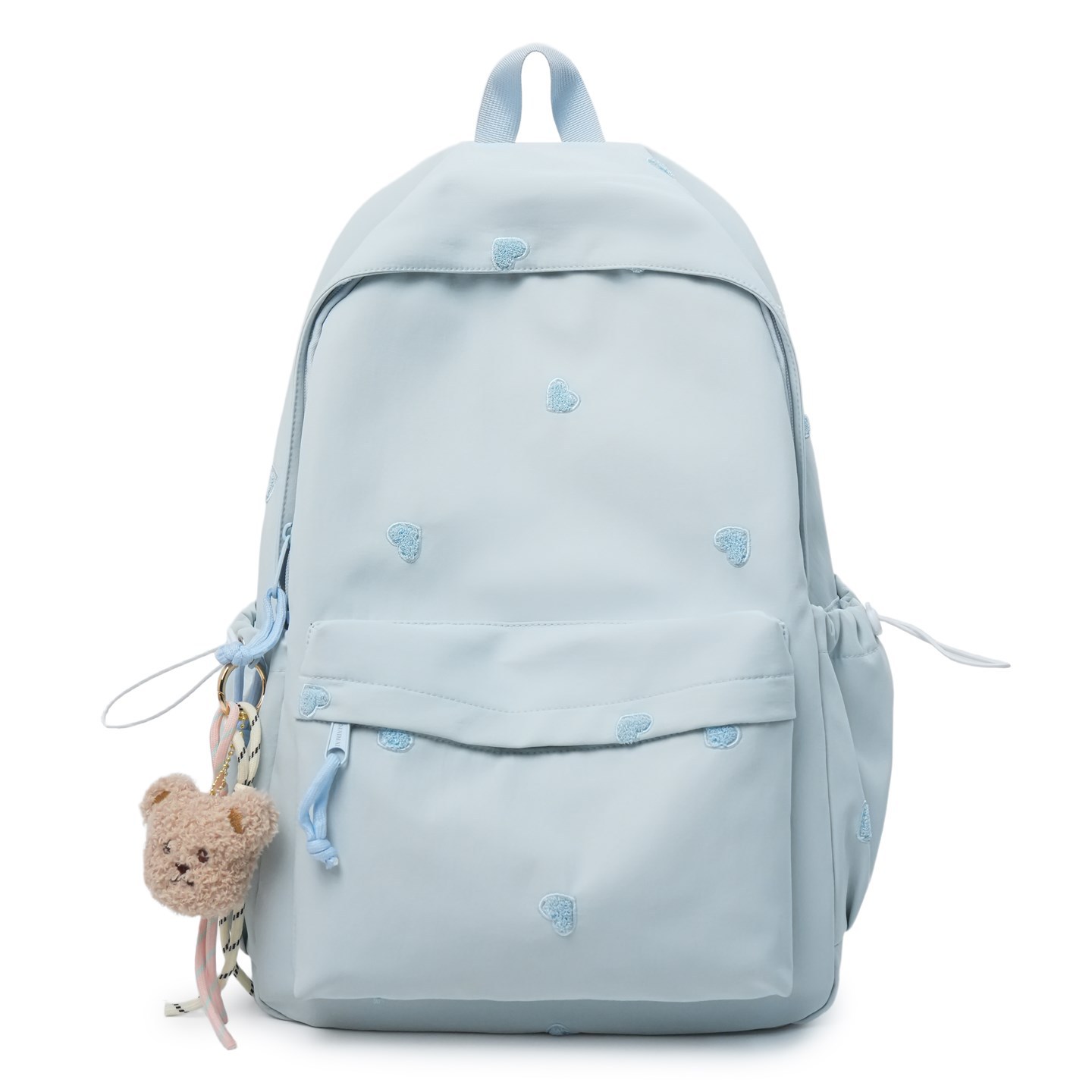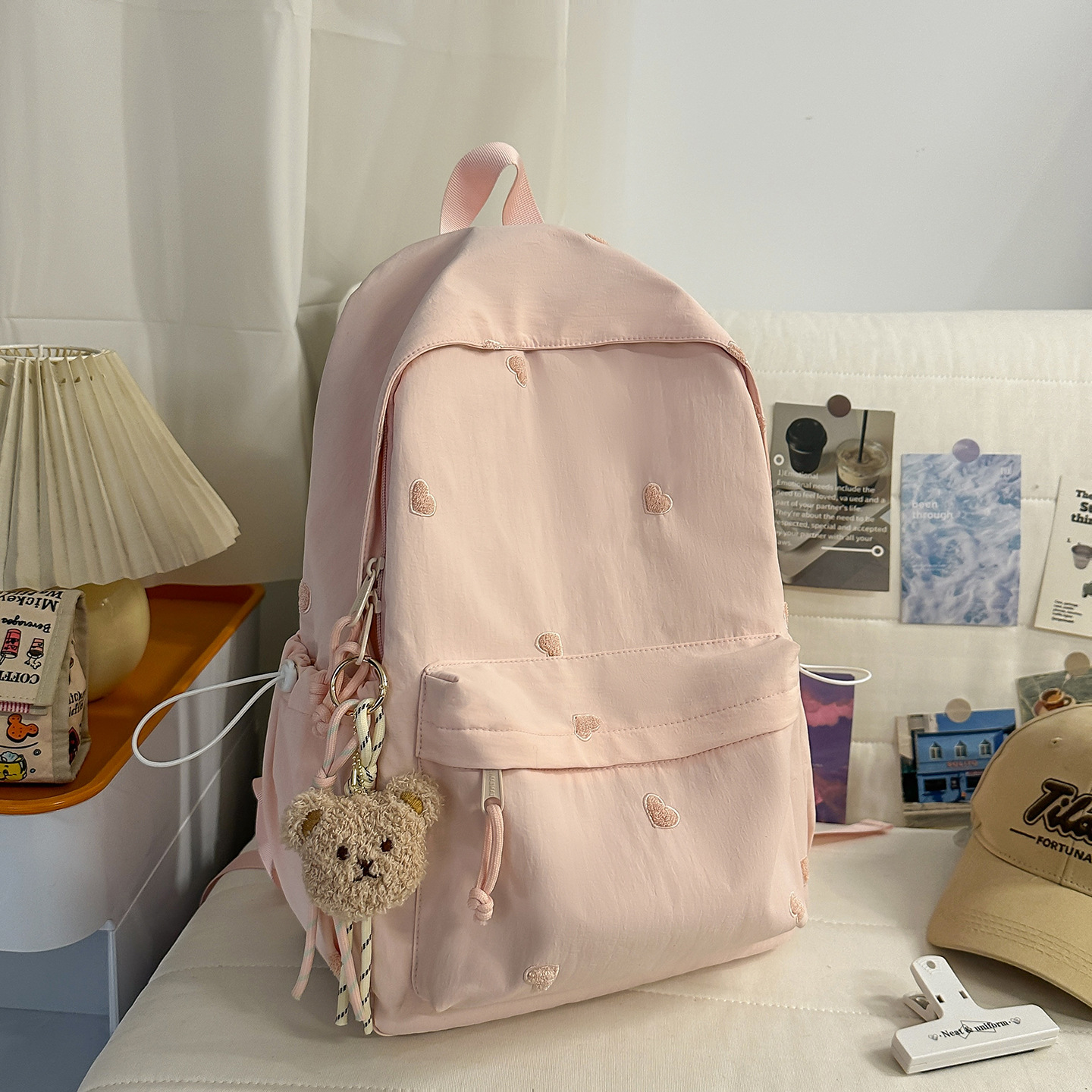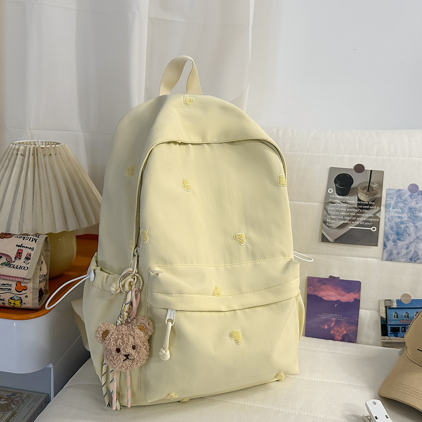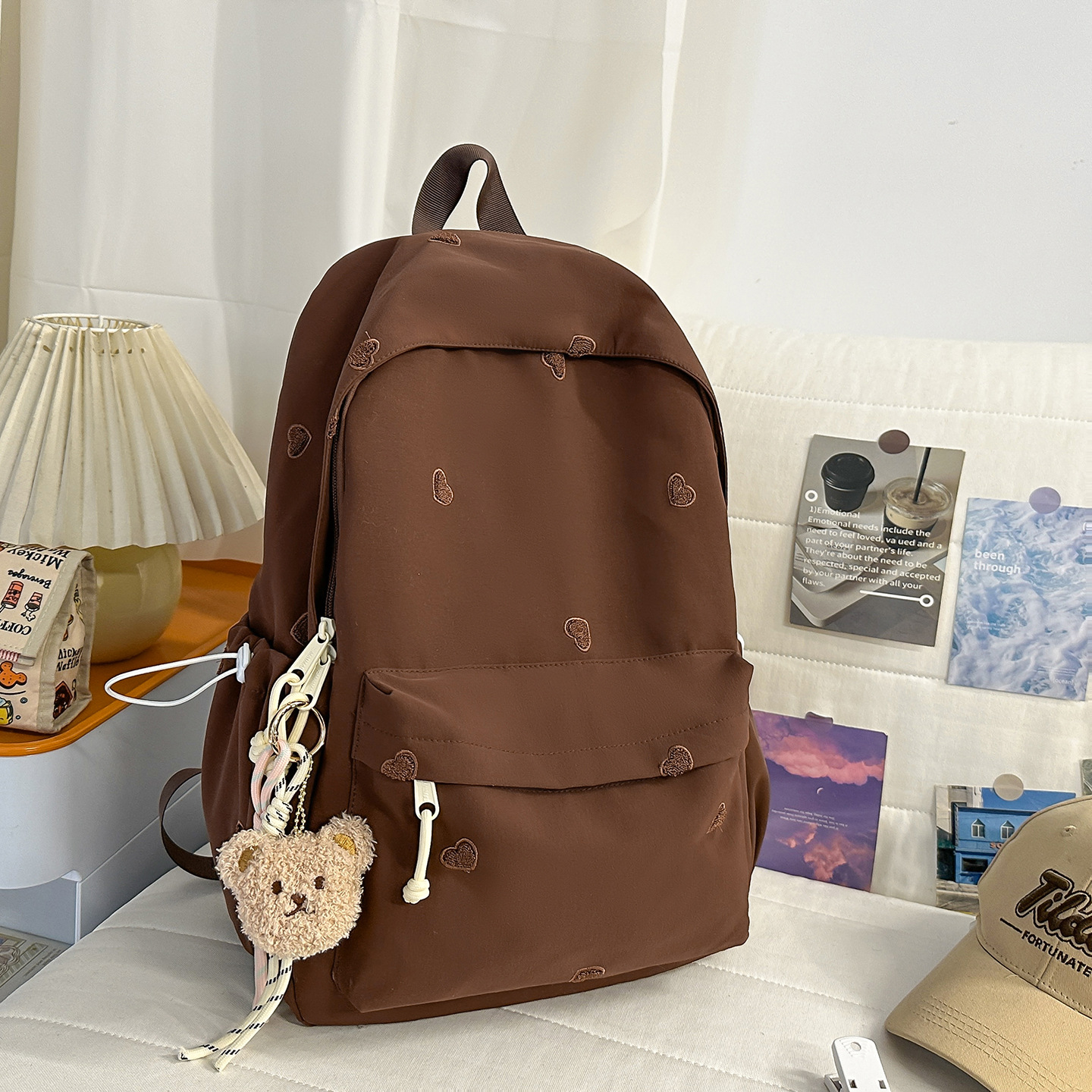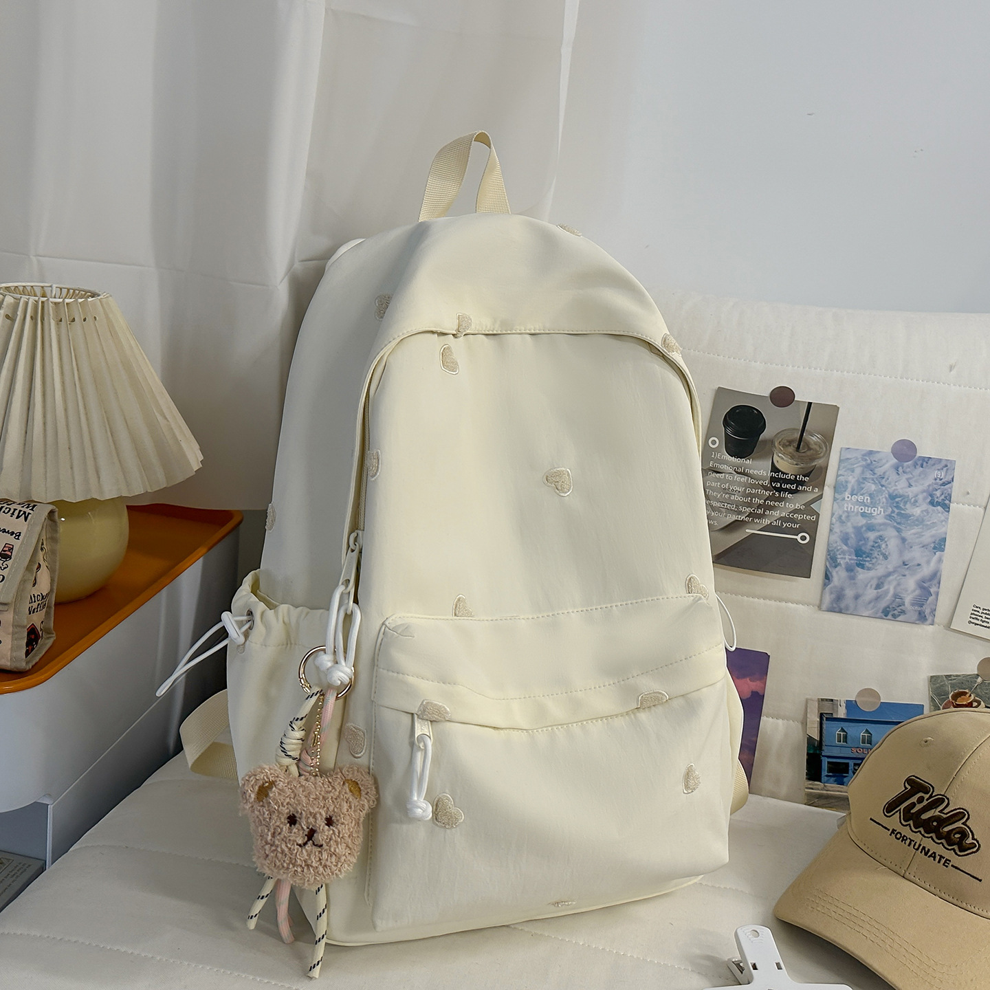 书包少女简约百搭双肩包大学生中学生爱心刺绣纯色补课包出游背包