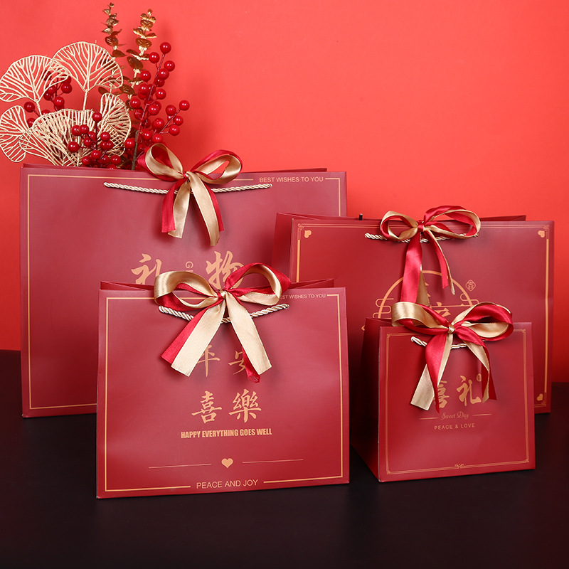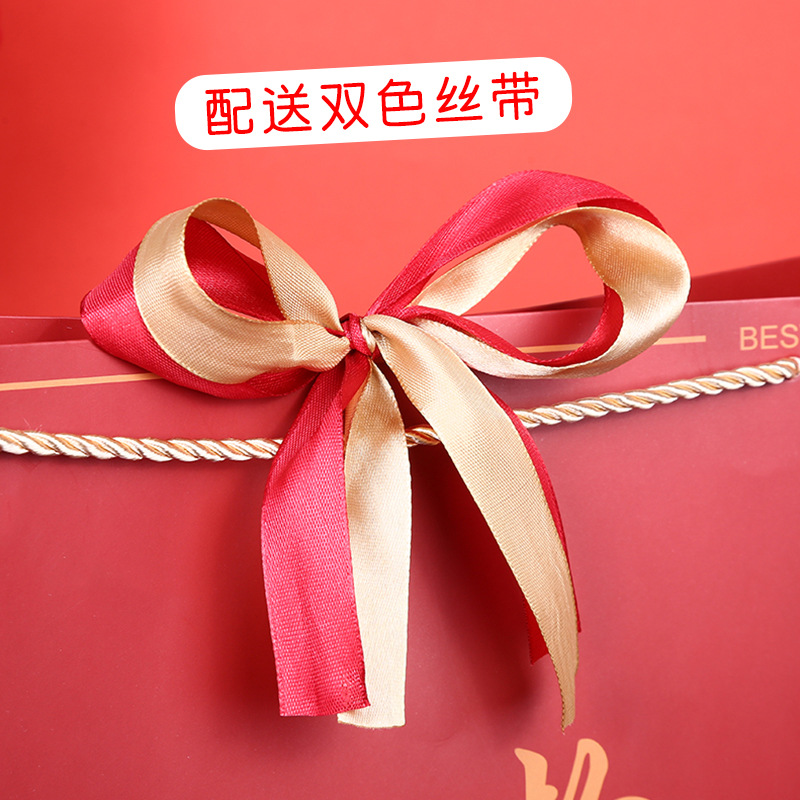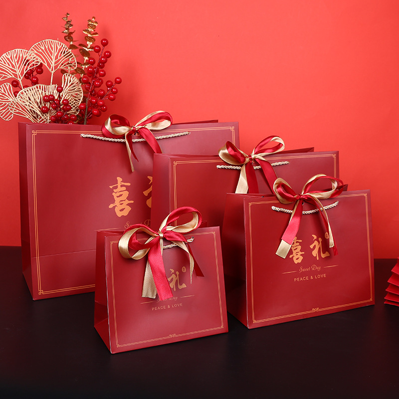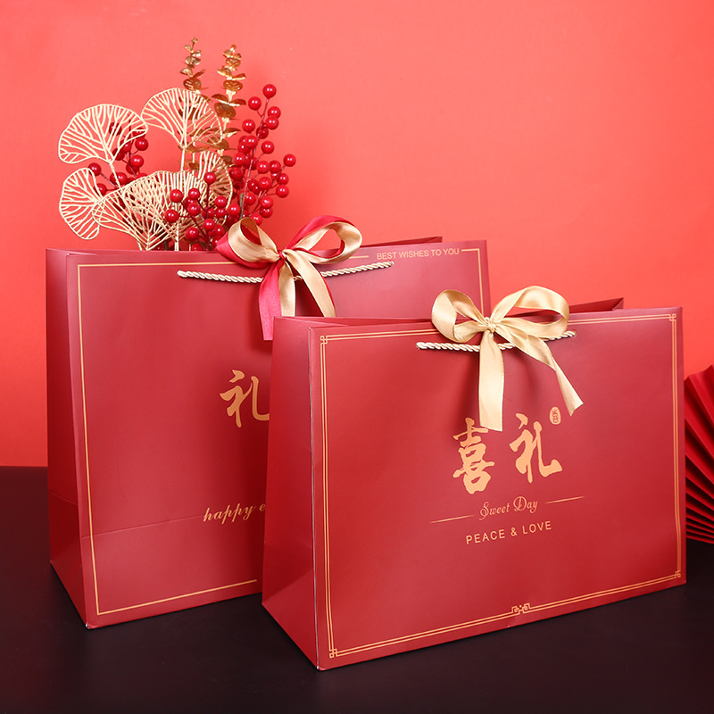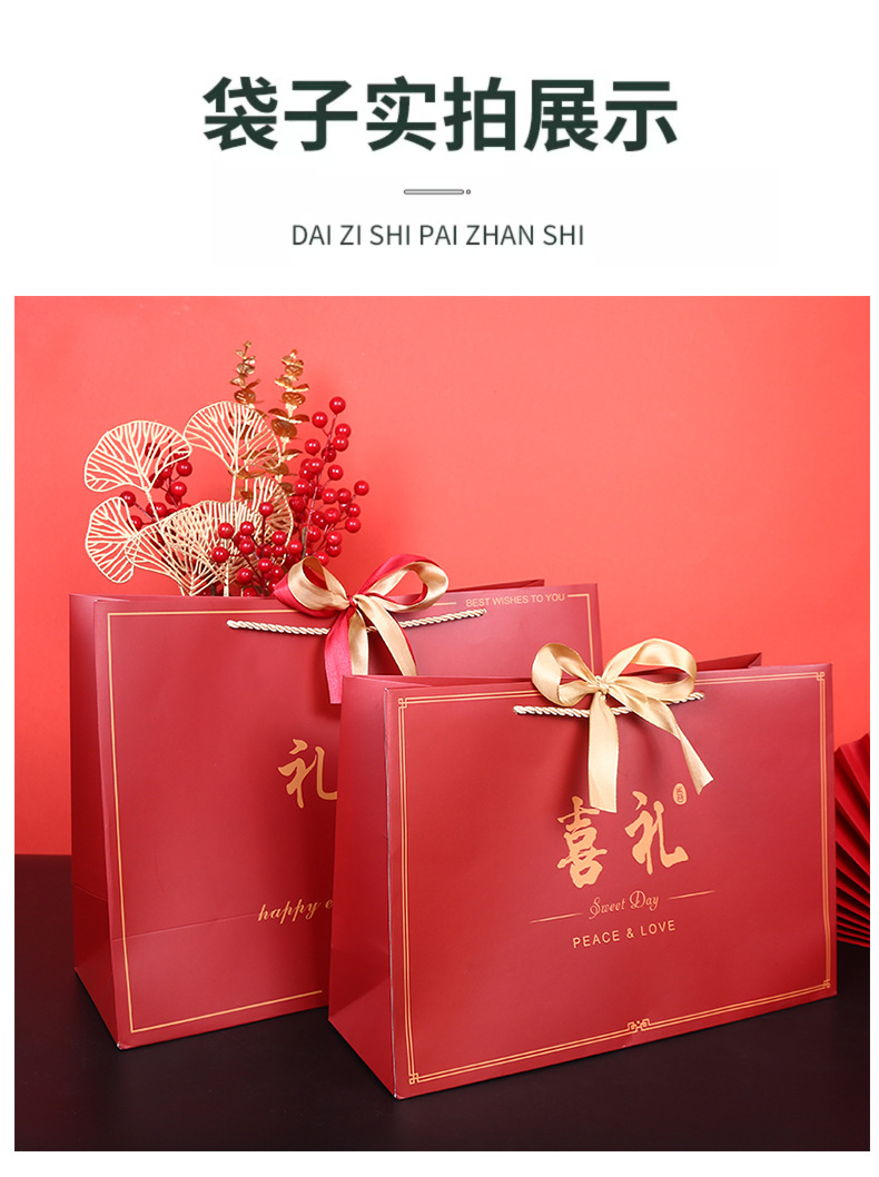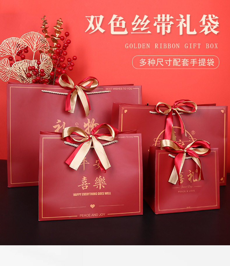 中国风礼物袋喜庆大红色纸袋结婚回礼袋生日手提袋双色丝带礼品袋