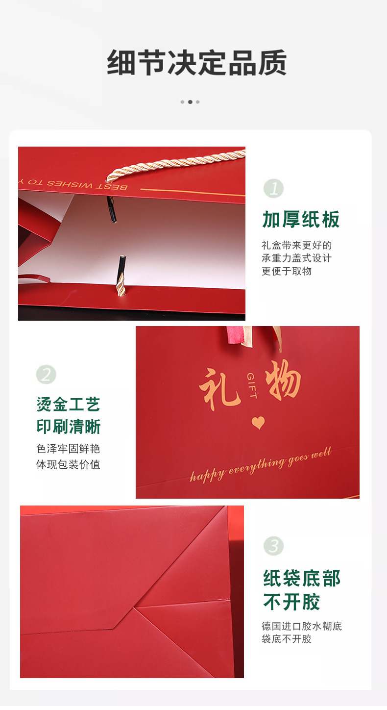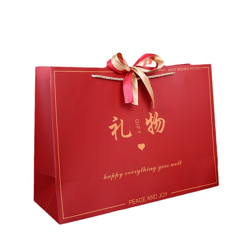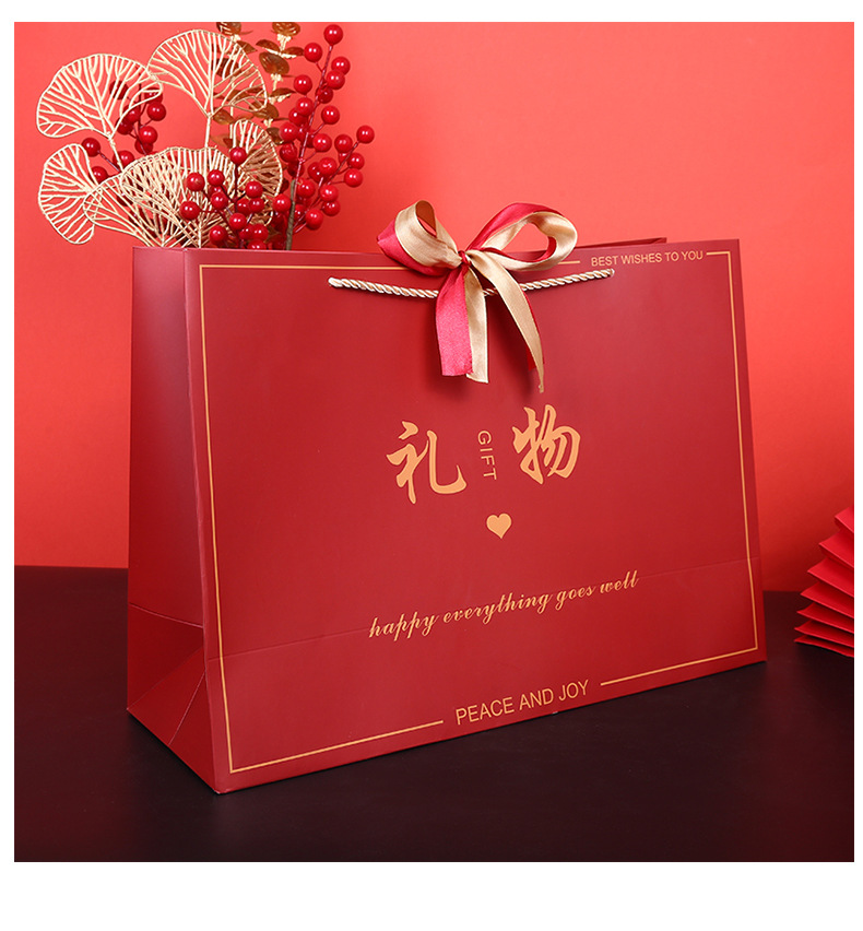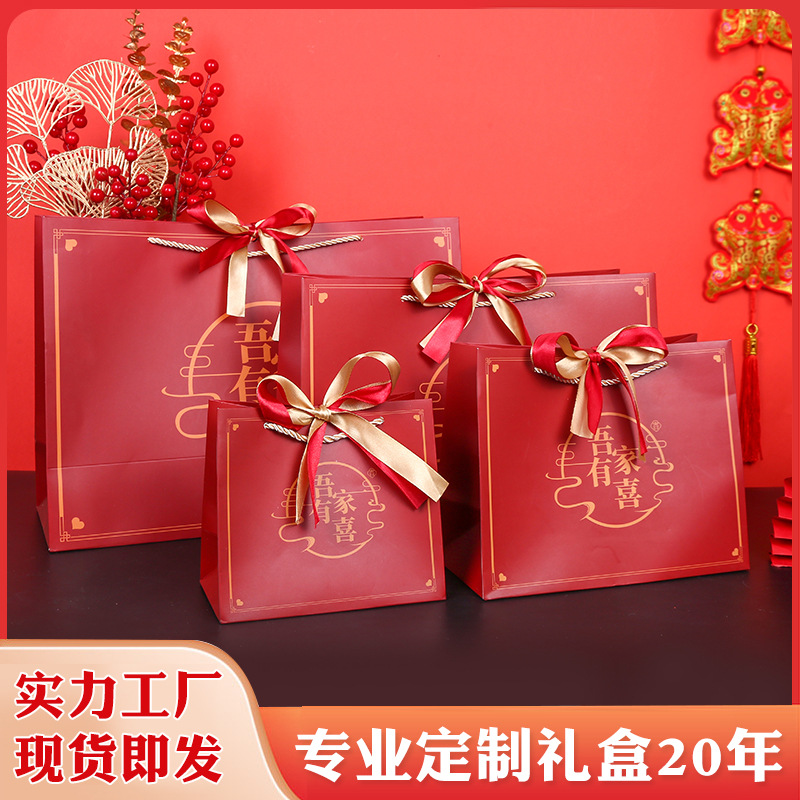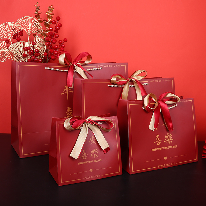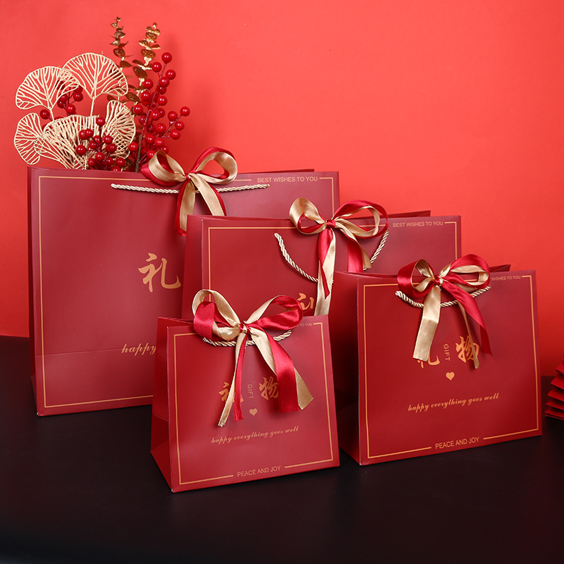 中国风礼物袋喜庆大红色纸袋结婚回礼袋生日手提袋双色丝带礼品袋