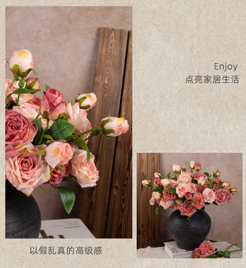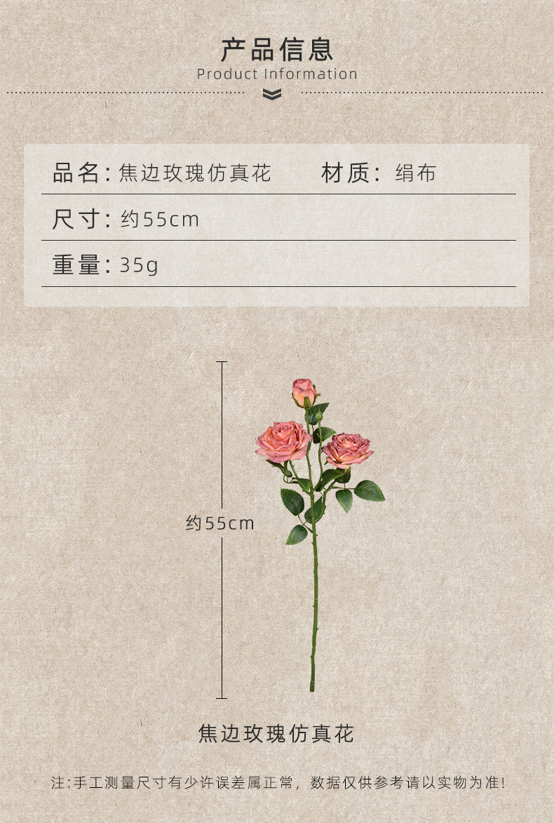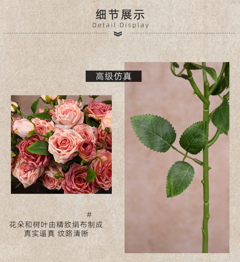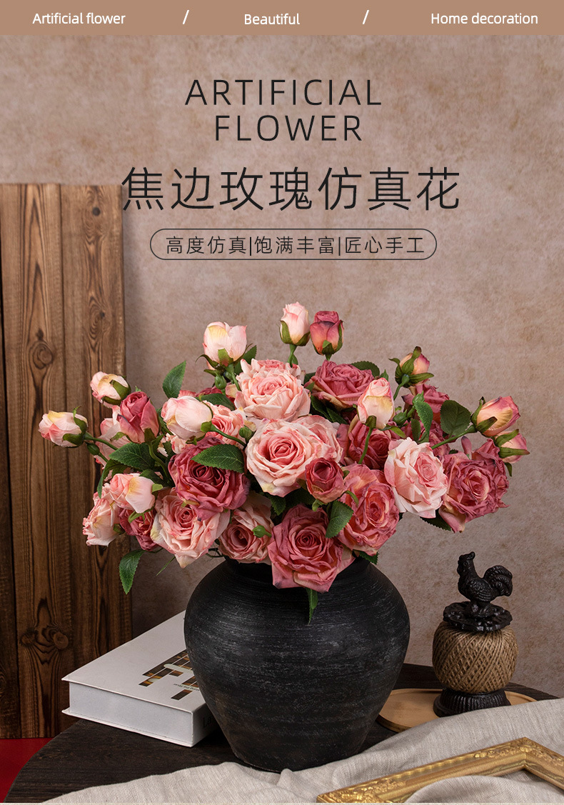 法式仿真花单枝3头焦边玫瑰复古 家居客厅装饰假花干花花束高级感