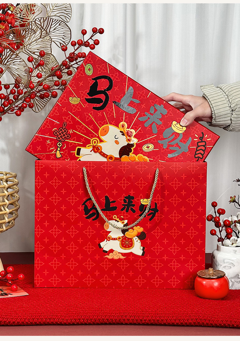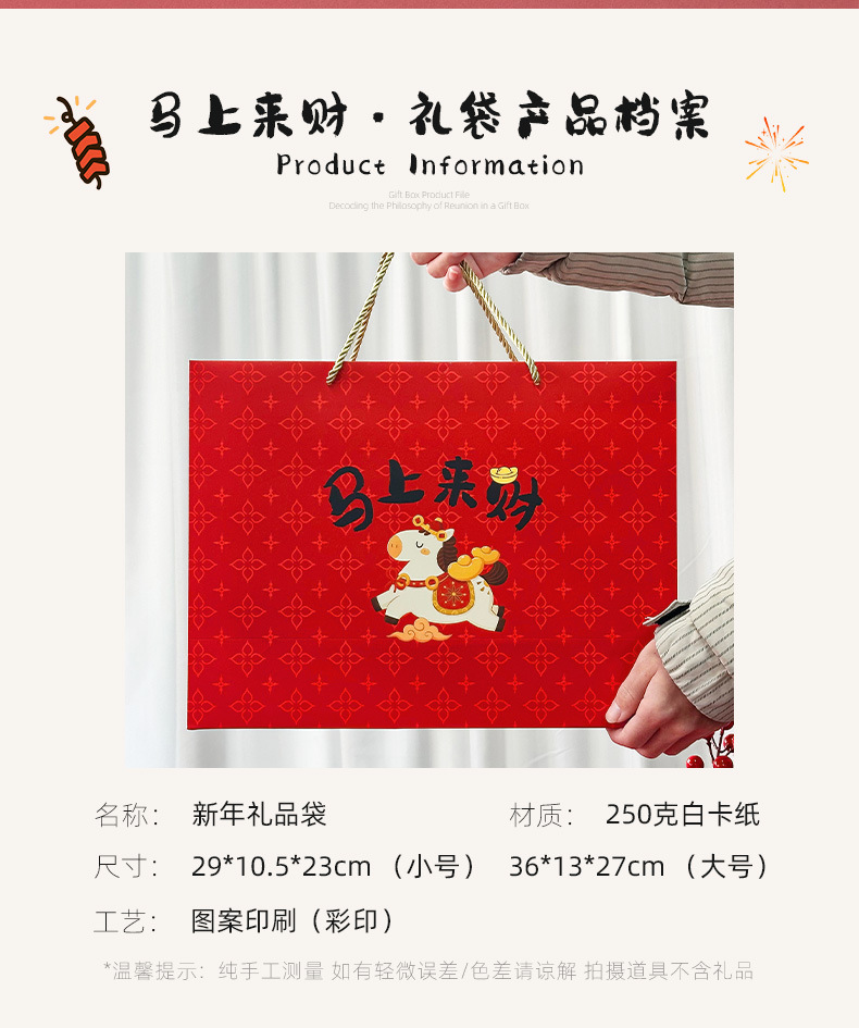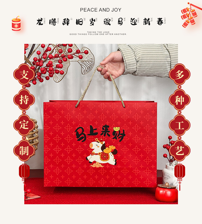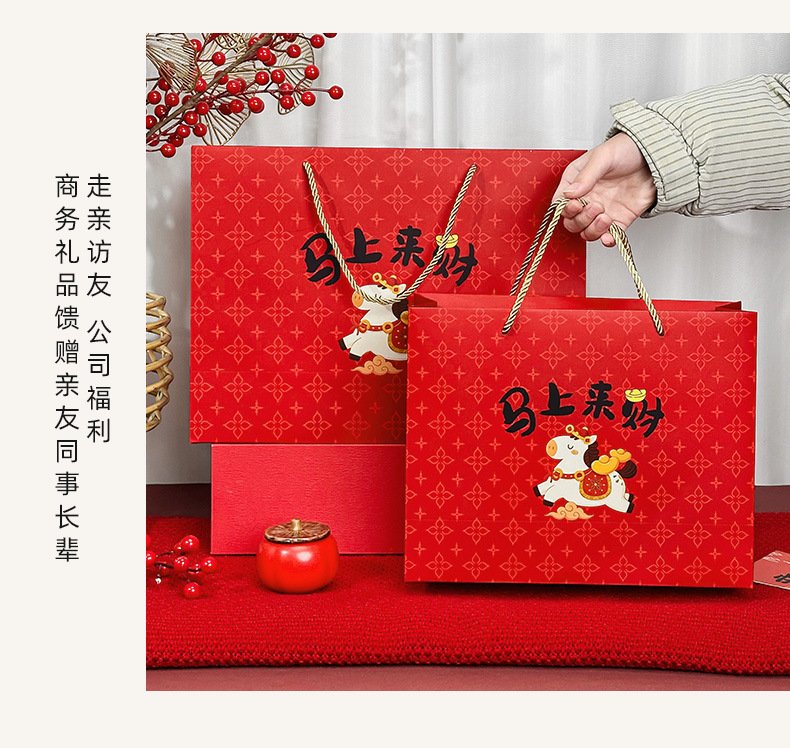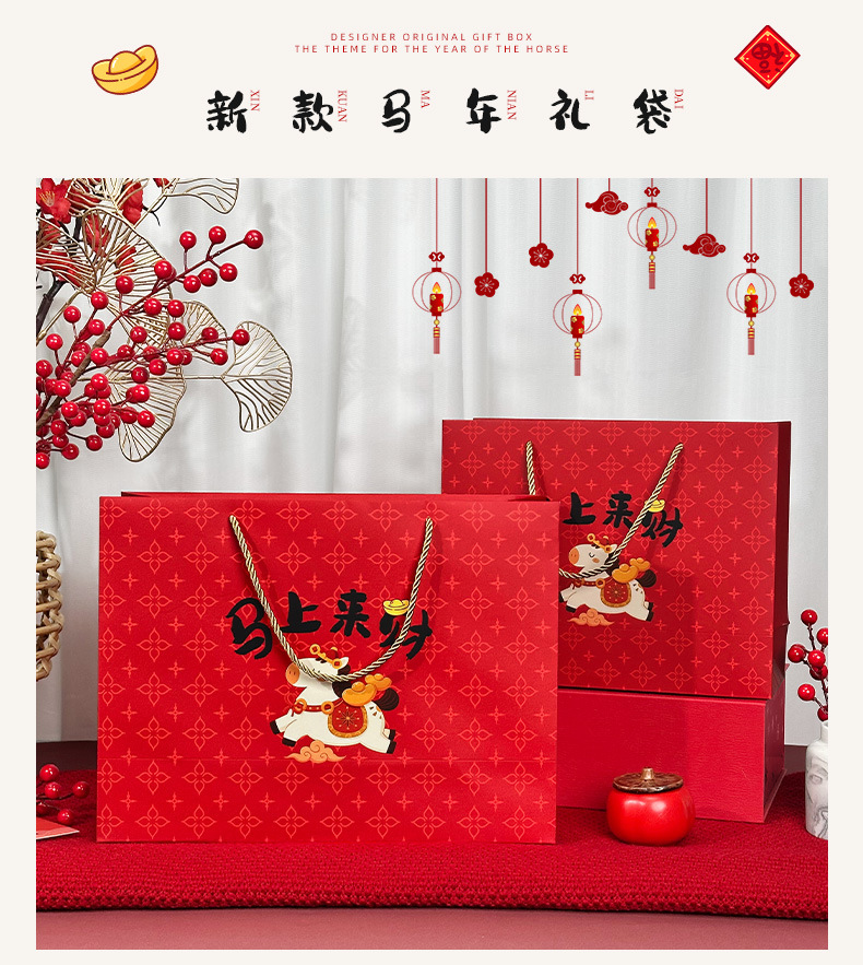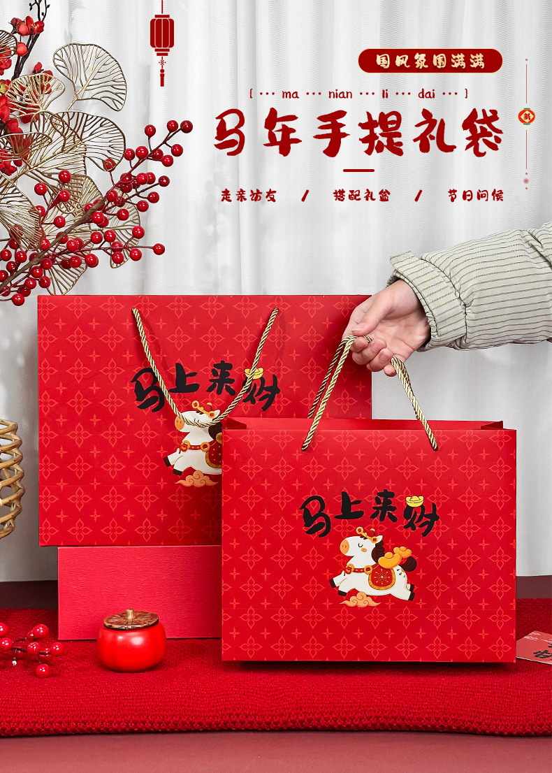 春节迎新礼品包装袋2026马年马上来财卡通礼袋创意新年白卡手提袋