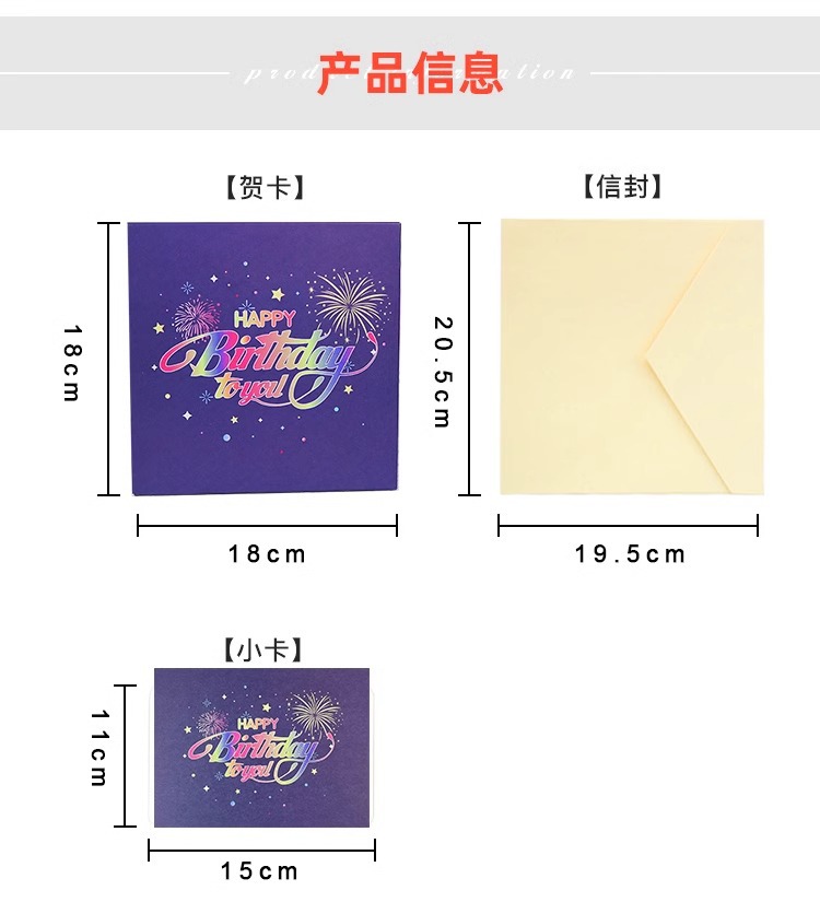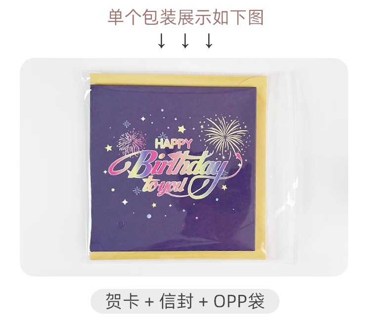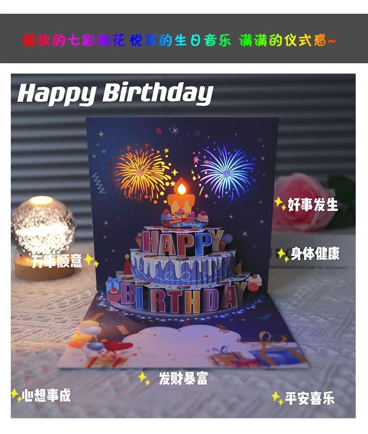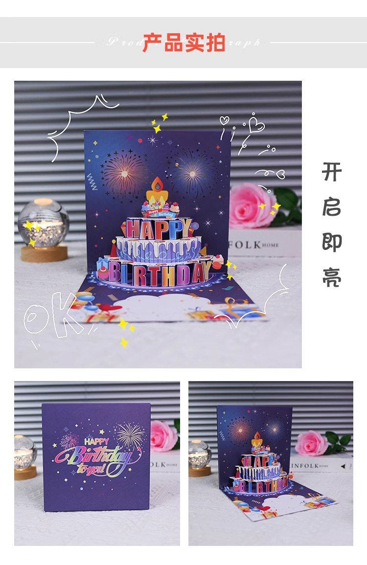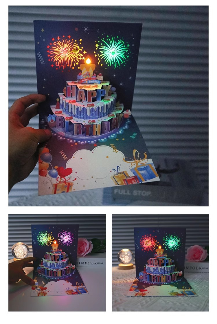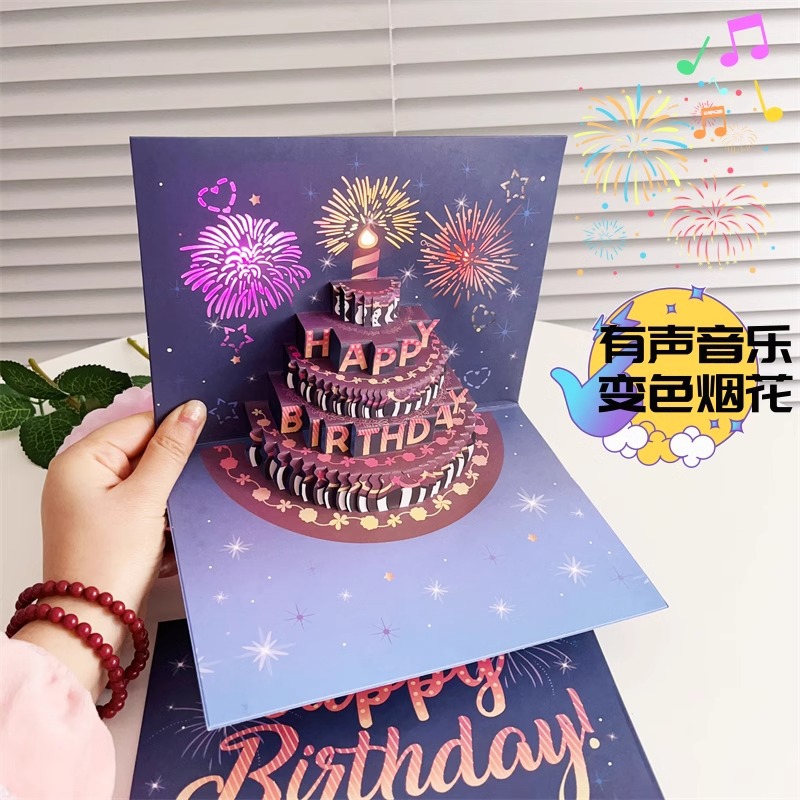 ins风生日蛋糕音乐灯光3D立体贺卡高端创意礼花效果有声卡片跨境