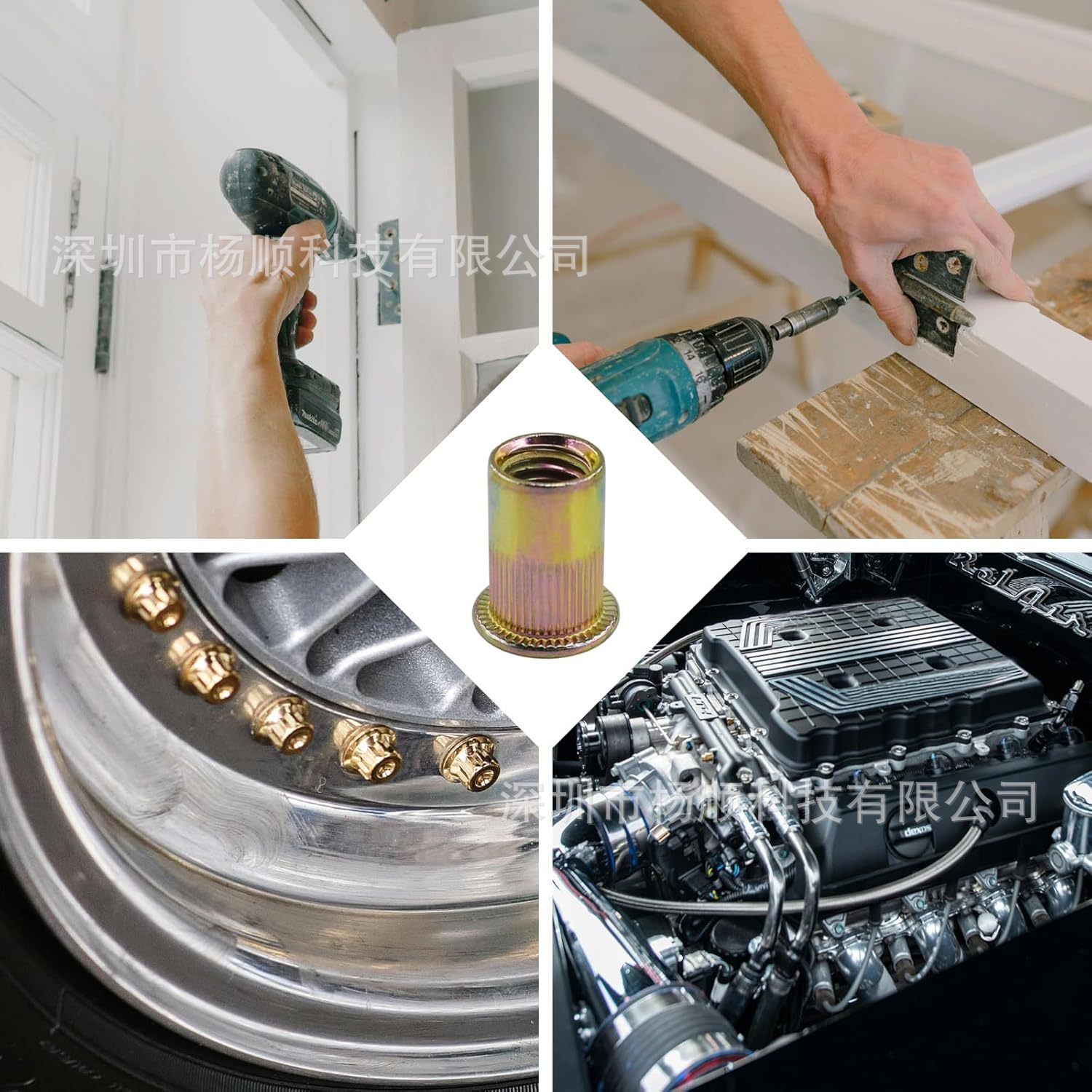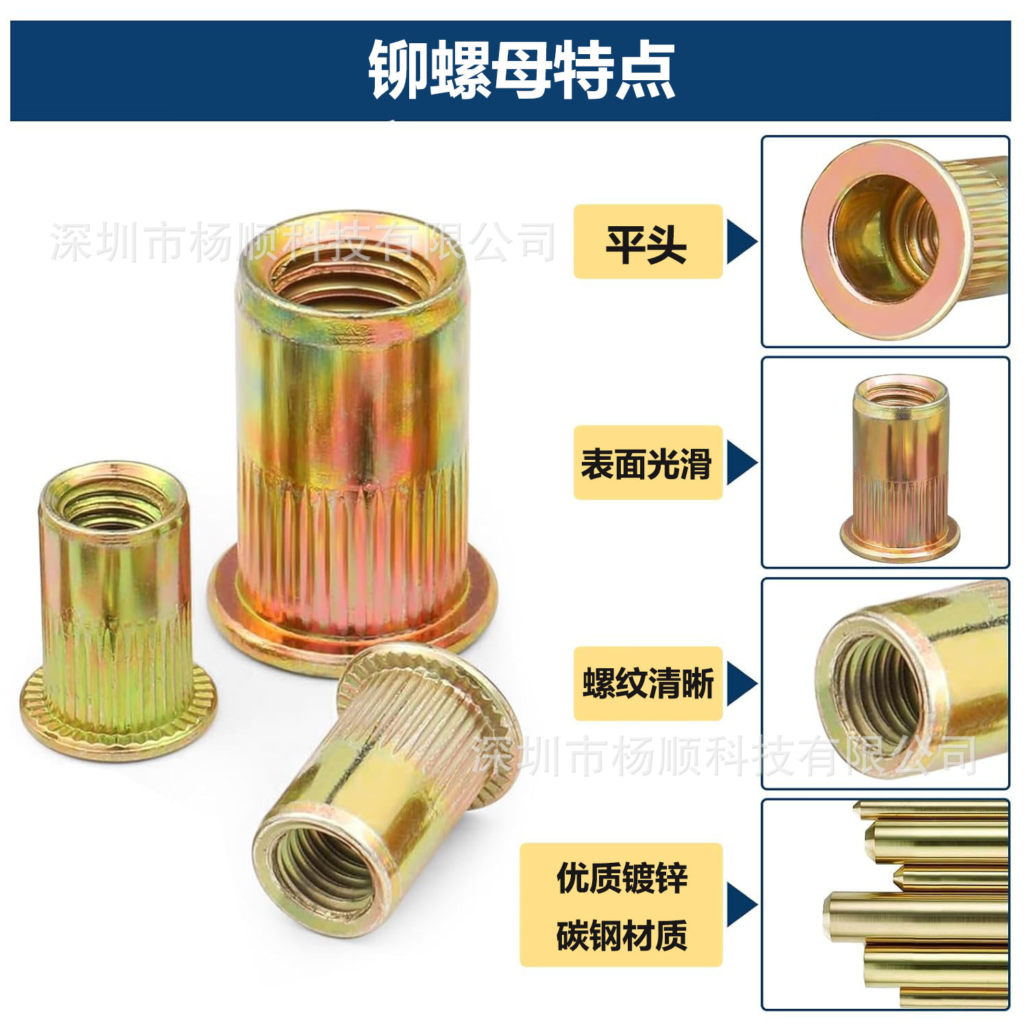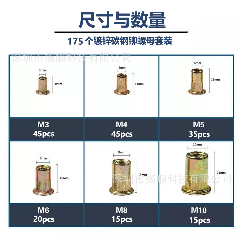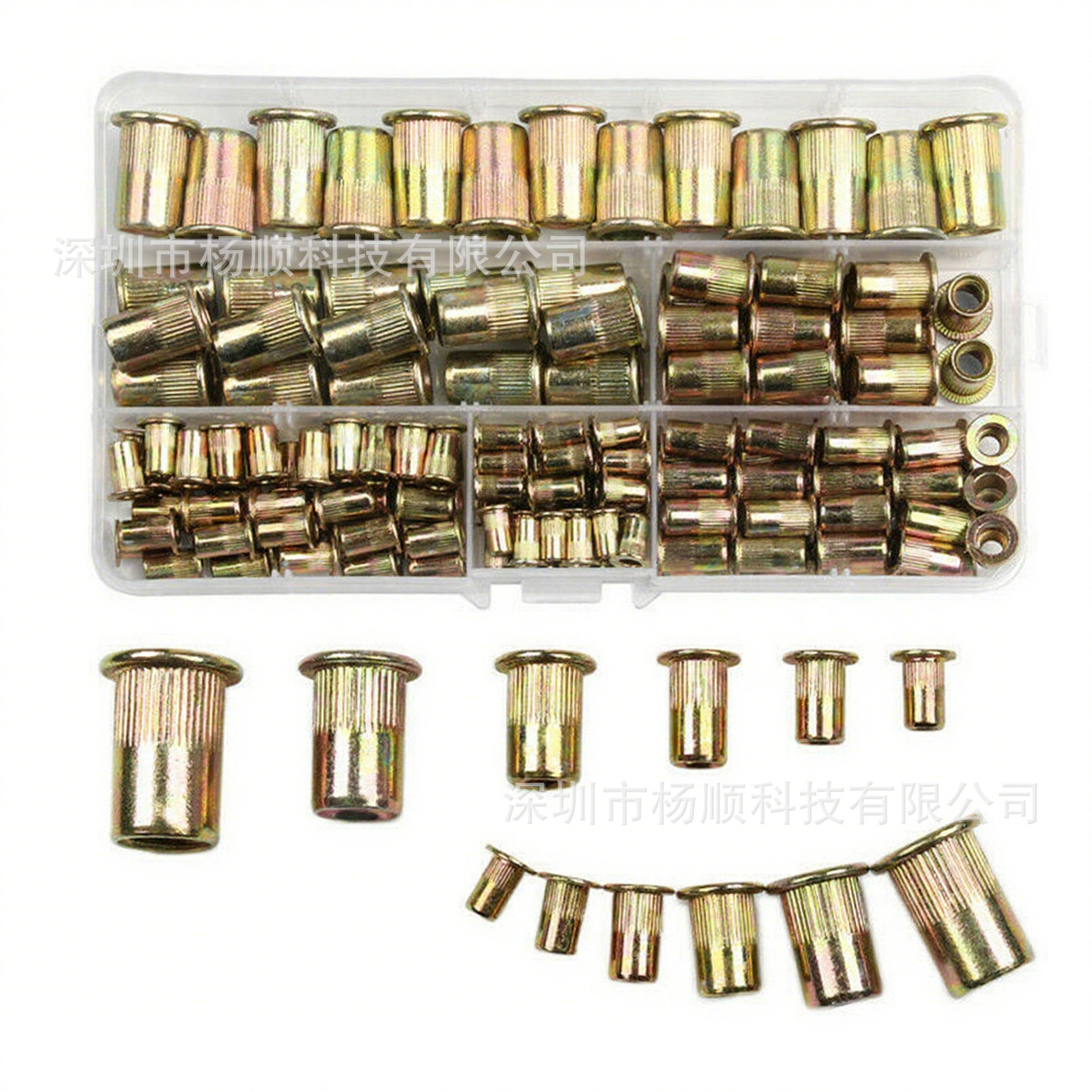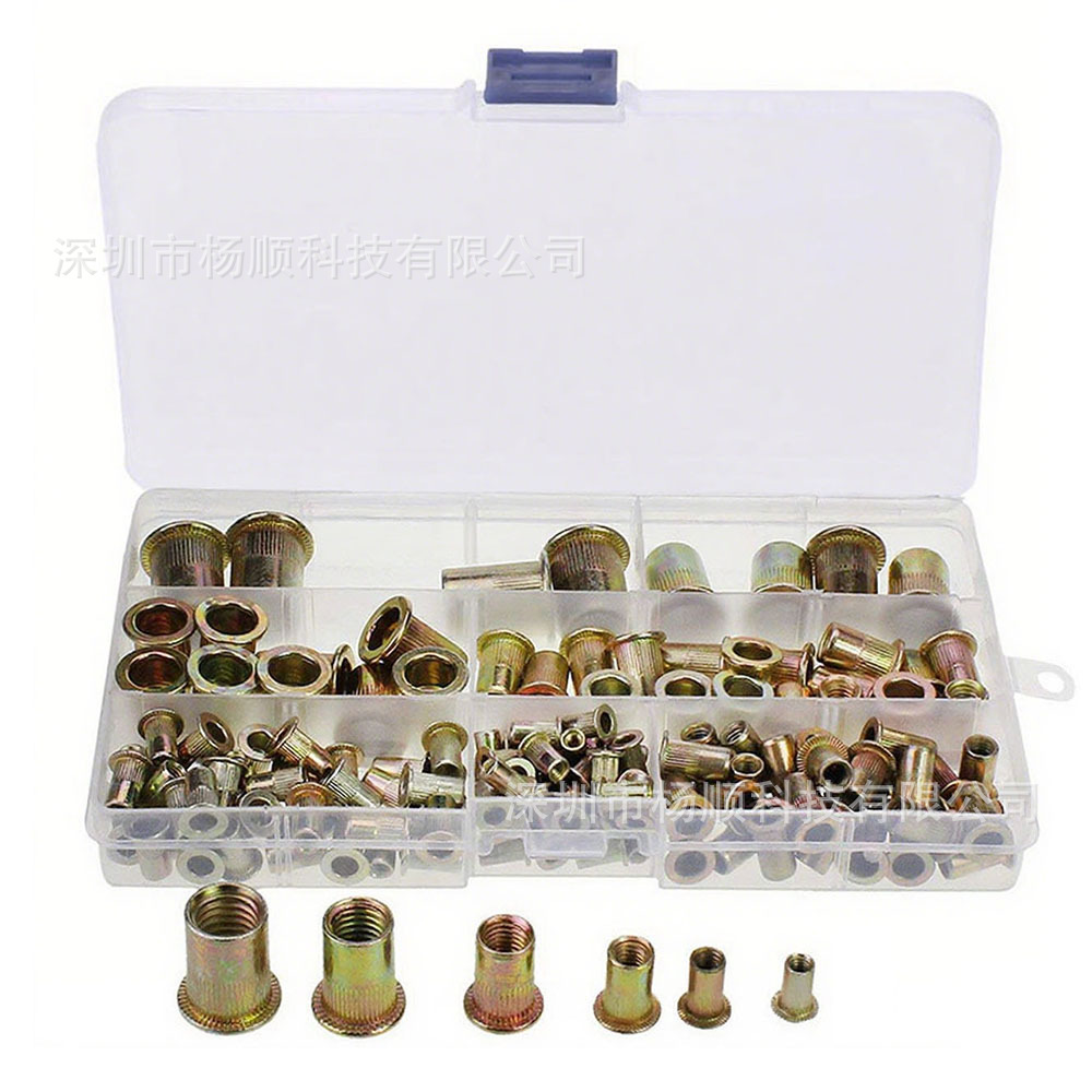 跨境175pcs盒装平头竖纹螺帽柳钉碳钢彩锌拉铆螺母M3-M10组合套装