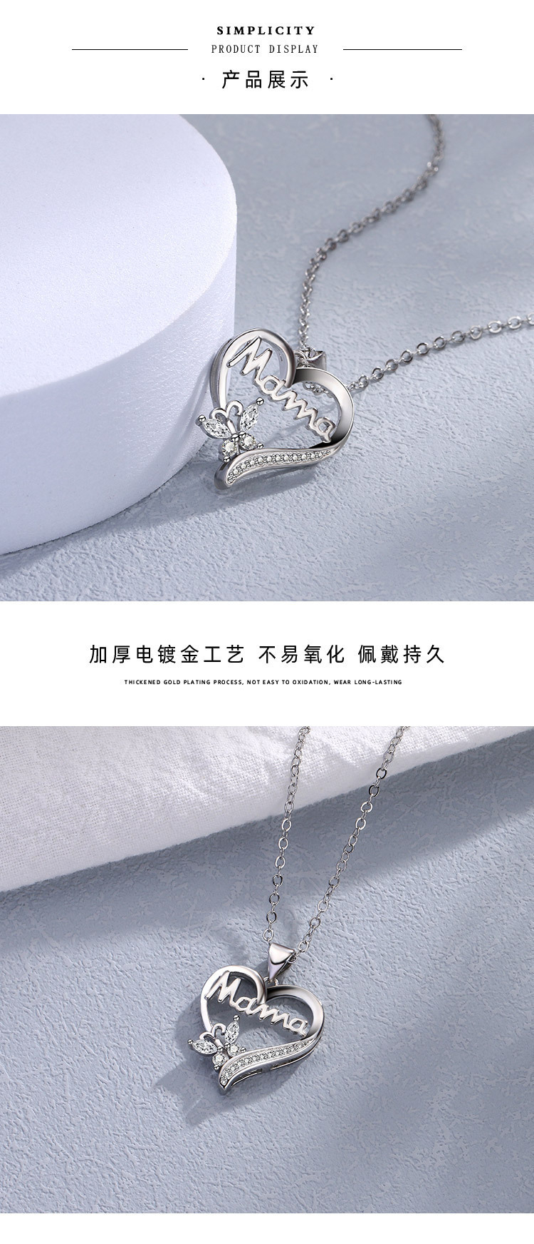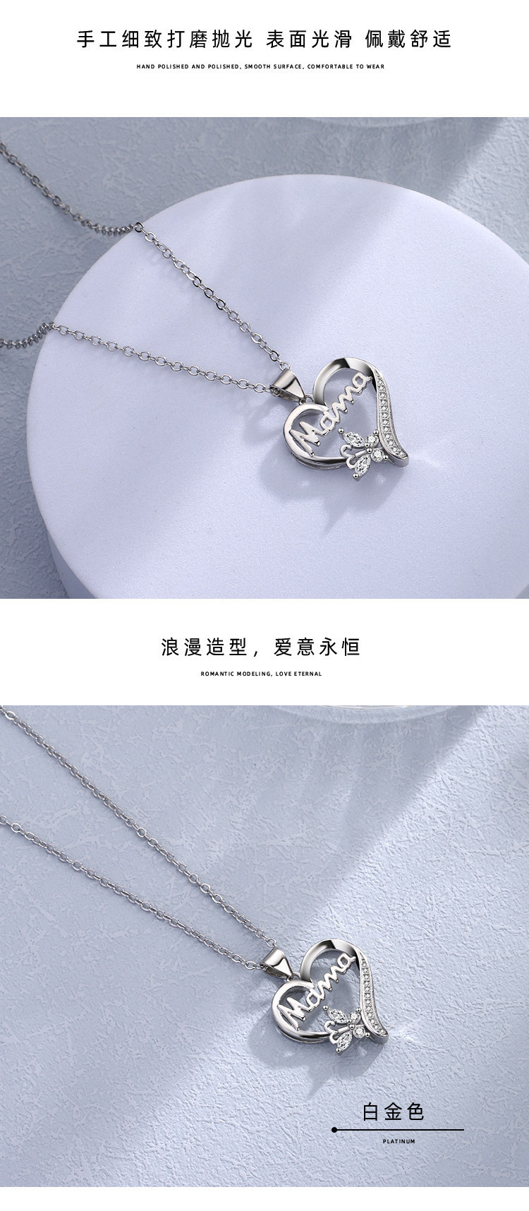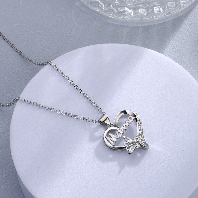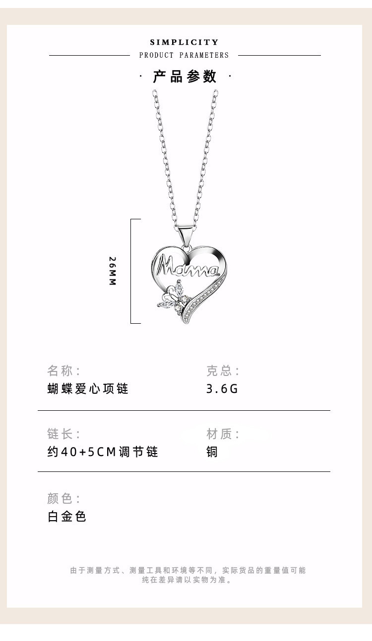 跨境热销新款简约心形项链蝴蝶镶钻Mama项链锁骨链母亲节礼物项坠