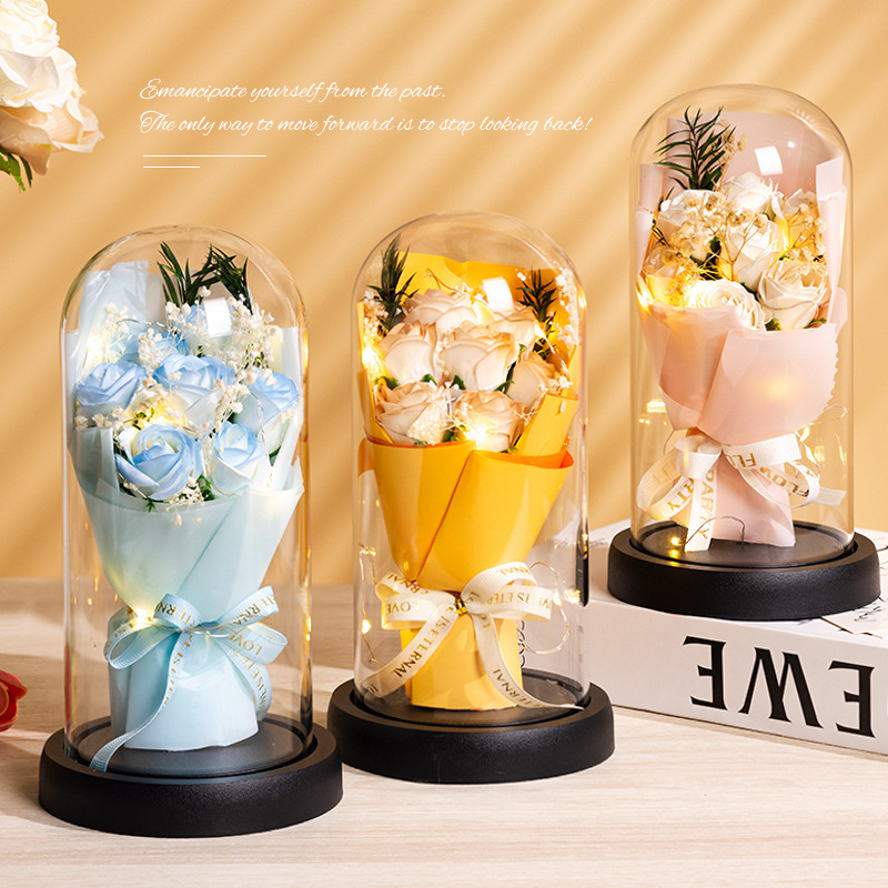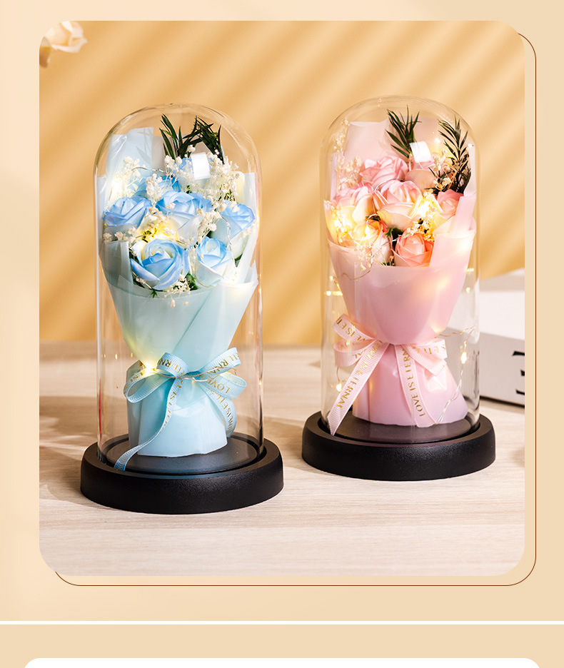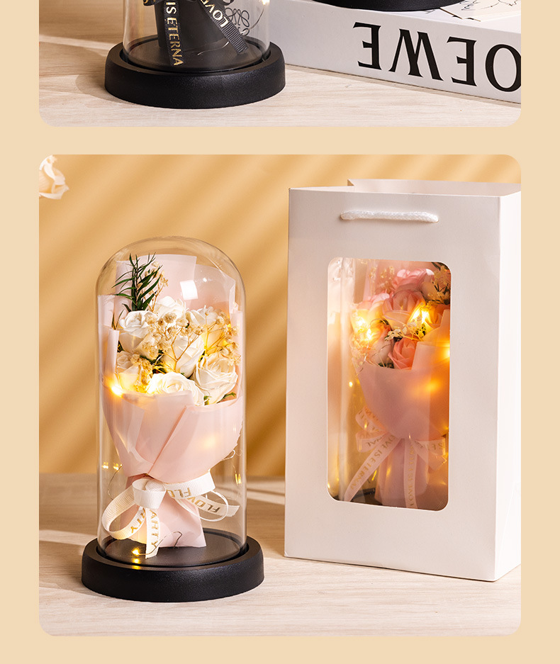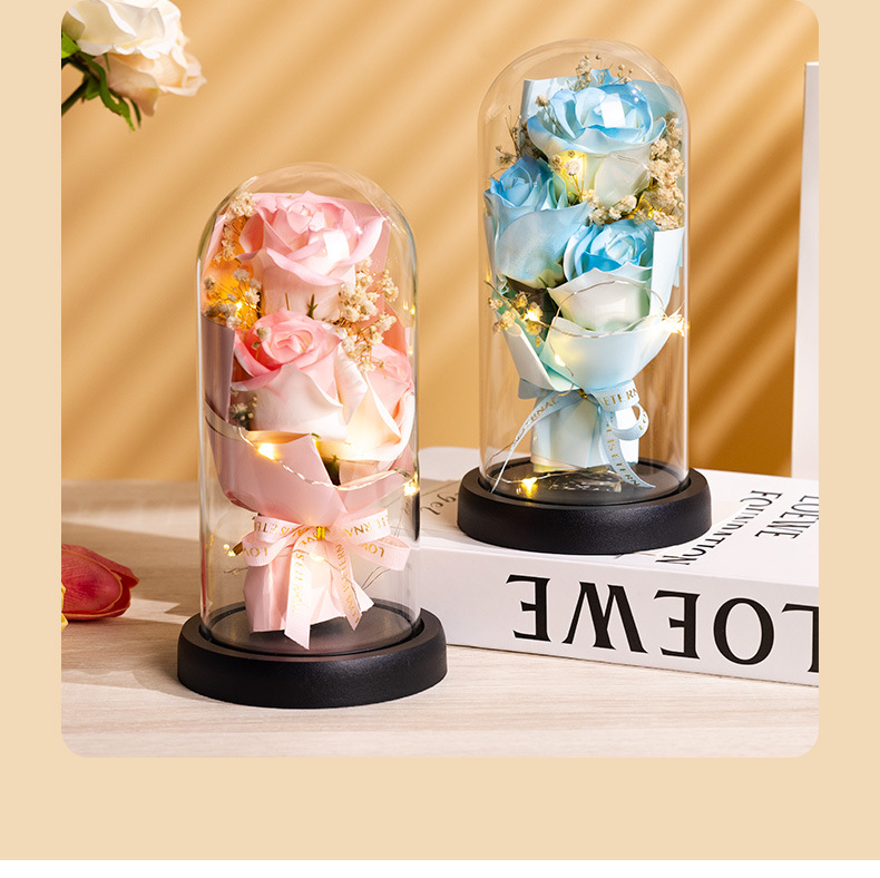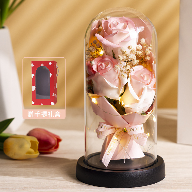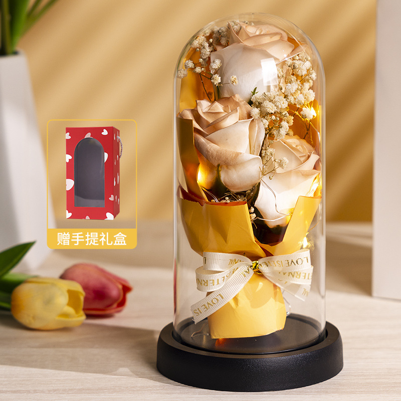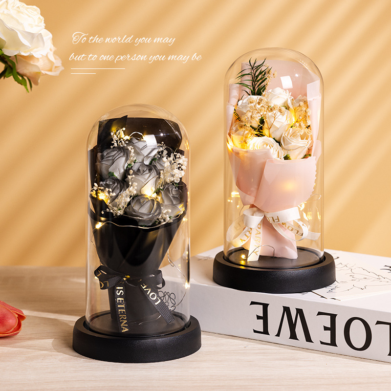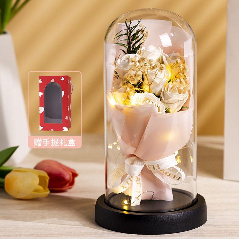 亚克力罩玫瑰香皂花永生花干花束礼盒发光生日礼物送女友实用摆件