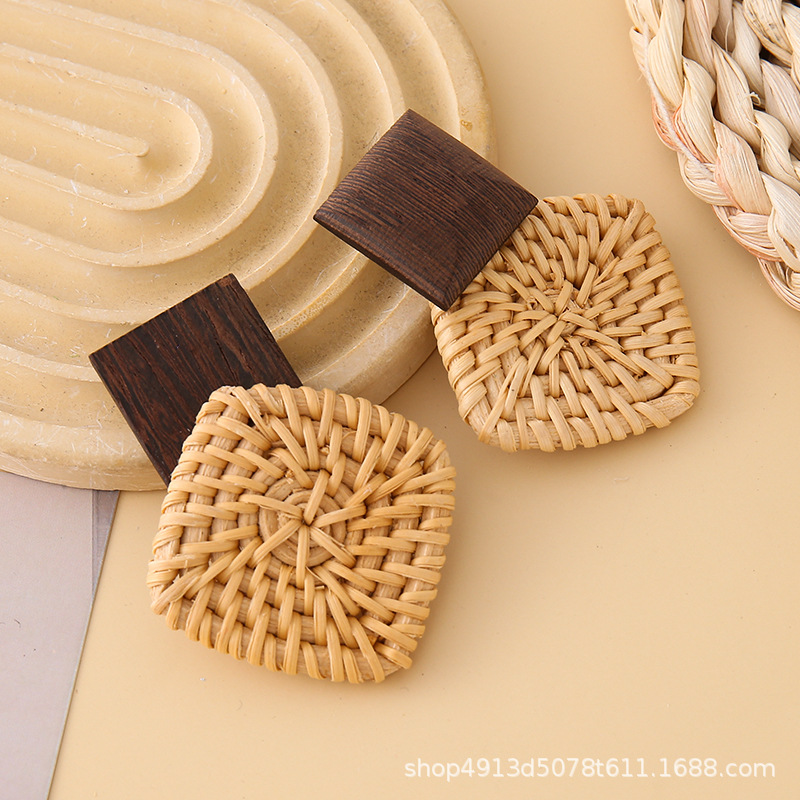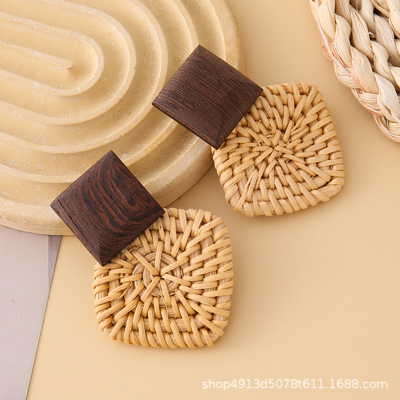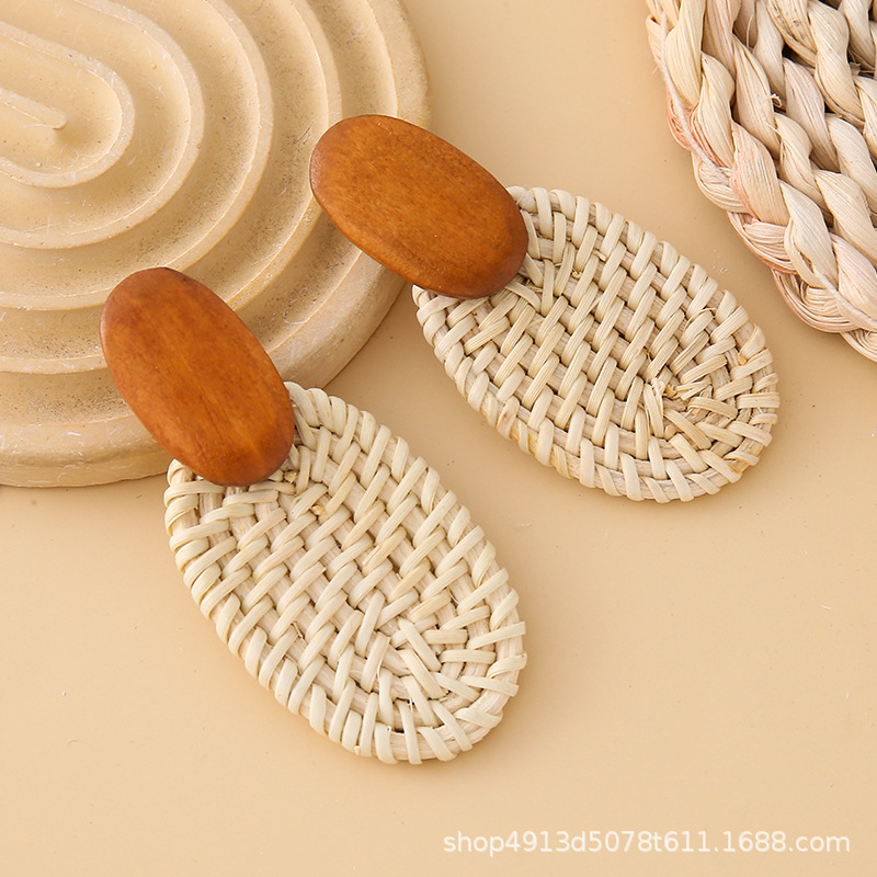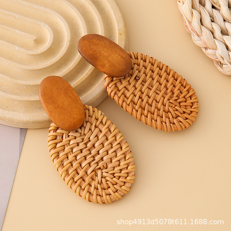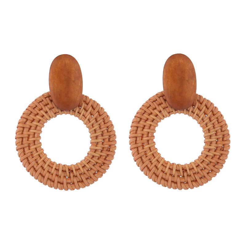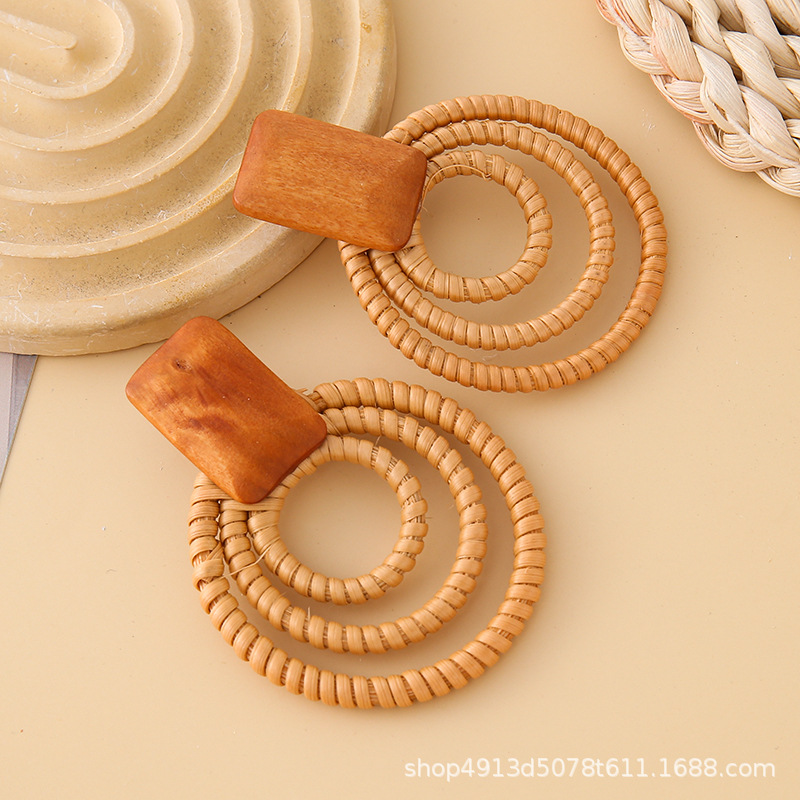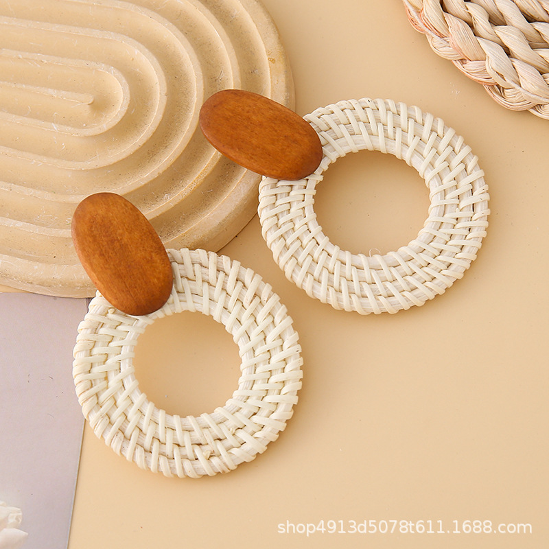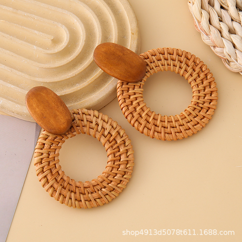 跨境欧美波西米亚风圆形耳环个性夸张手工藤编木头耳钉潮流耳饰女