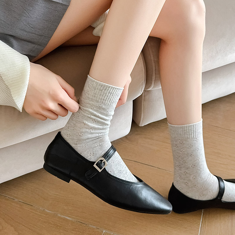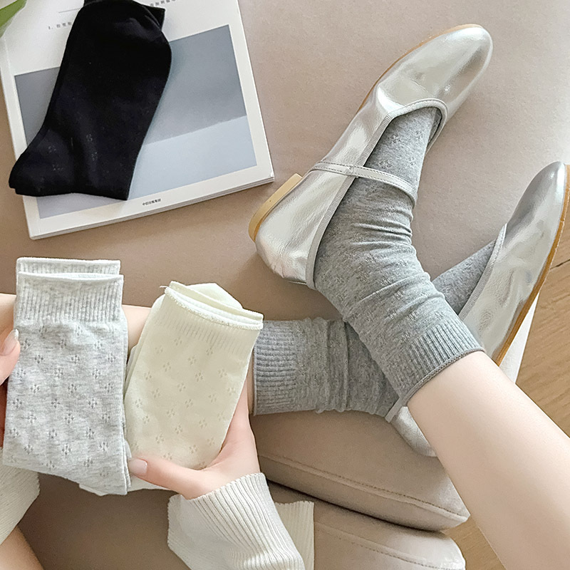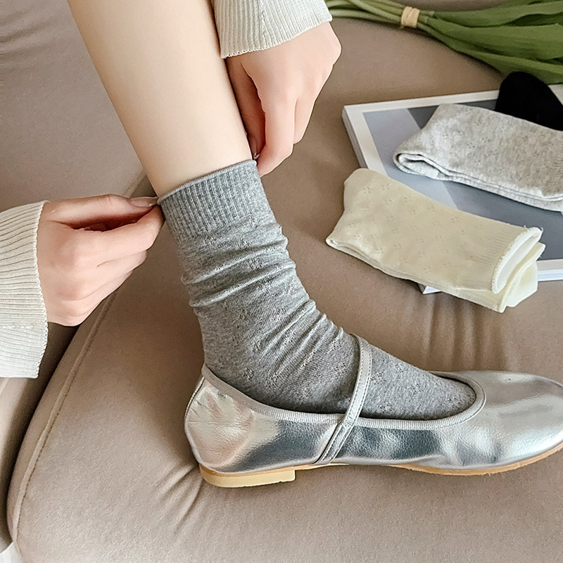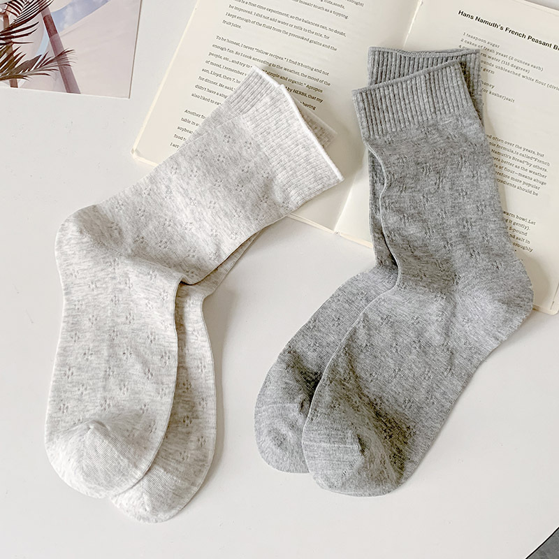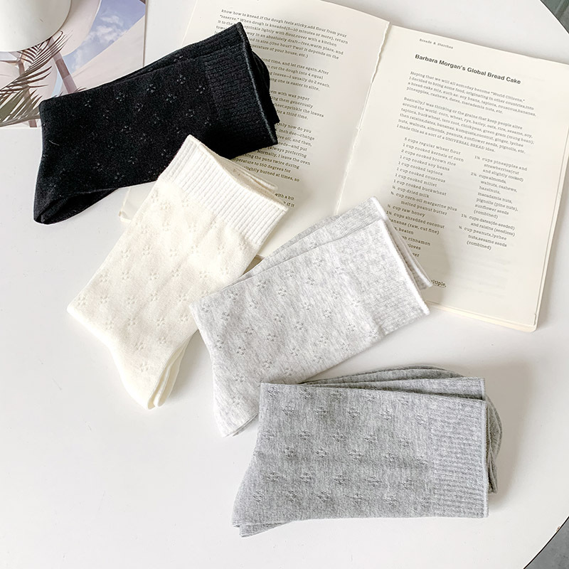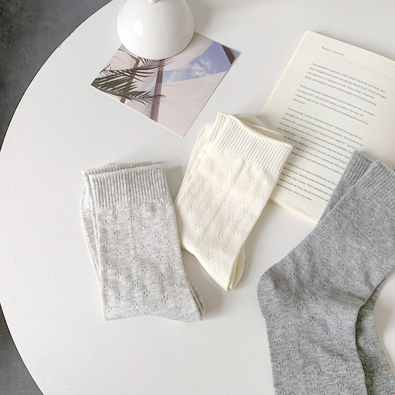 春夏薄款袜子女镂空四叶草潮流中筒袜女奶油白网眼无骨纯棉堆堆袜