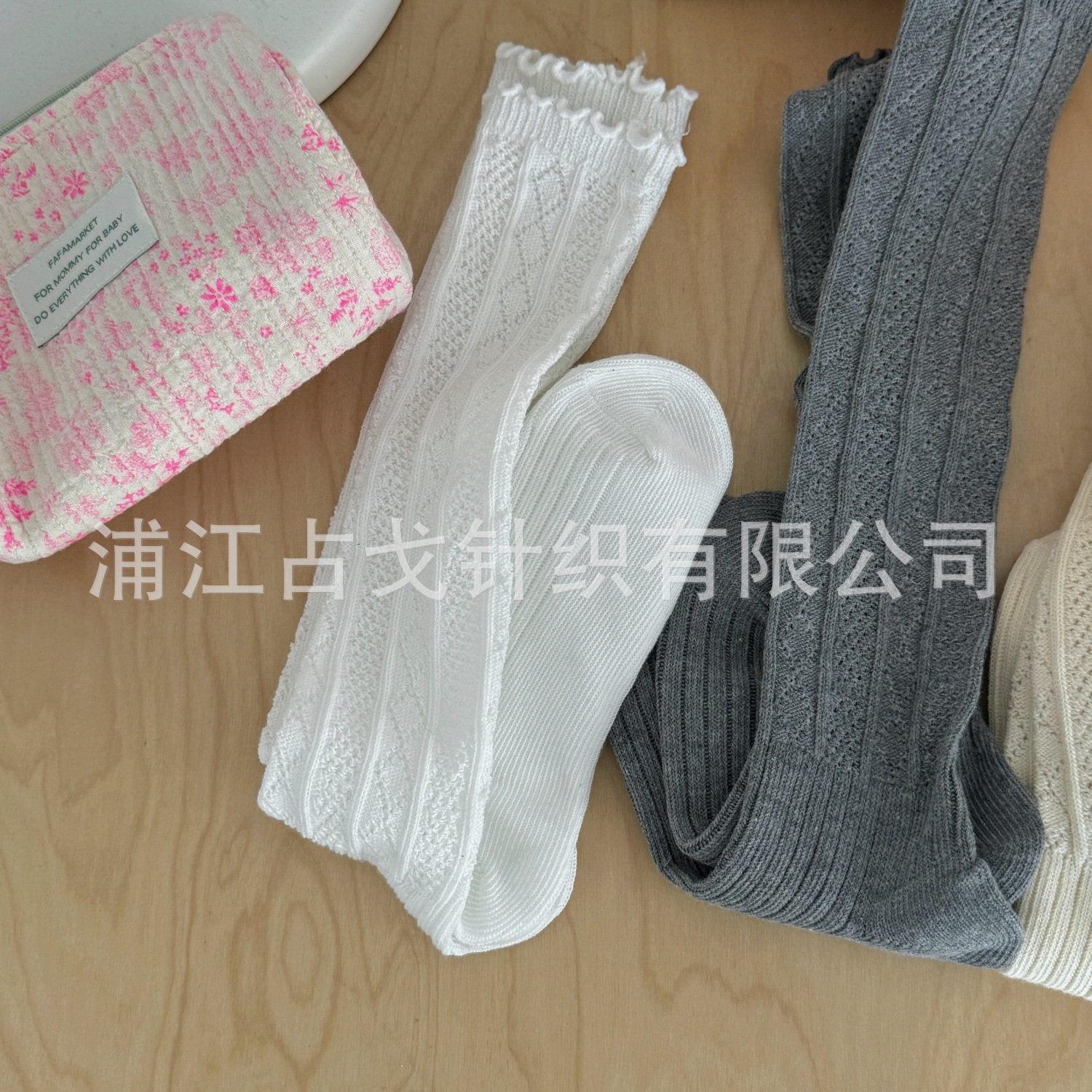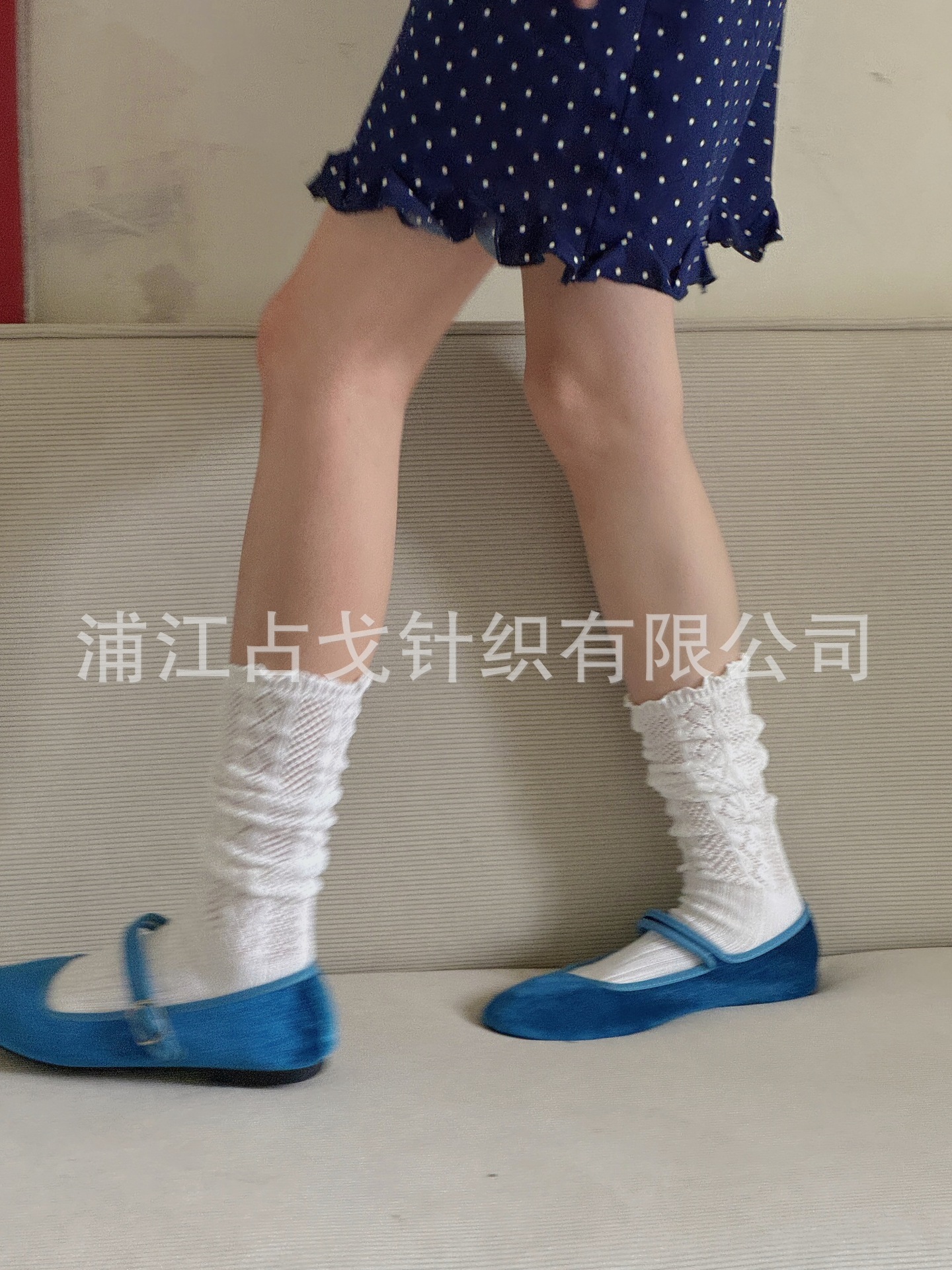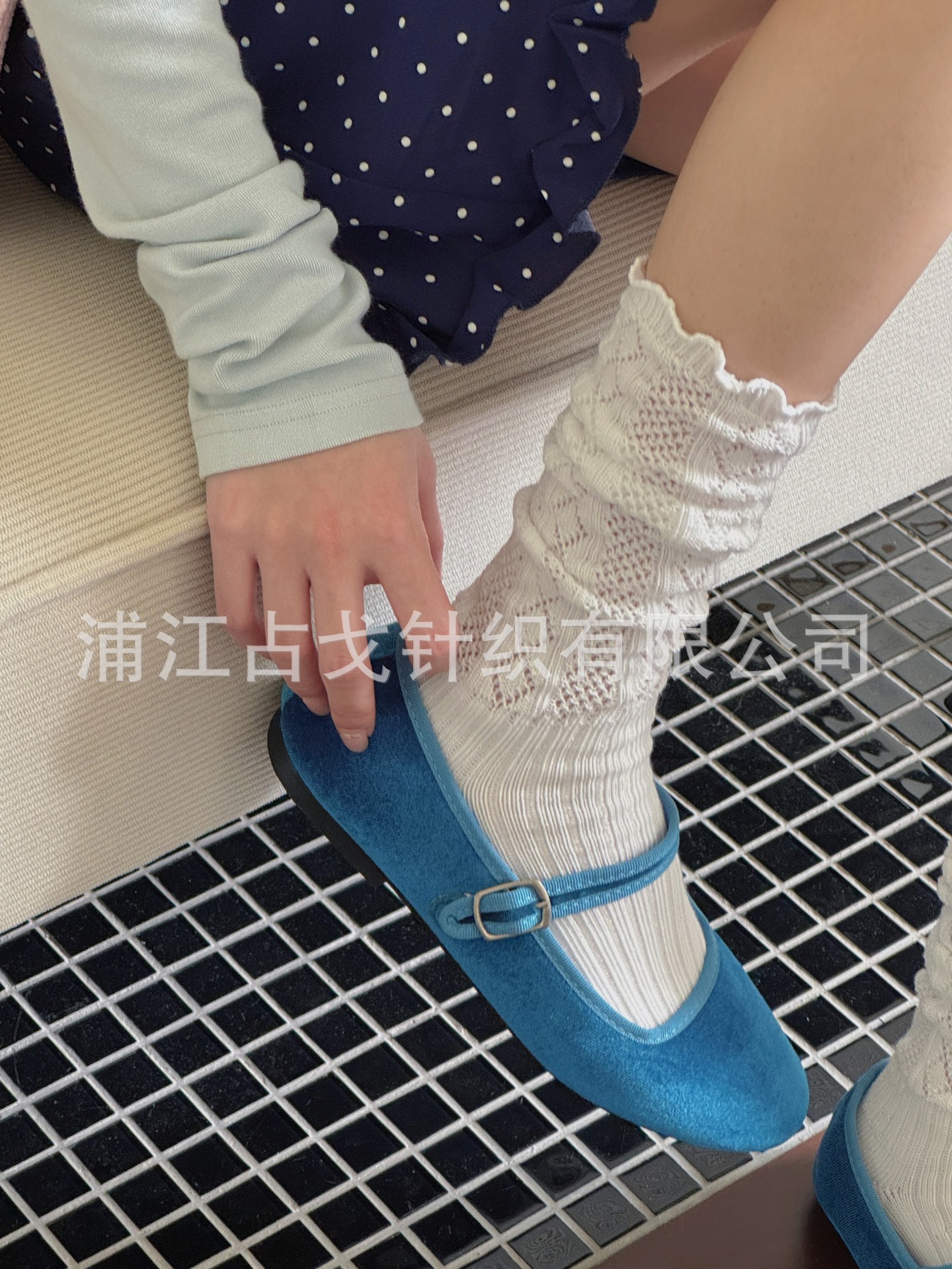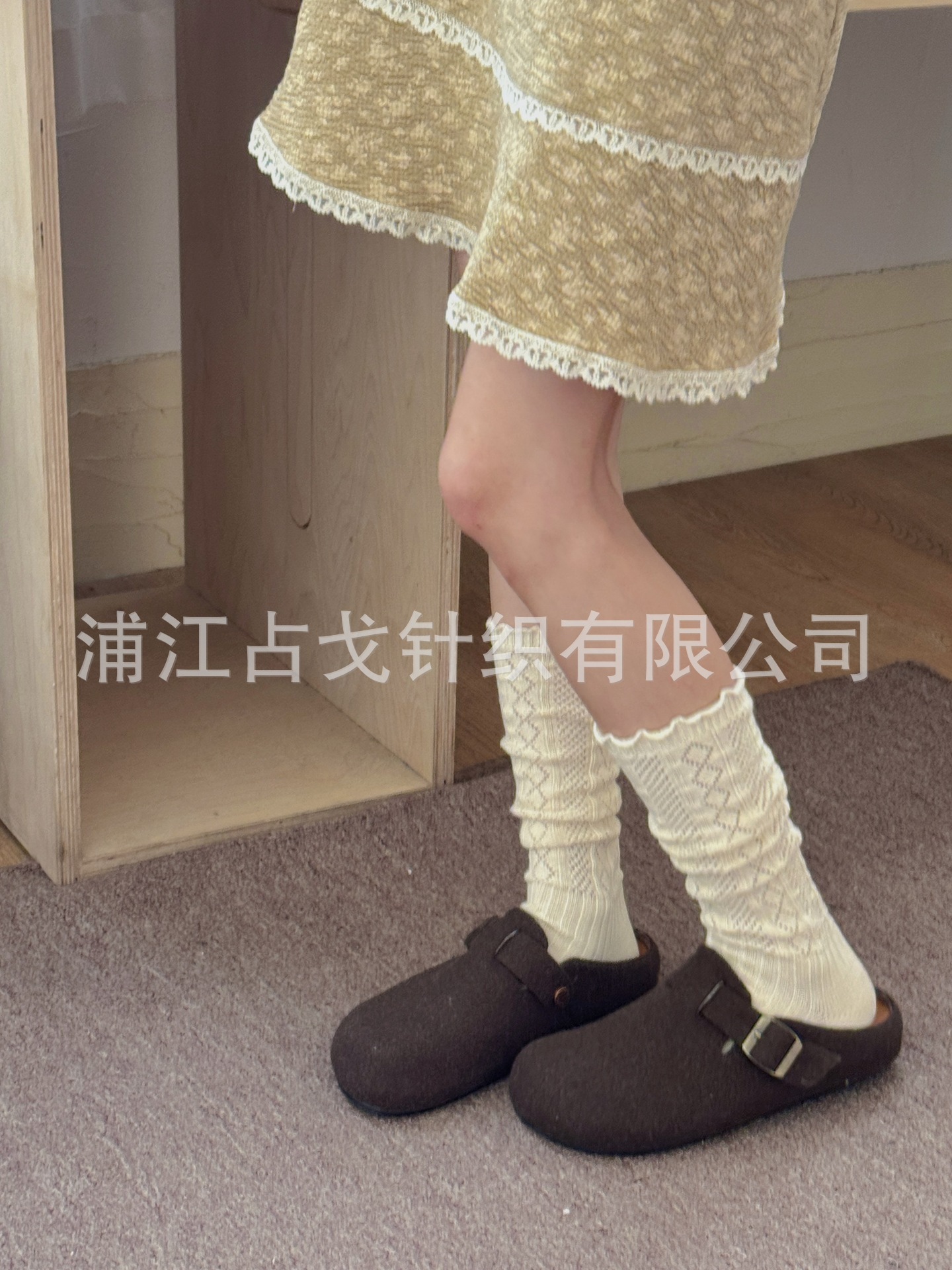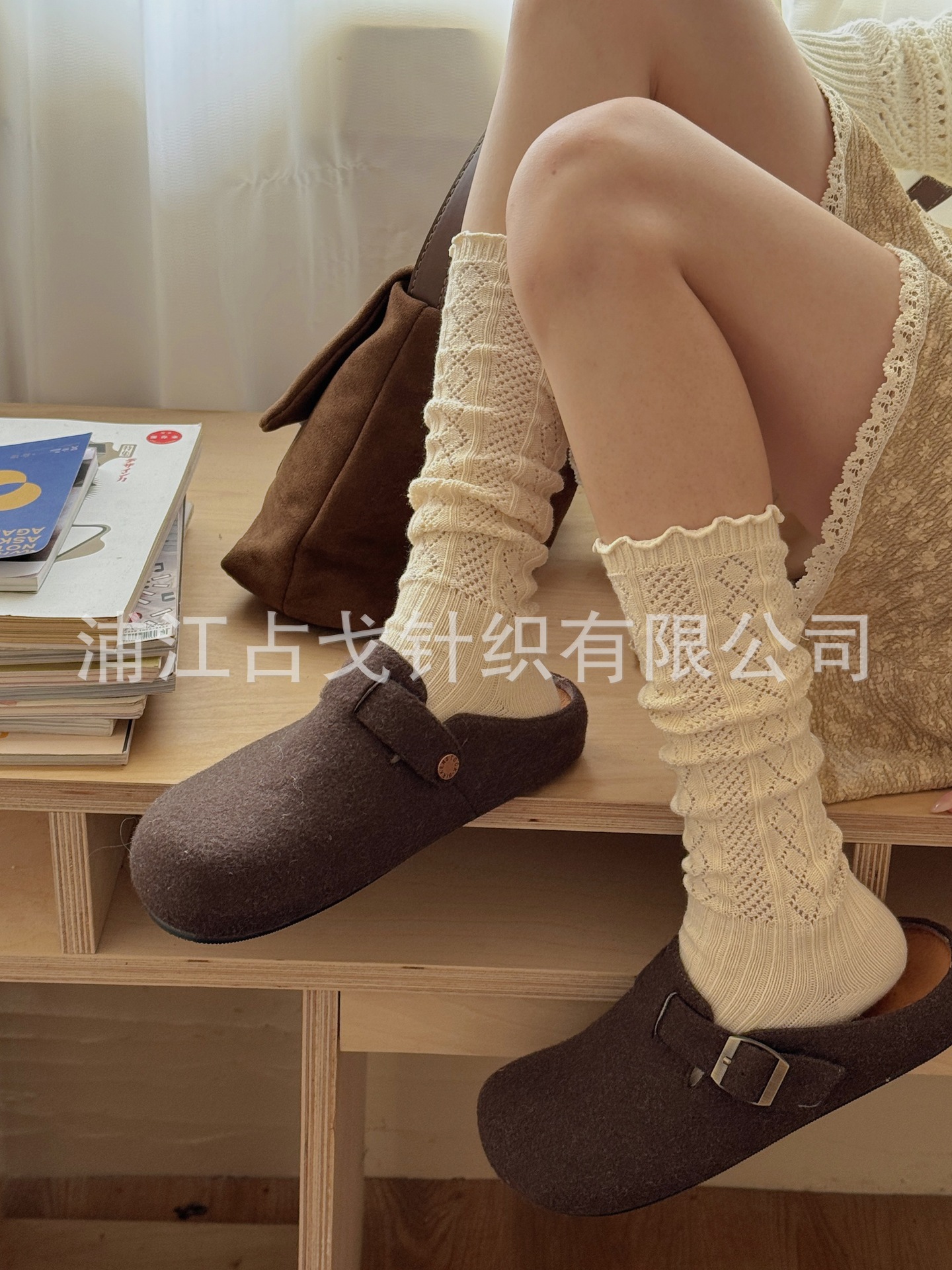 新款日系镂空芭蕾风木耳边中筒袜双针双路甜美吸汗堆堆袜子四季女
