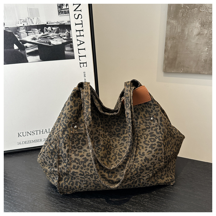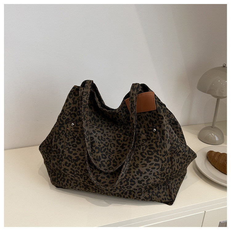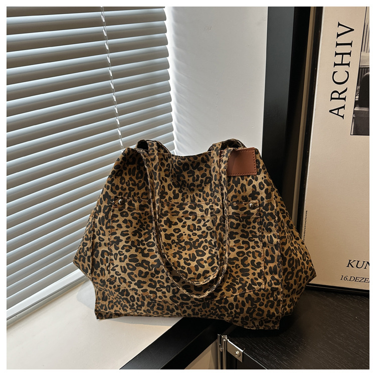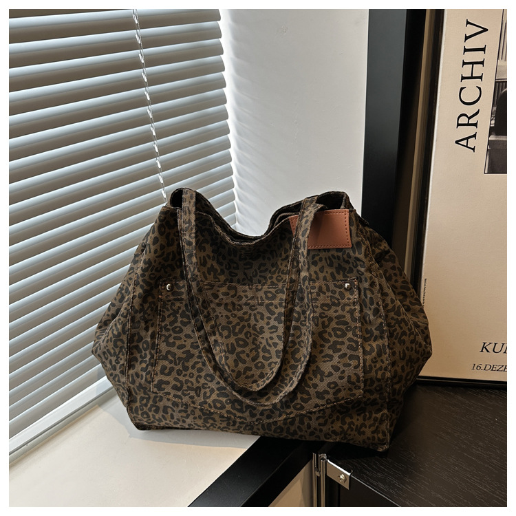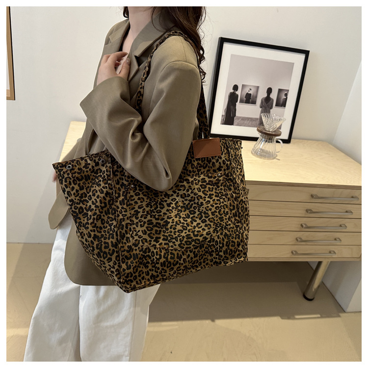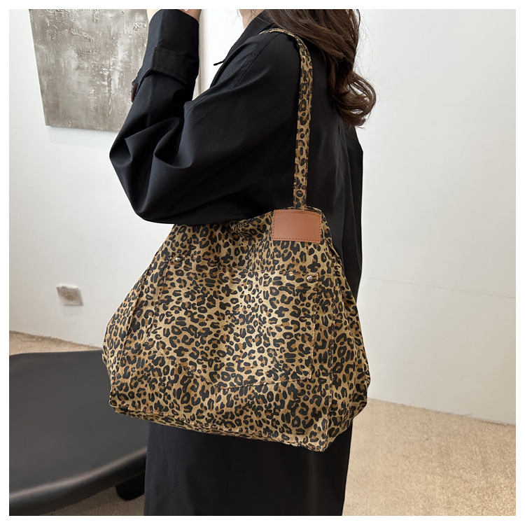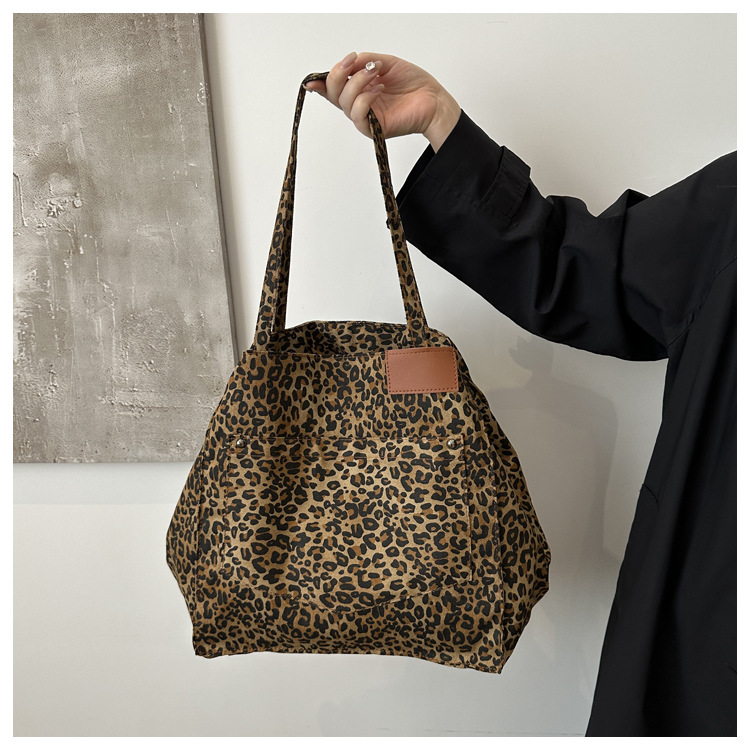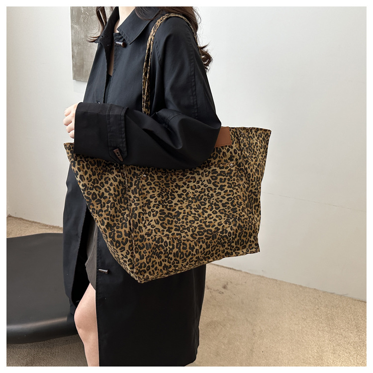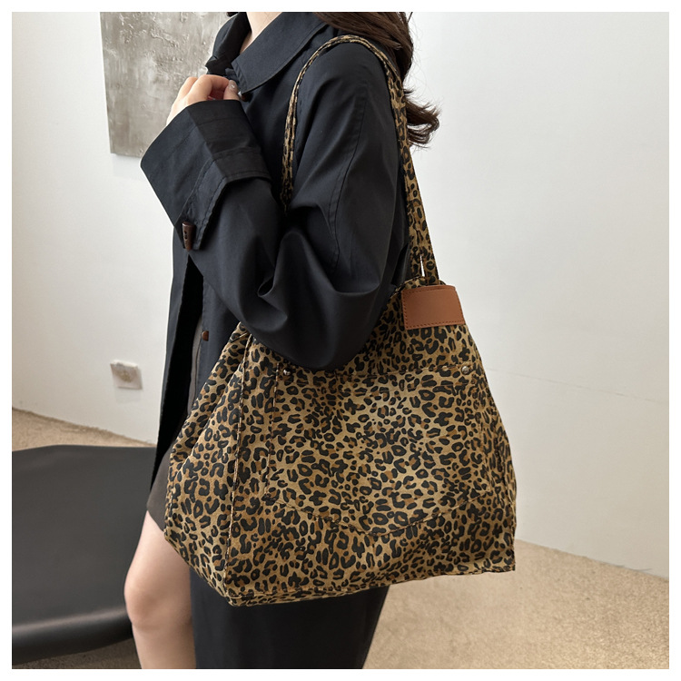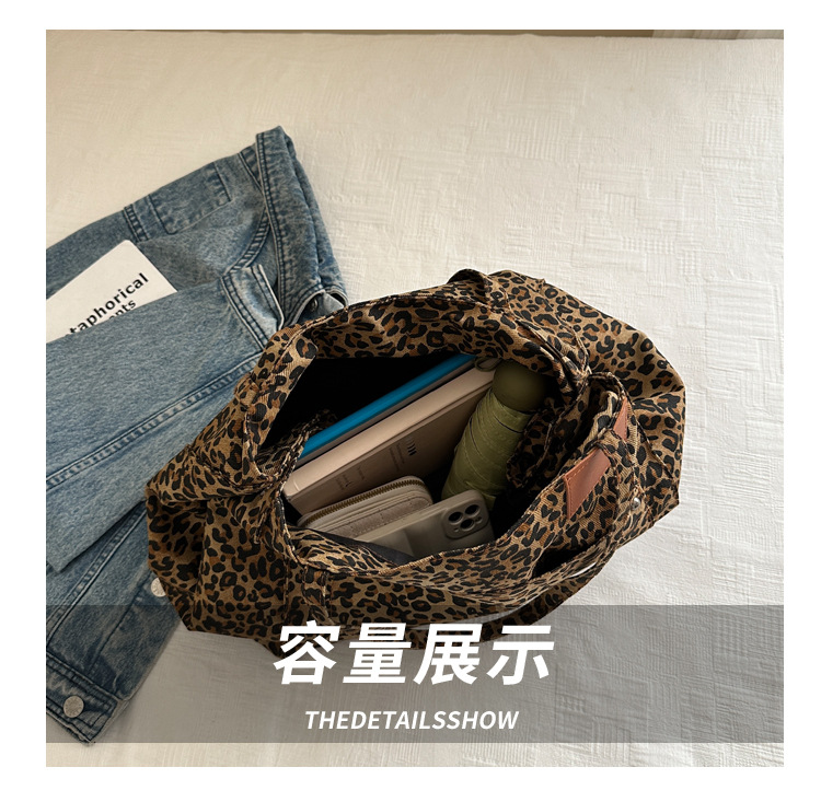 2026豹纹帆布单肩包大容量托特包包女旅行手提大包复古印花女包
