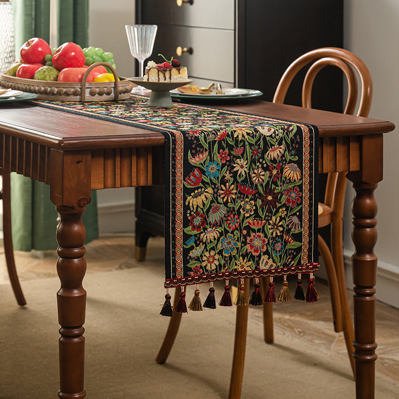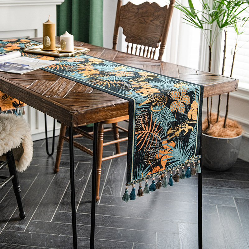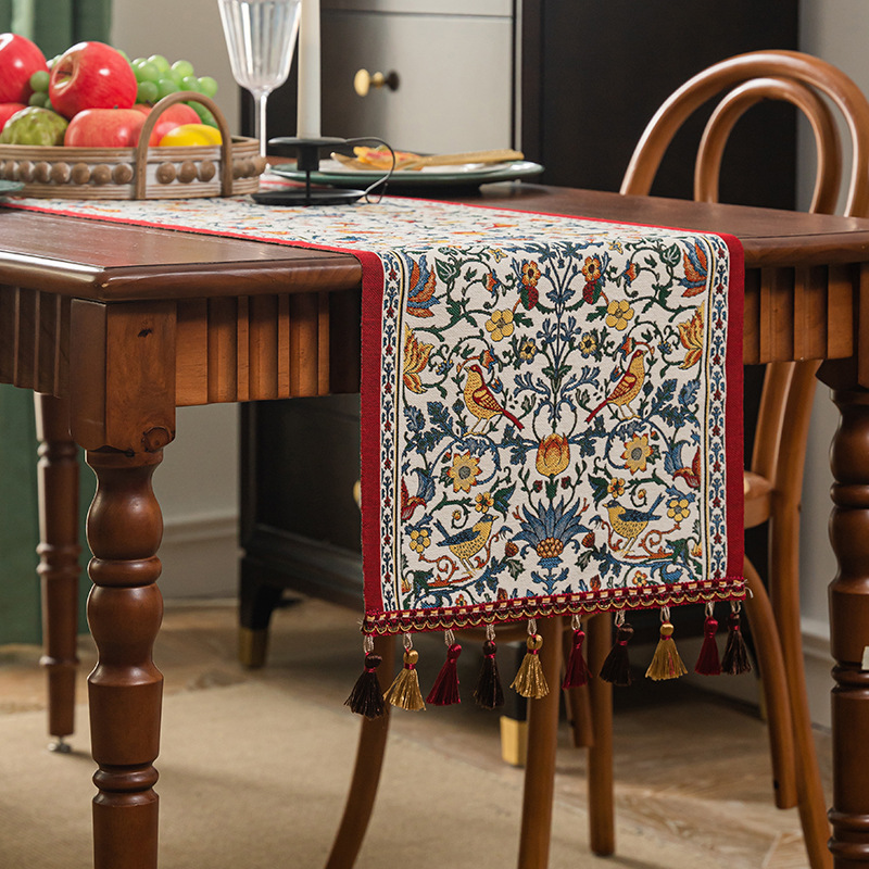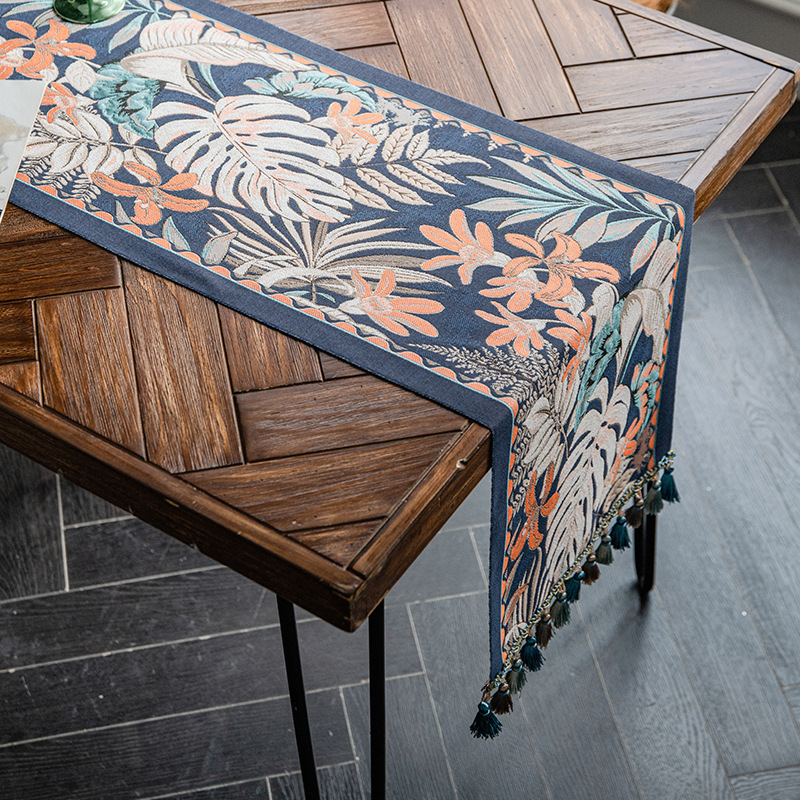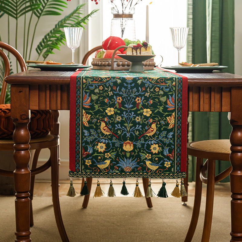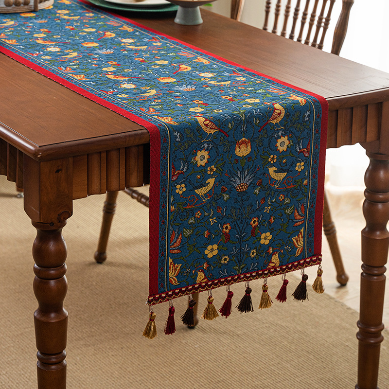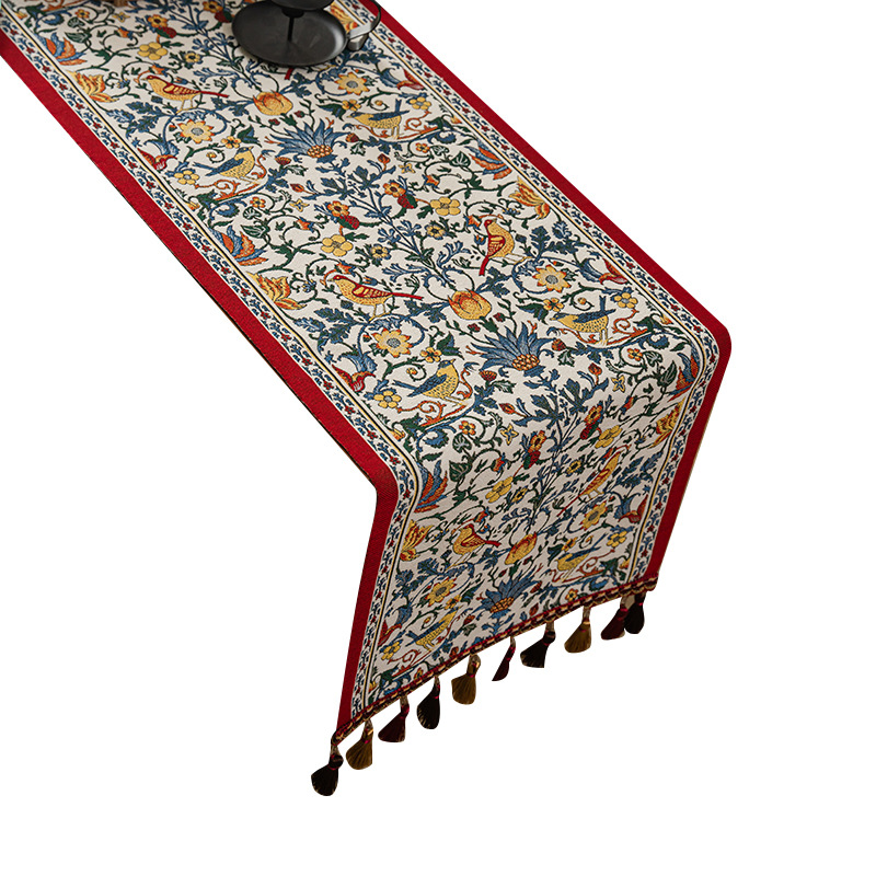 轻奢美式复古涤纶流苏桌旗 喜鹊花朵色织提花餐桌边柜盖巾床尾旗