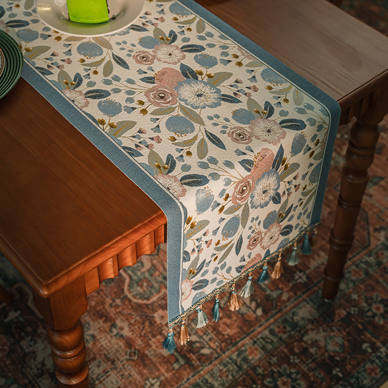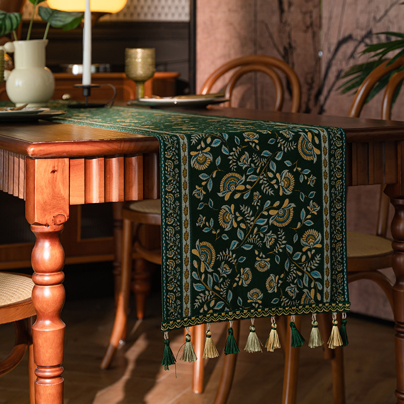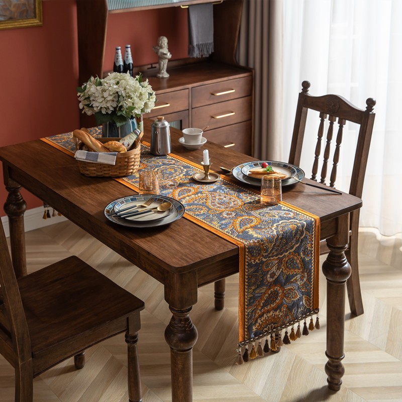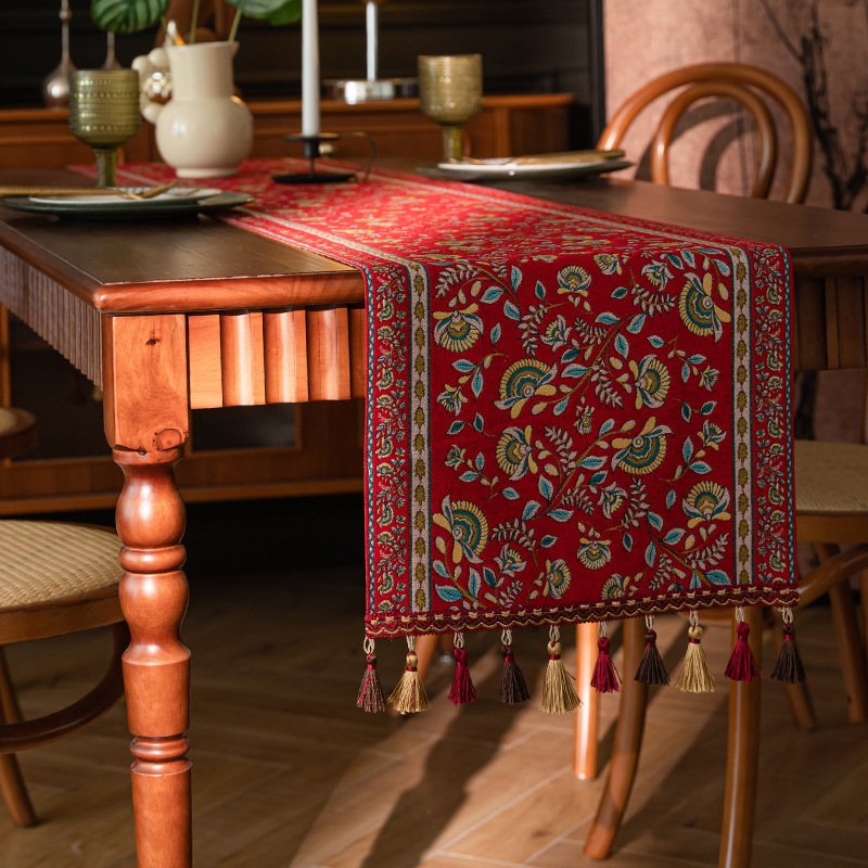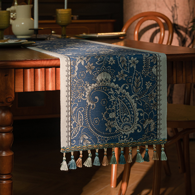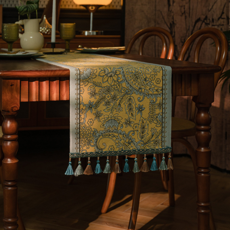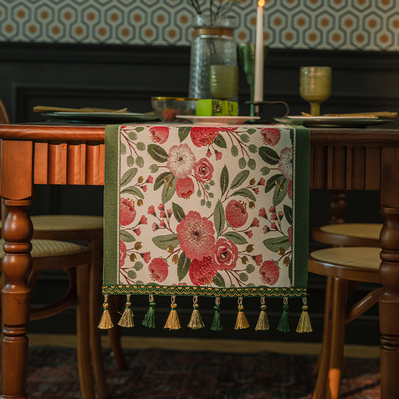 轻奢美式复古涤纶流苏桌旗 喜鹊花朵色织提花餐桌边柜盖巾床尾旗