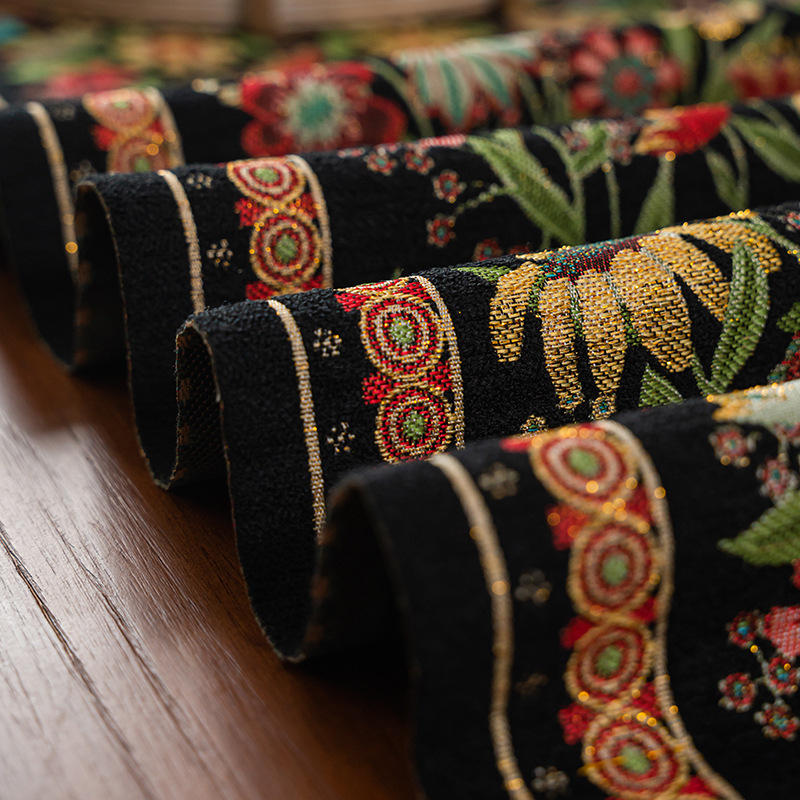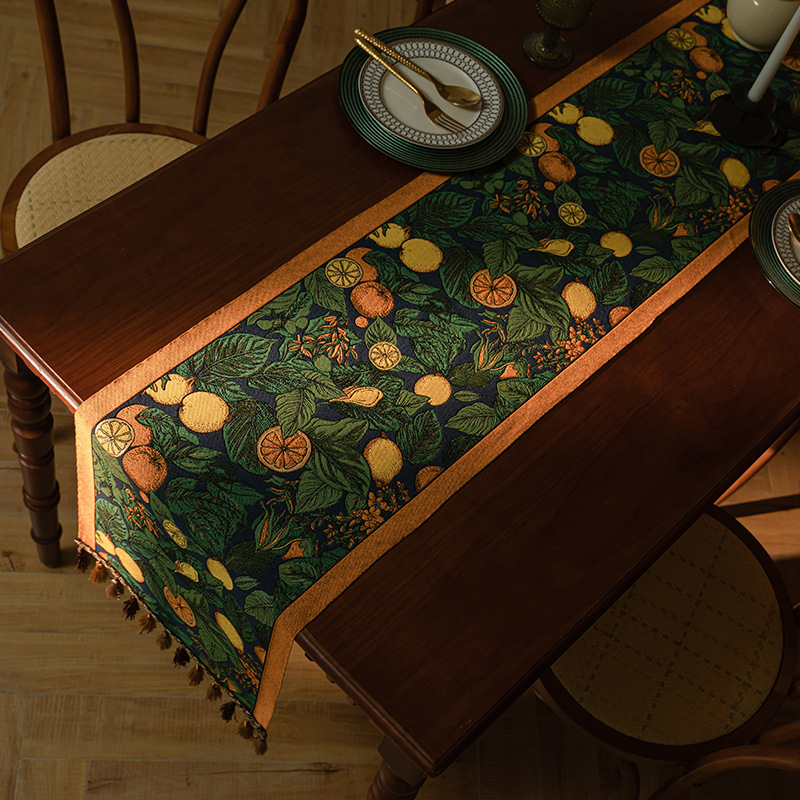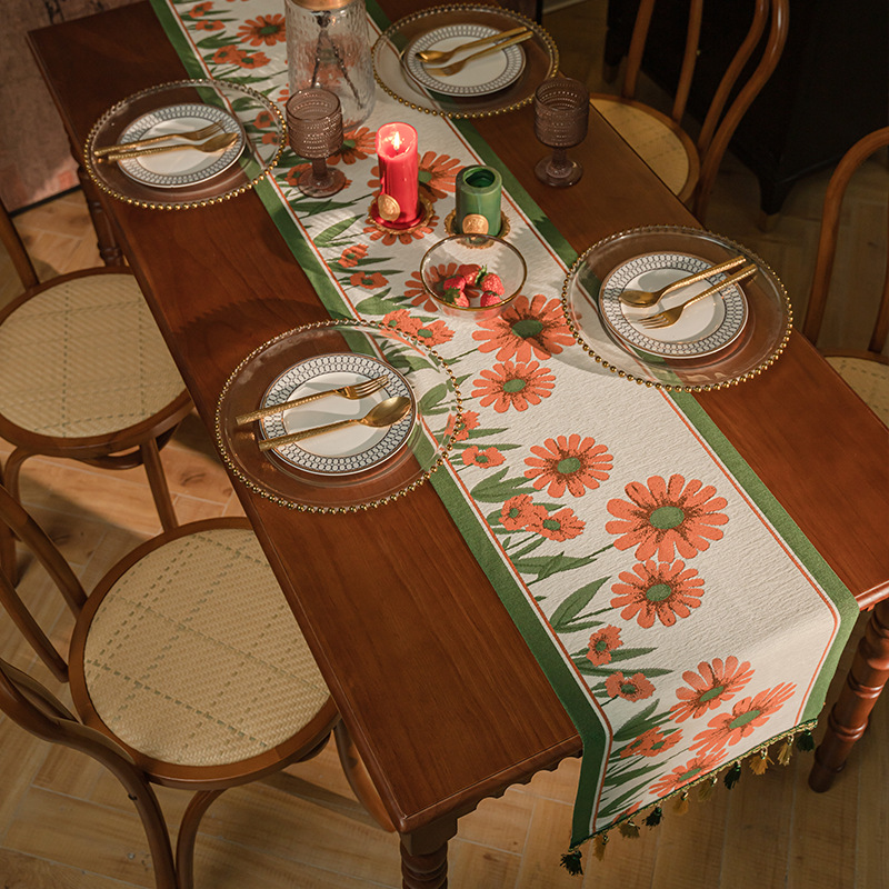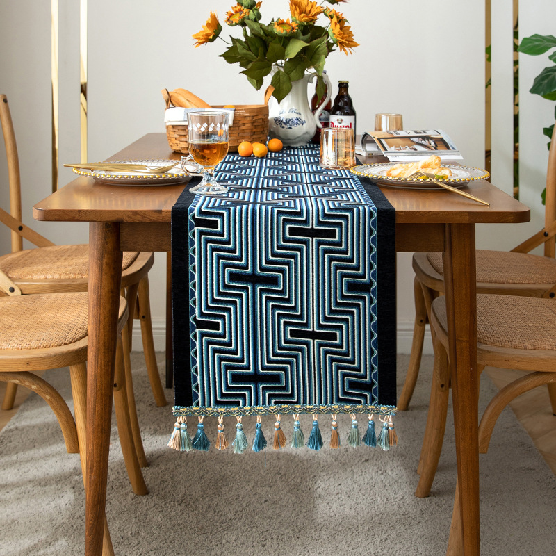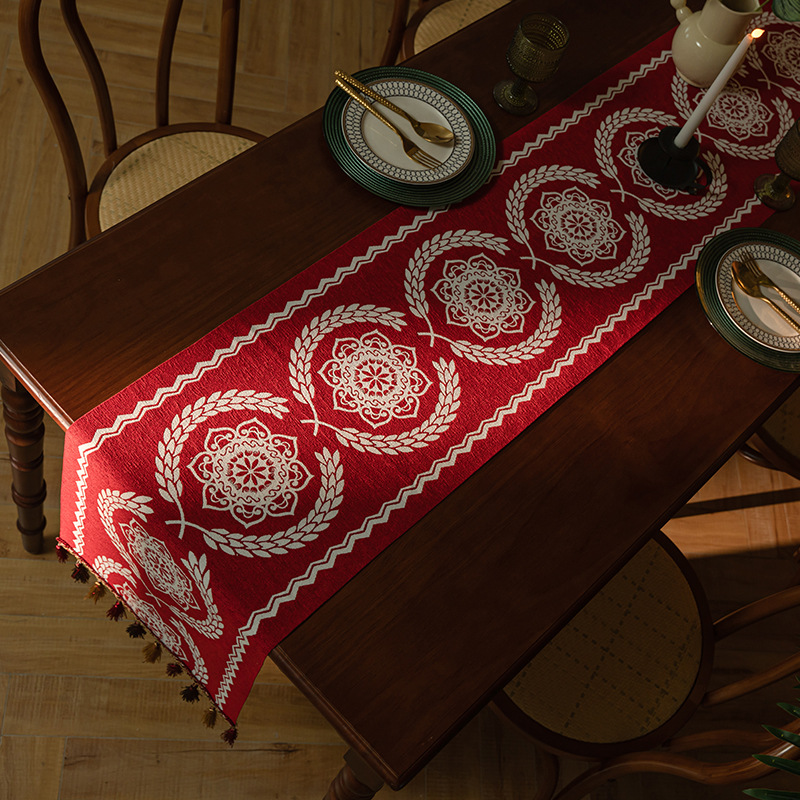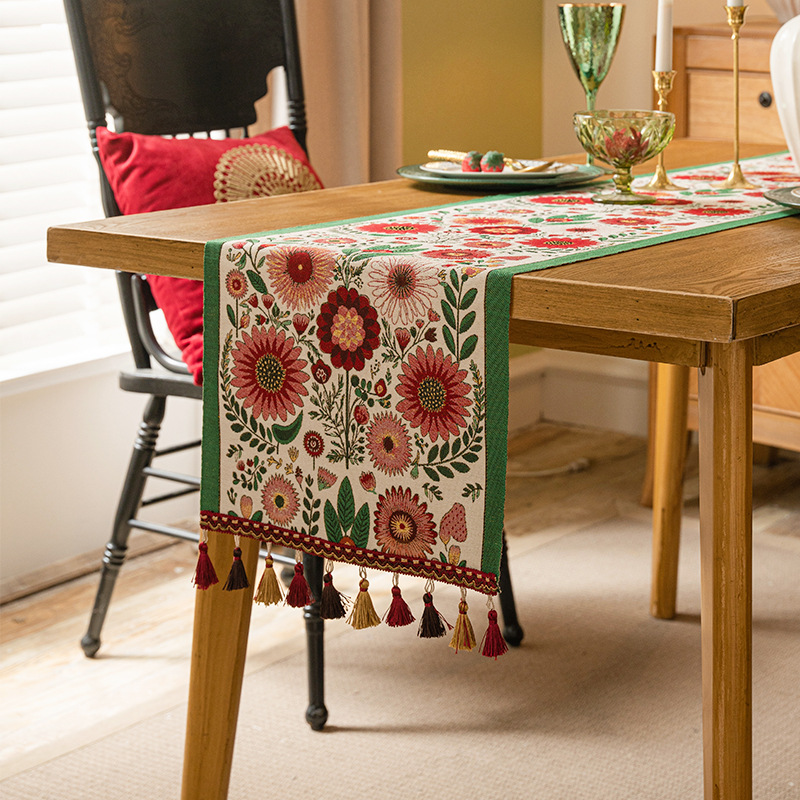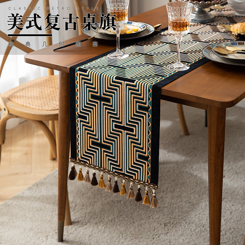 轻奢美式复古涤纶流苏桌旗 喜鹊花朵色织提花餐桌边柜盖巾床尾旗
