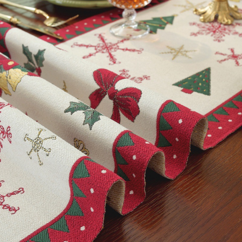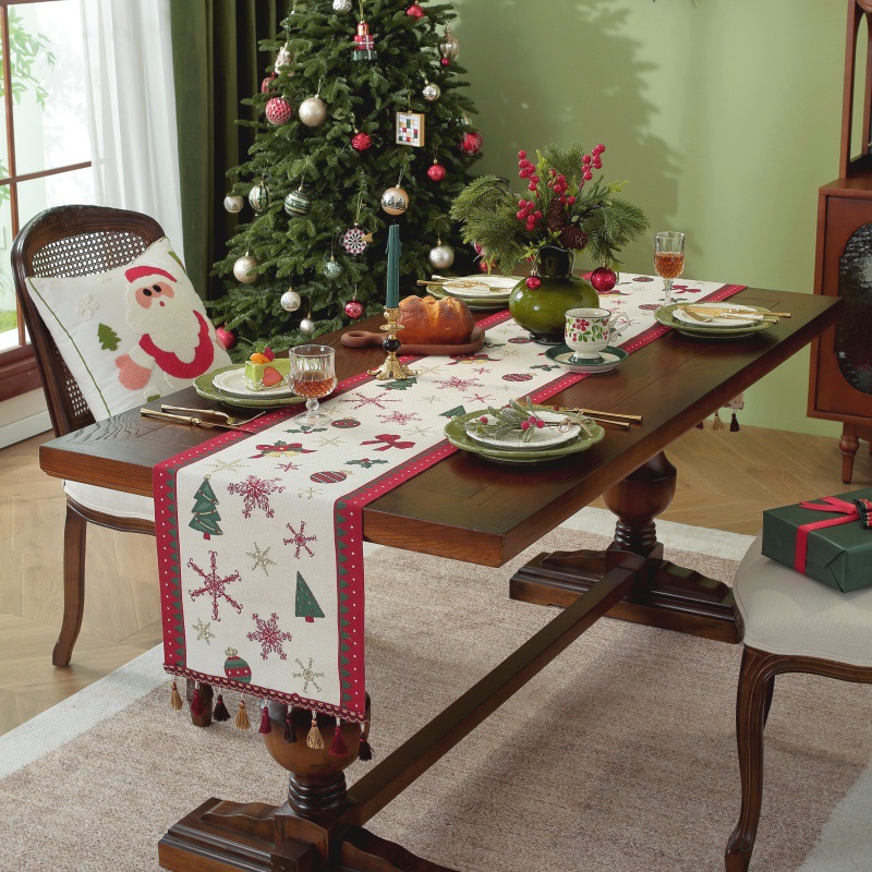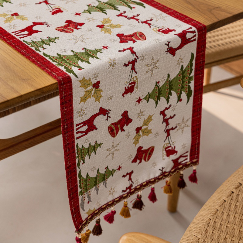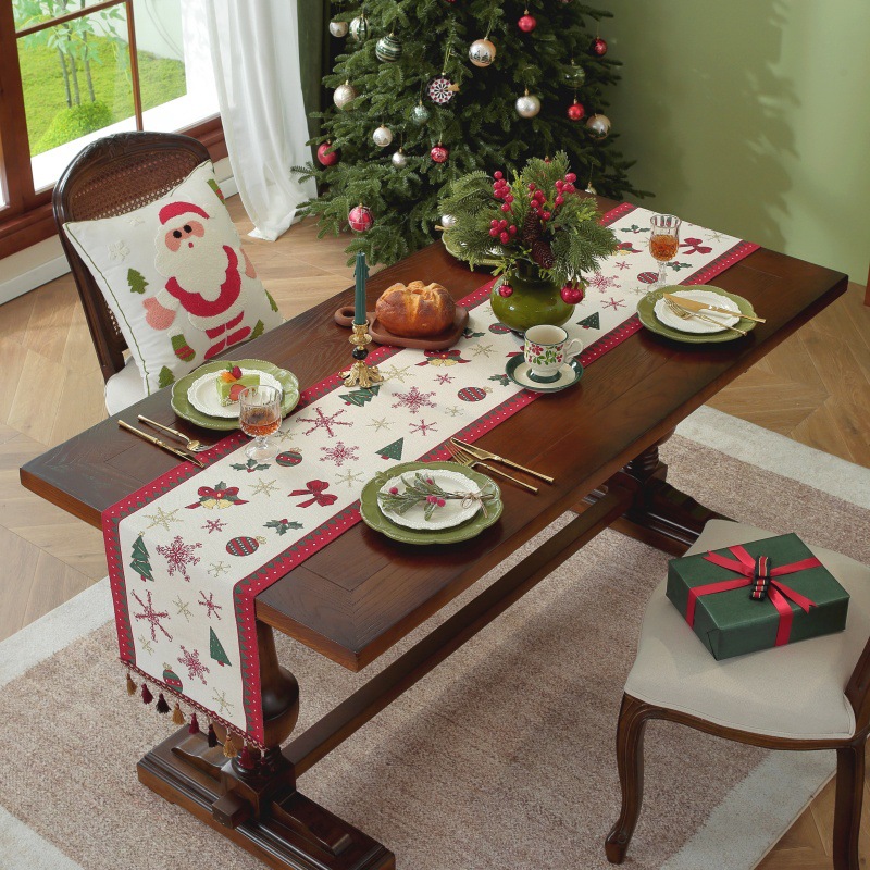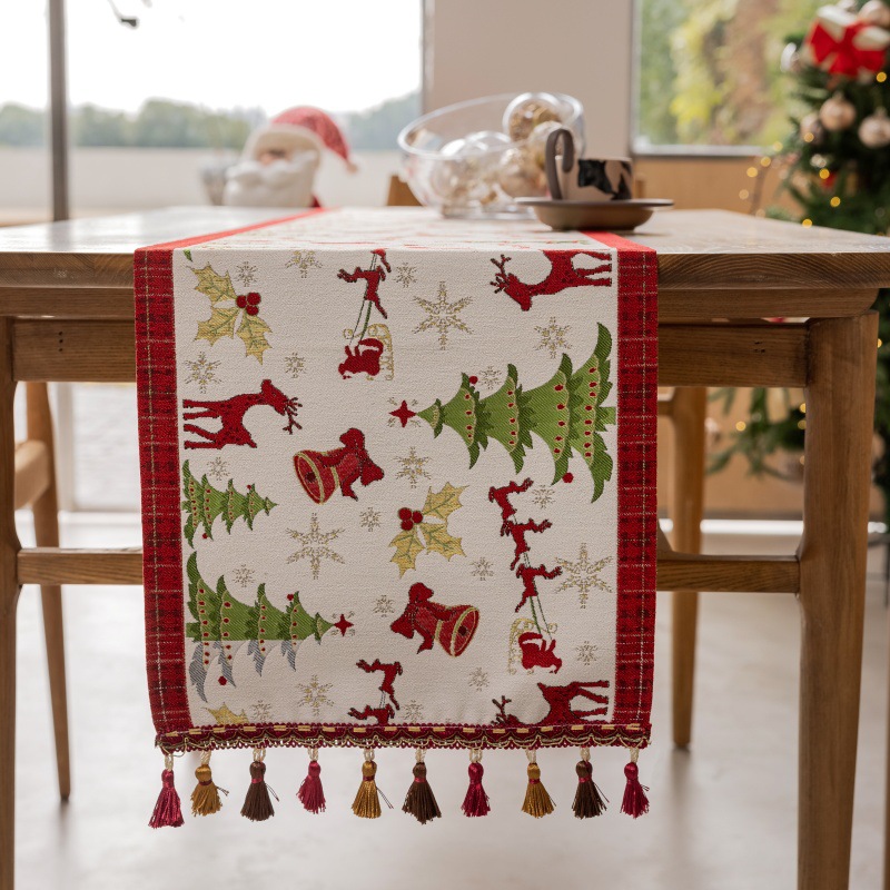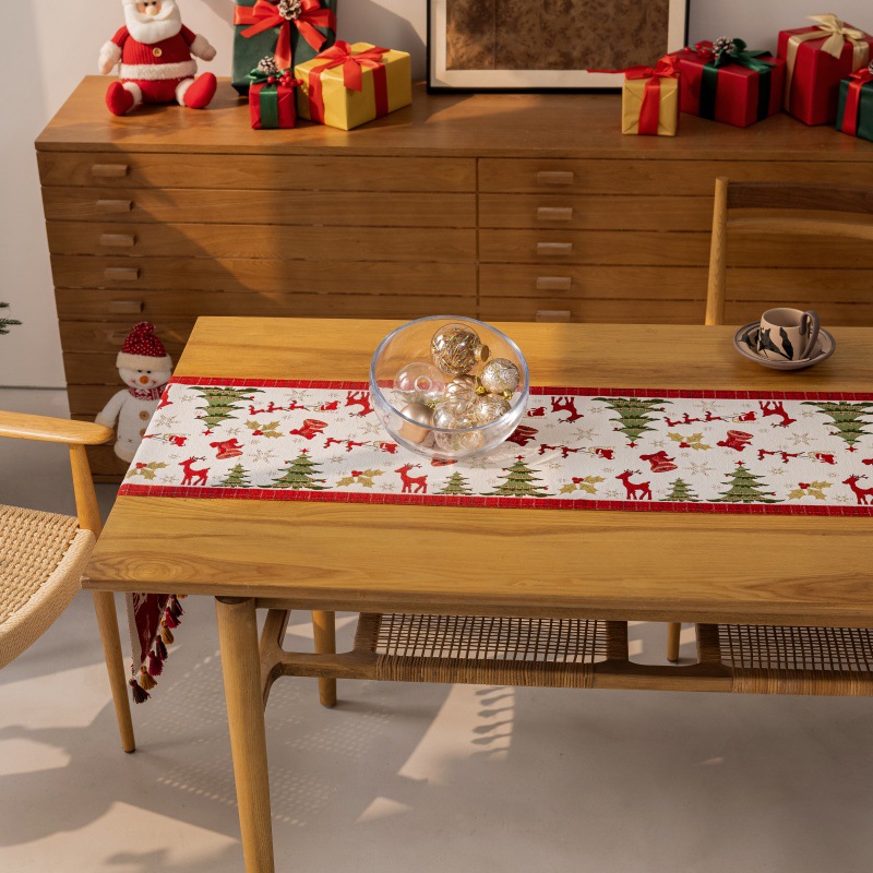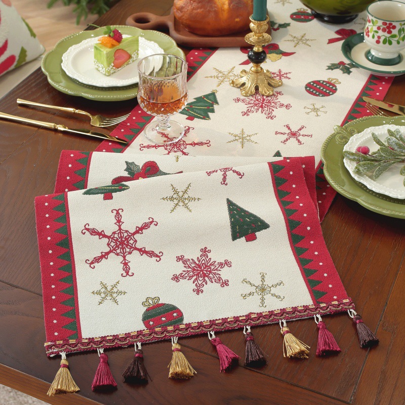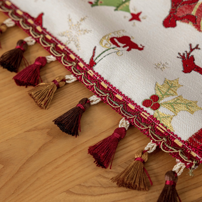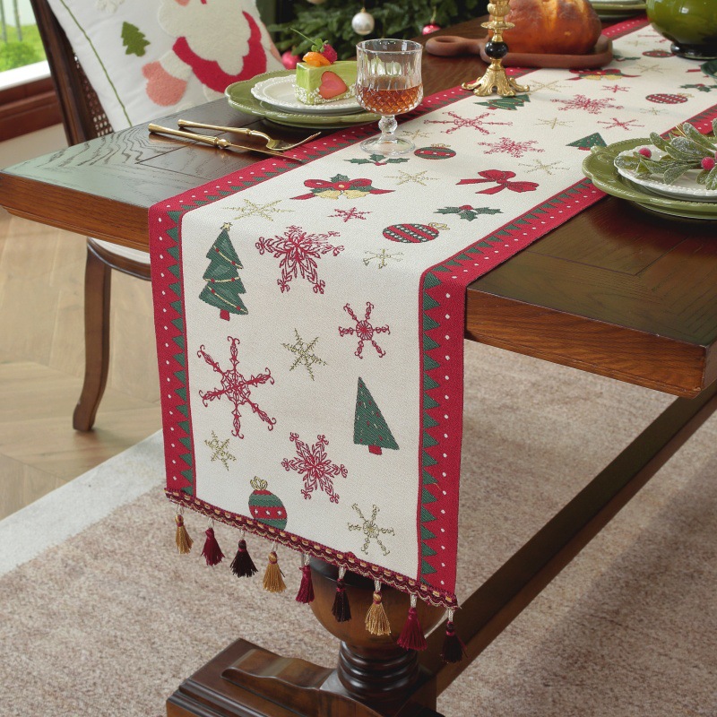 新款外贸跨境圣诞桌旗雪花餐厅装饰餐旗流苏提花餐柜盖巾床尾旗
