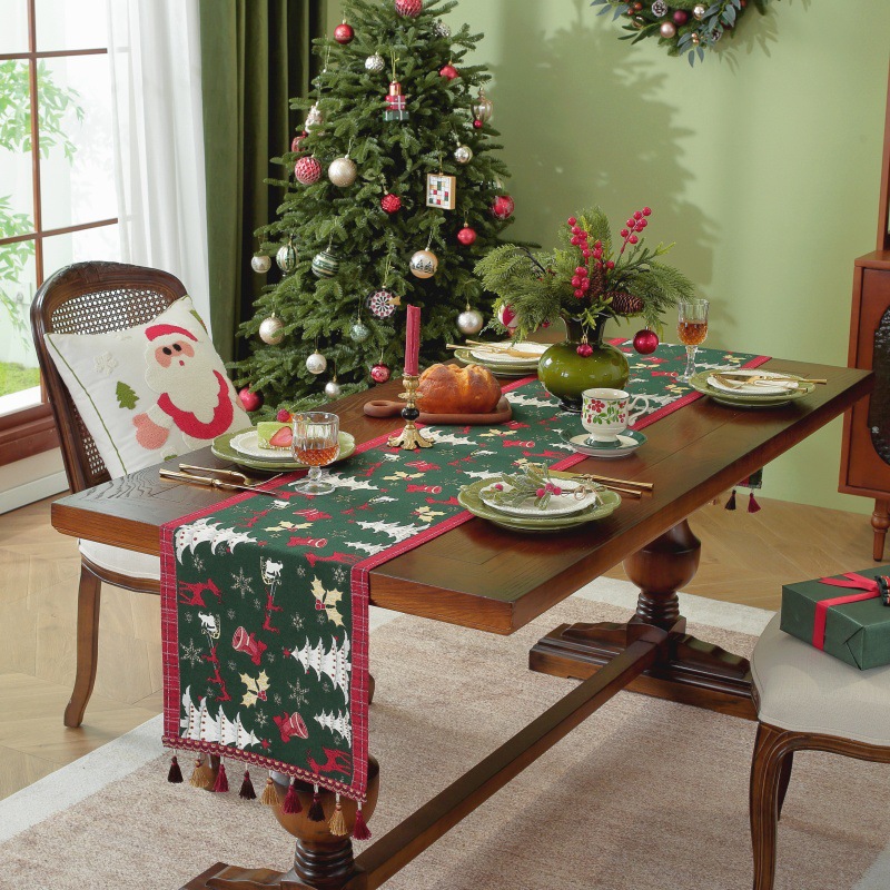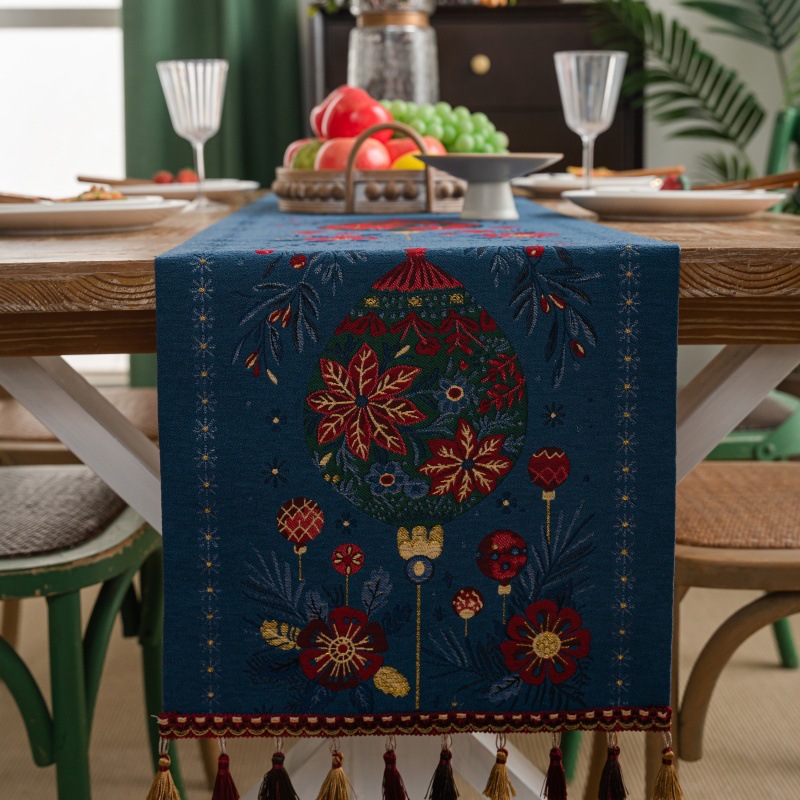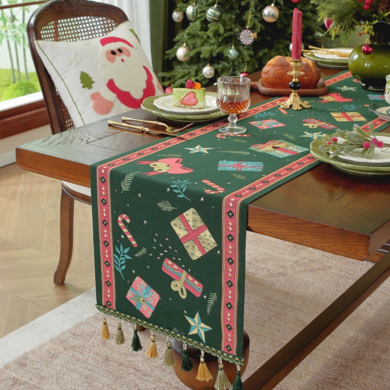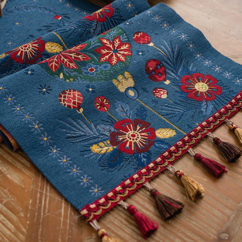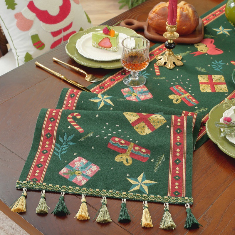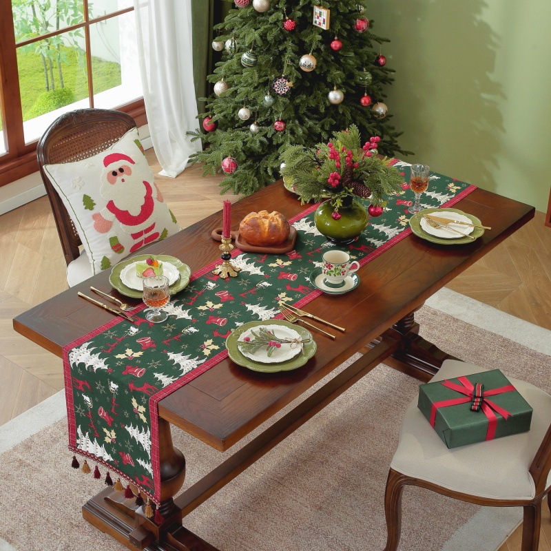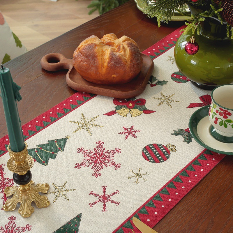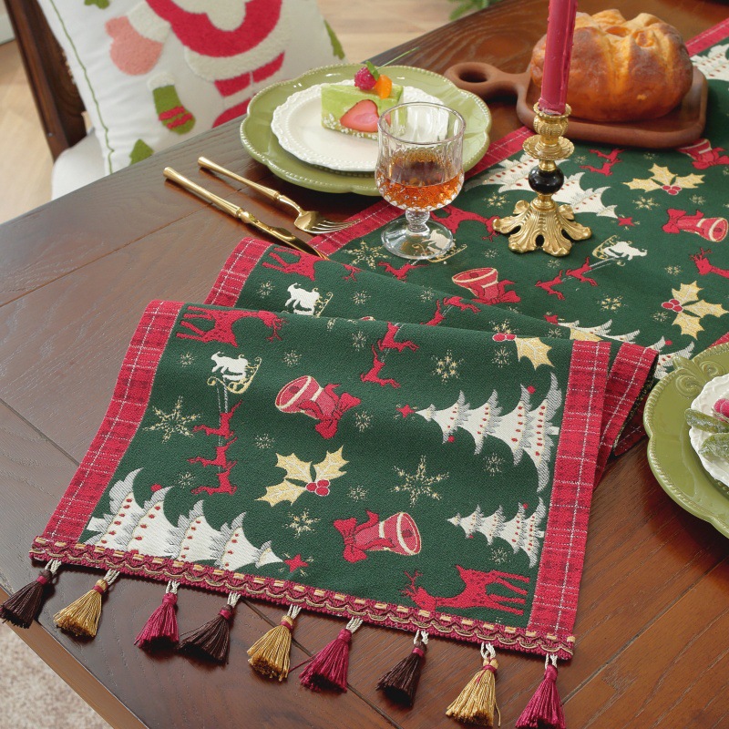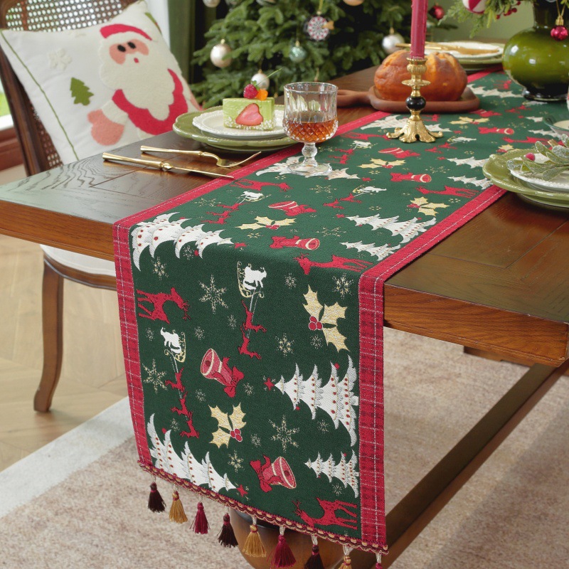 新款外贸跨境圣诞桌旗雪花餐厅装饰餐旗流苏提花餐柜盖巾床尾旗
