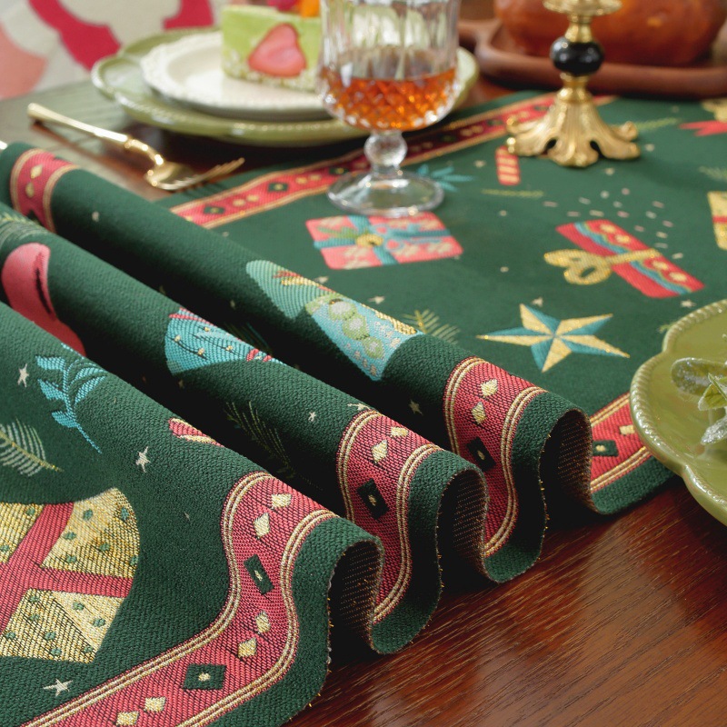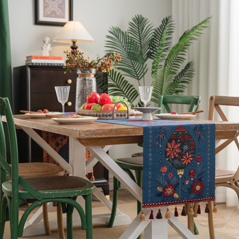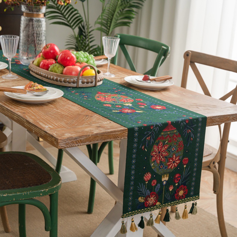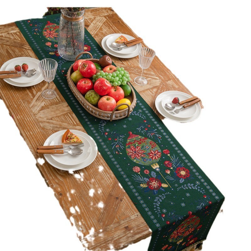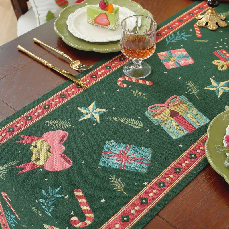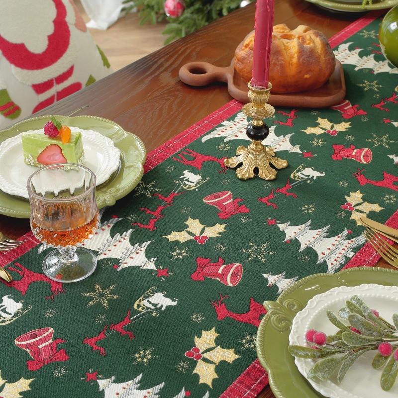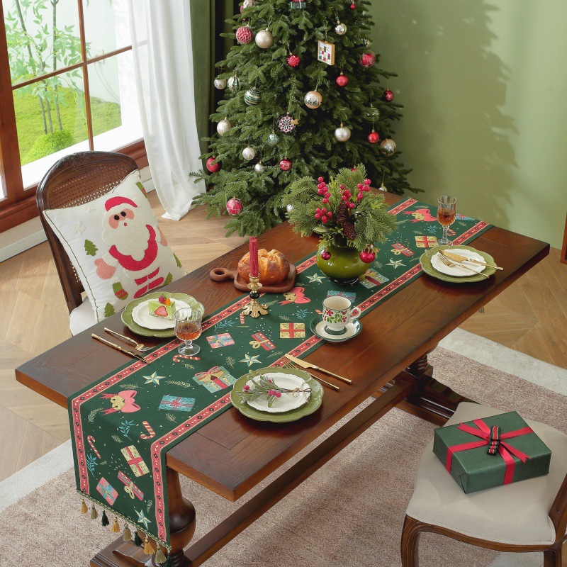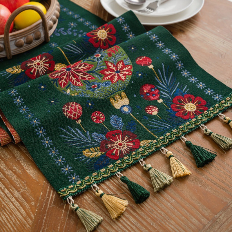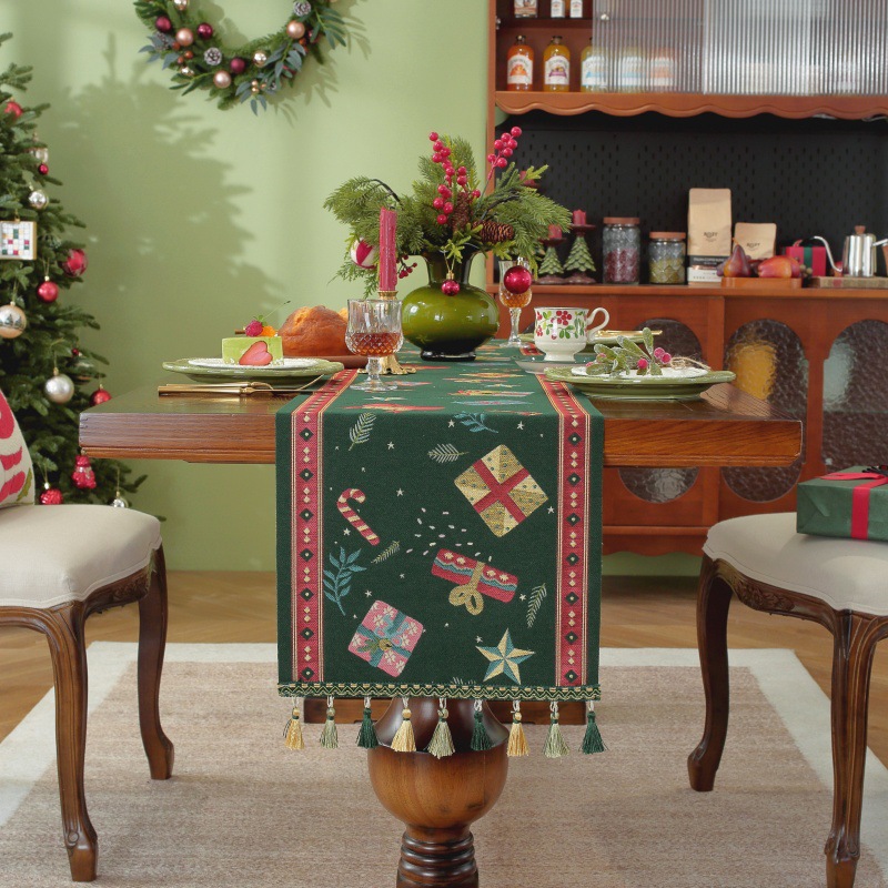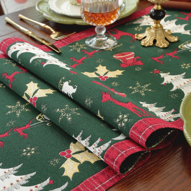 新款外贸跨境圣诞桌旗雪花餐厅装饰餐旗流苏提花餐柜盖巾床尾旗