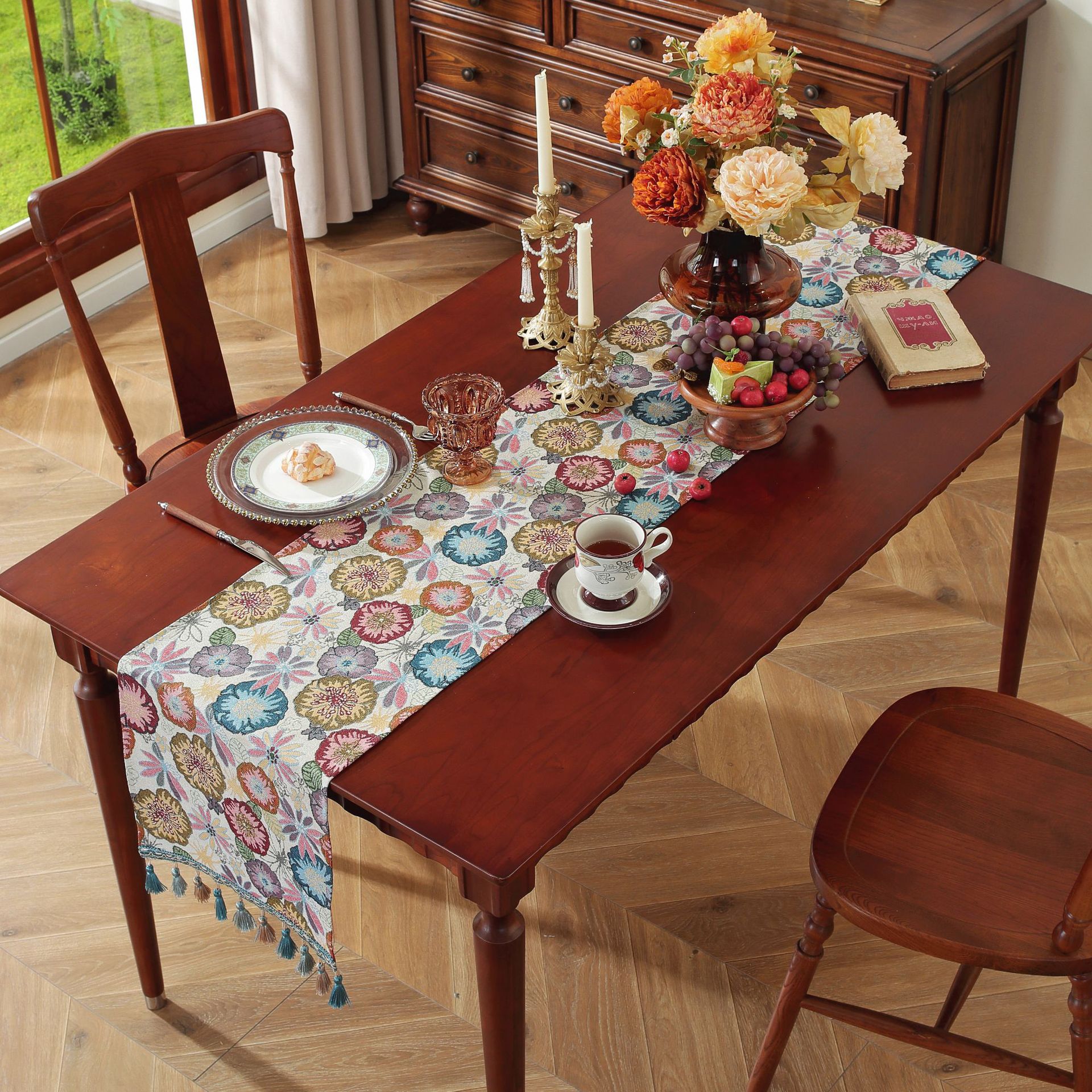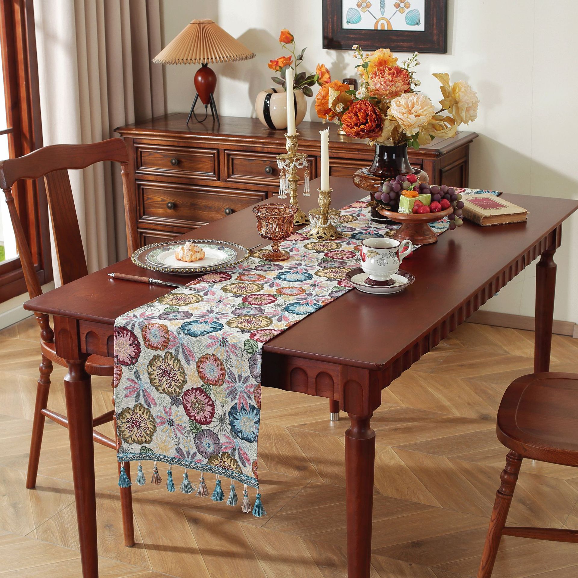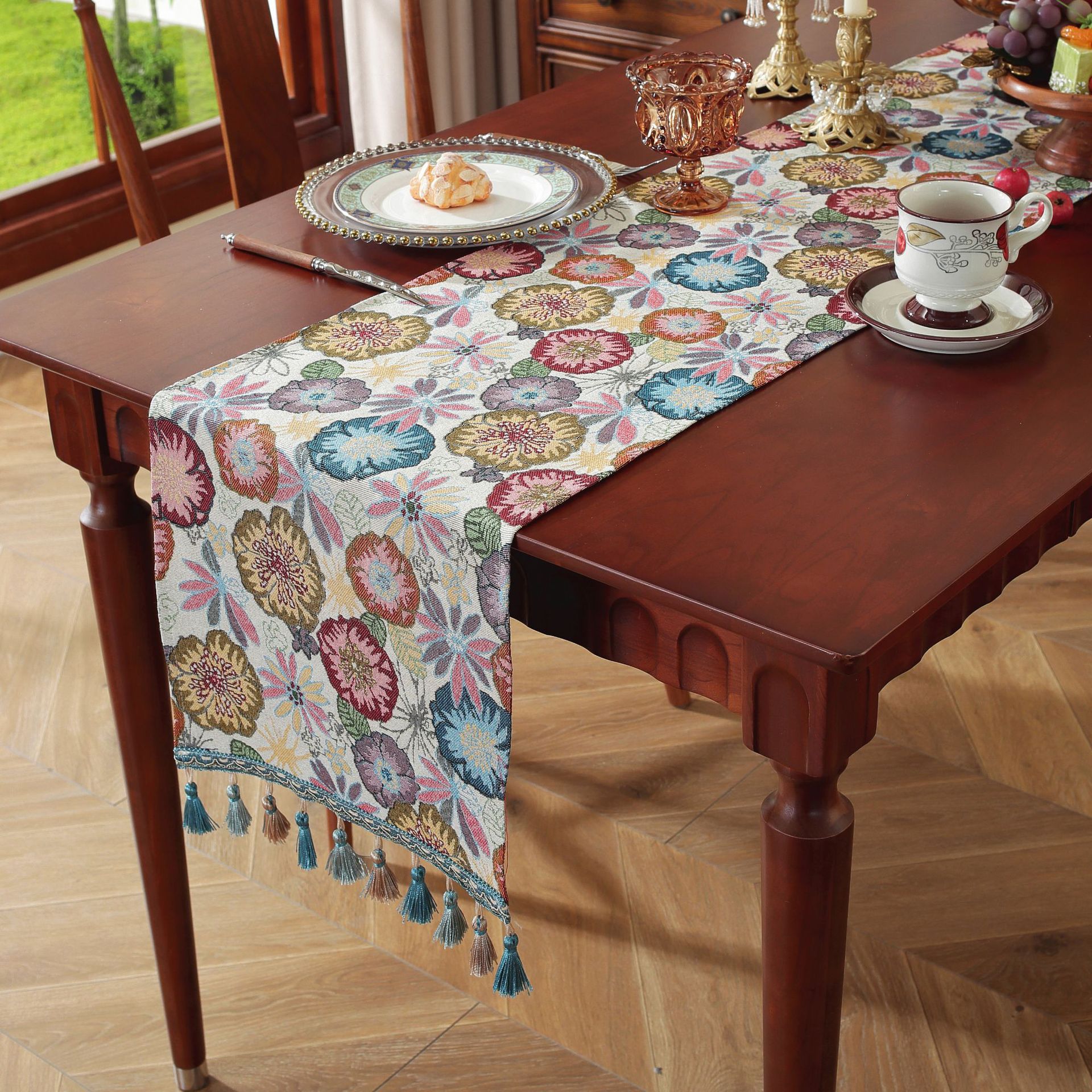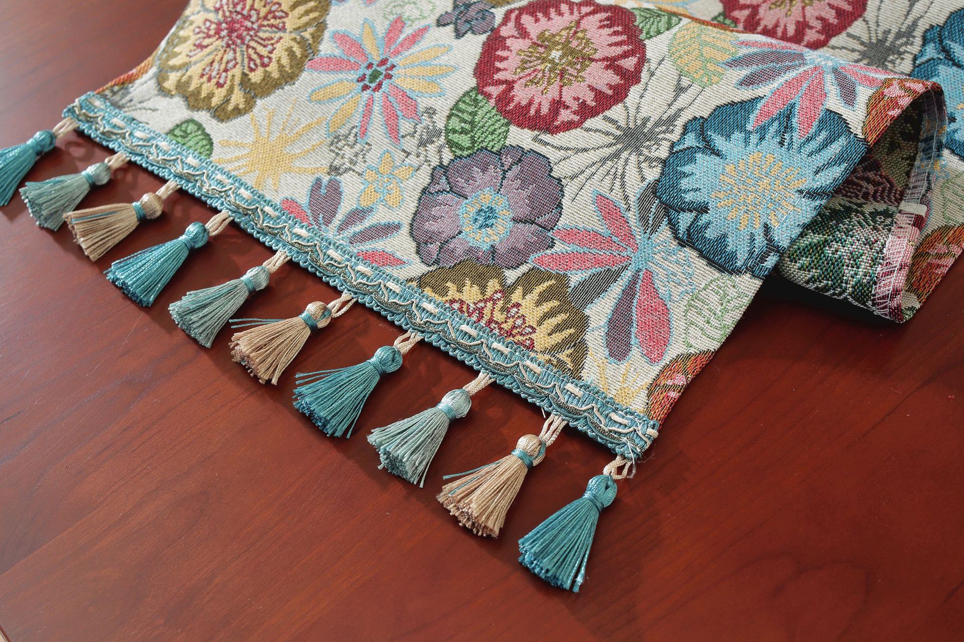 美式复古桌旗全涤色织提花茶几餐桌装饰电视柜盖巾床尾旗流苏