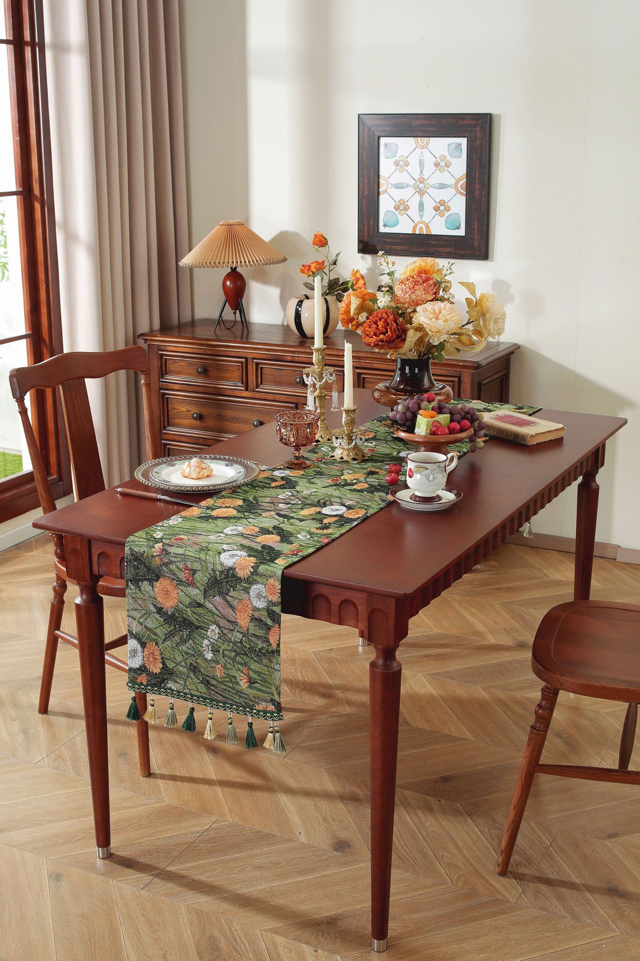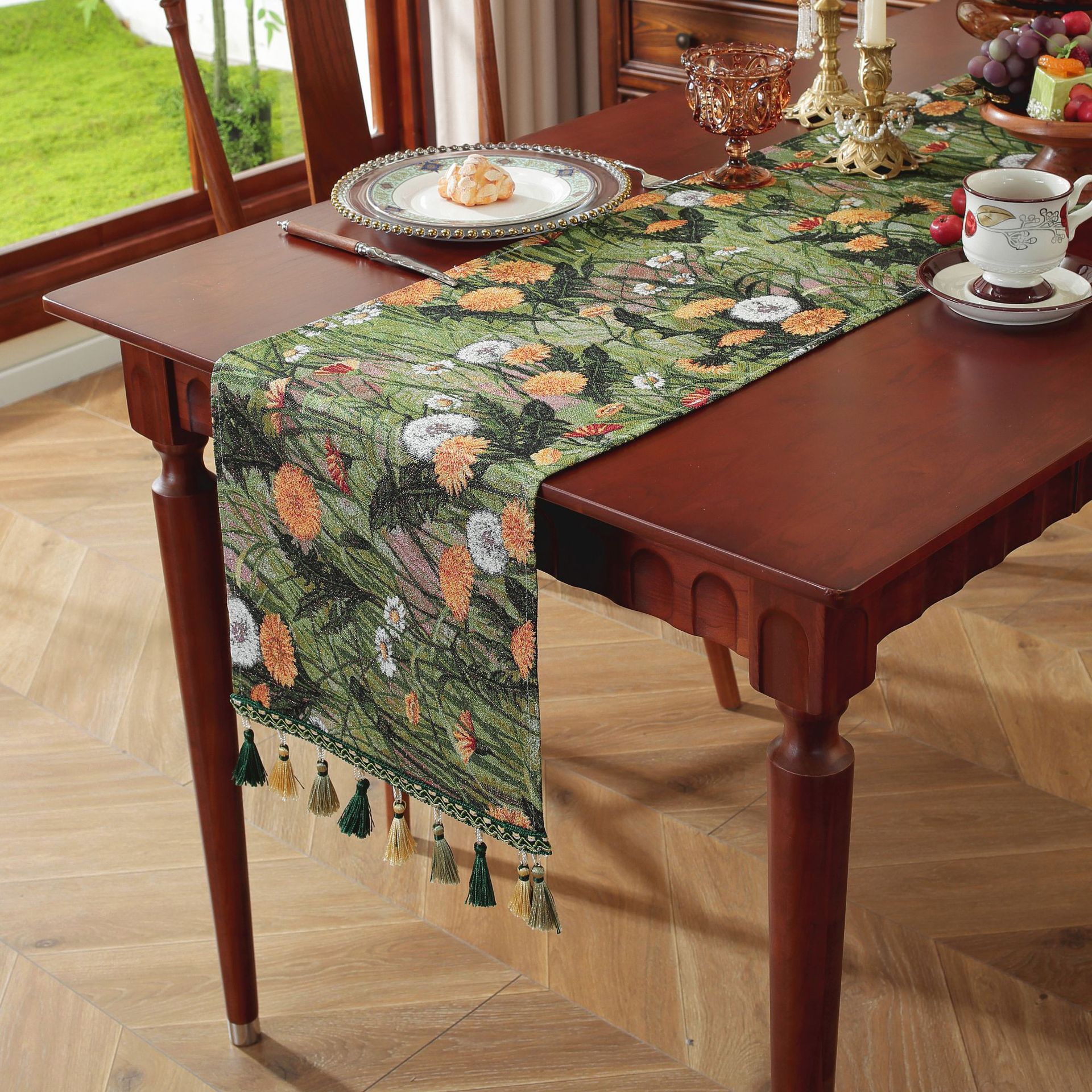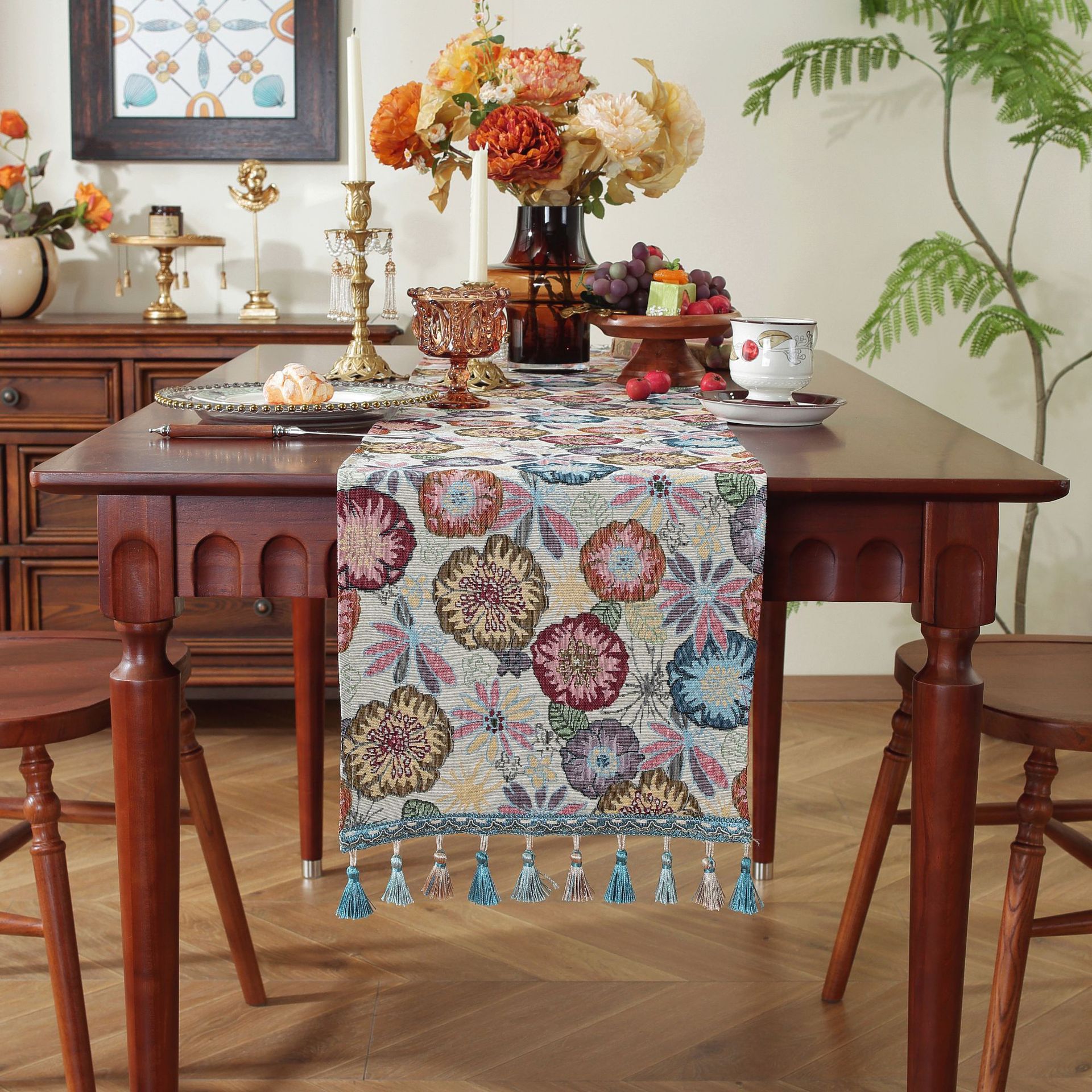 美式复古桌旗全涤色织提花茶几餐桌装饰电视柜盖巾床尾旗流苏