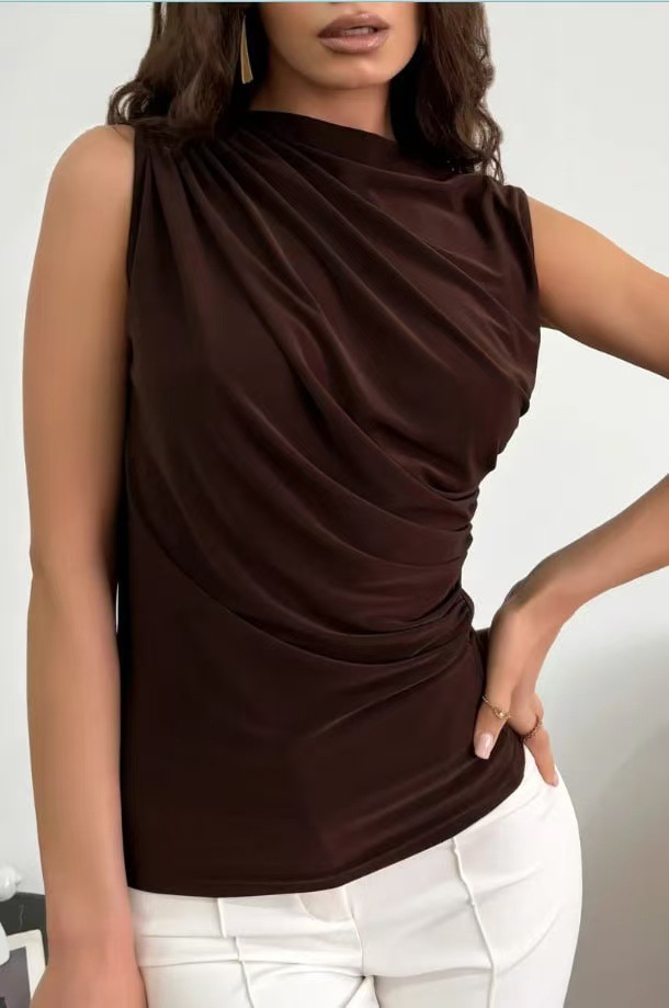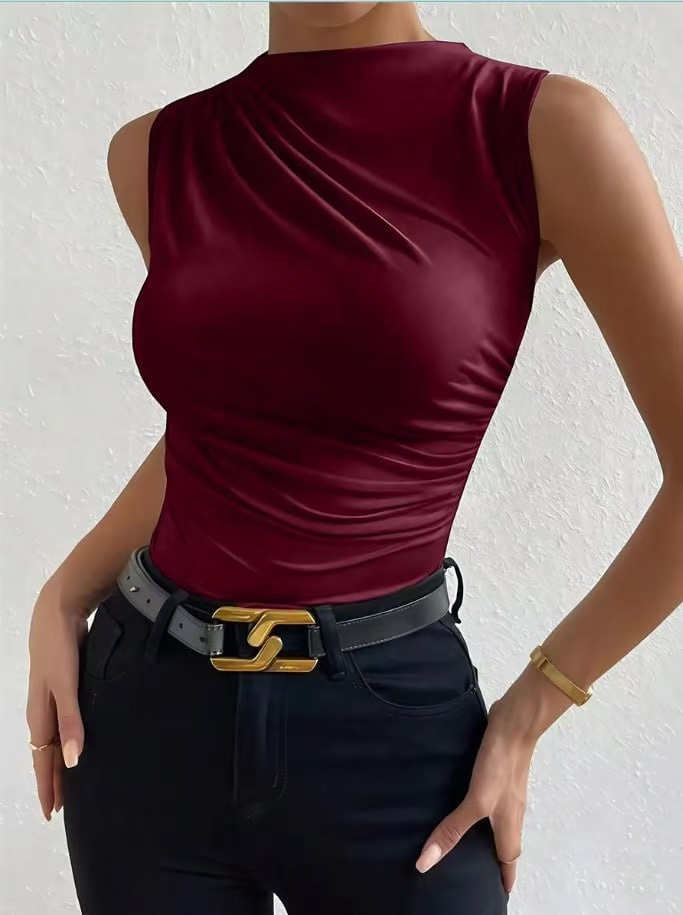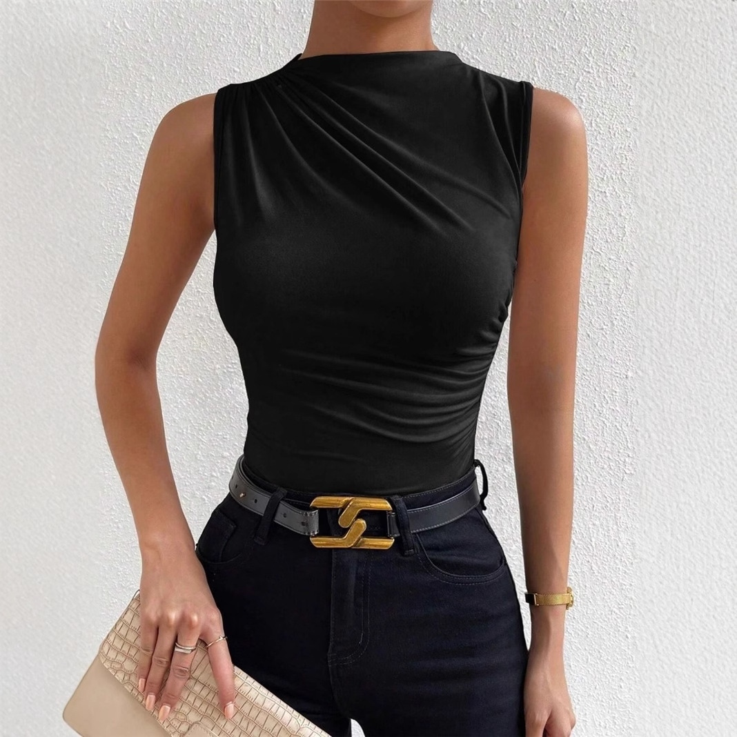 跨境欧美女2024春夏季新款 时尚百搭纯色褶皱无袖套头半高领T恤