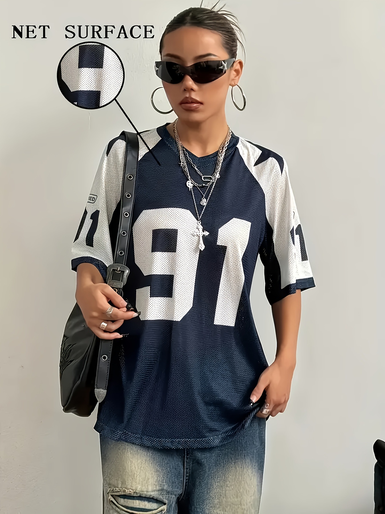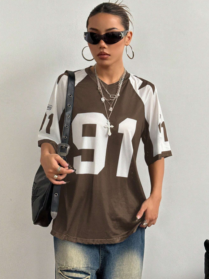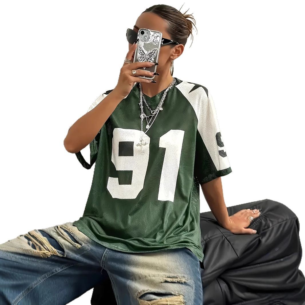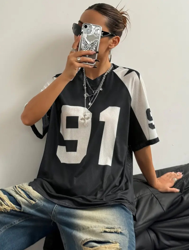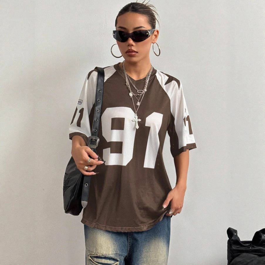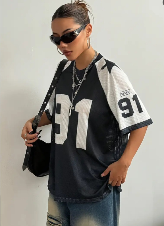 跨境亚马逊运动风数字印花撞色拼接网眼短袖t恤球衣宽松上衣