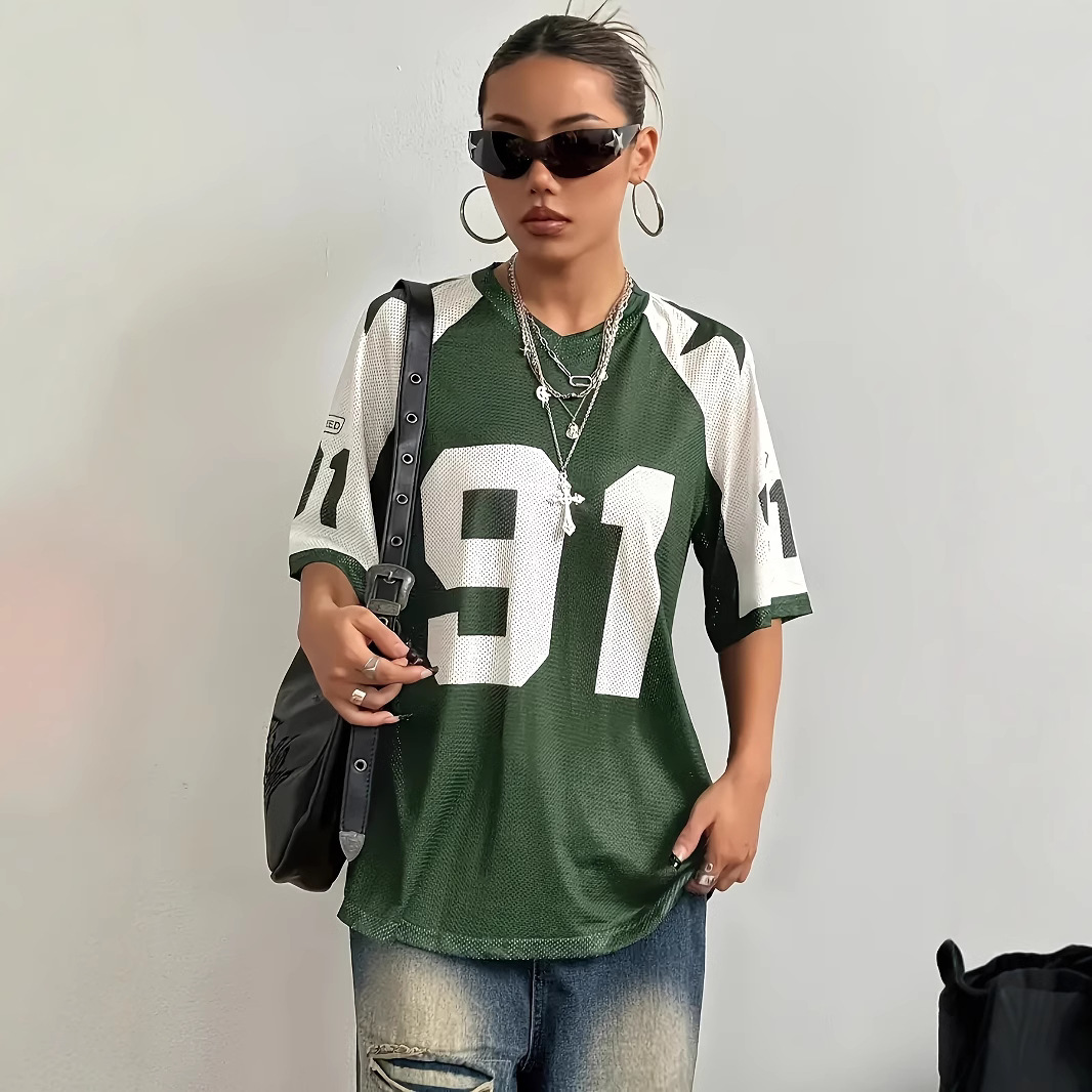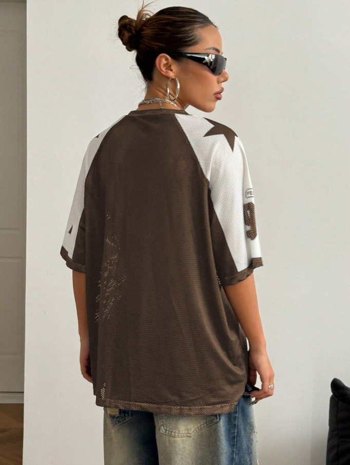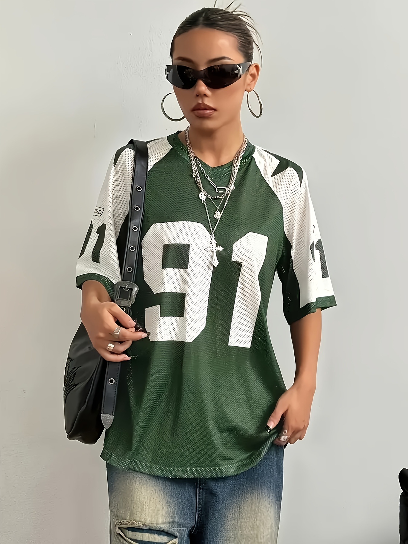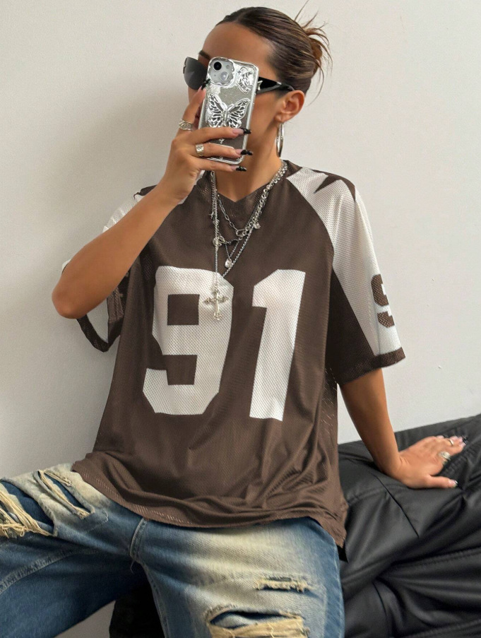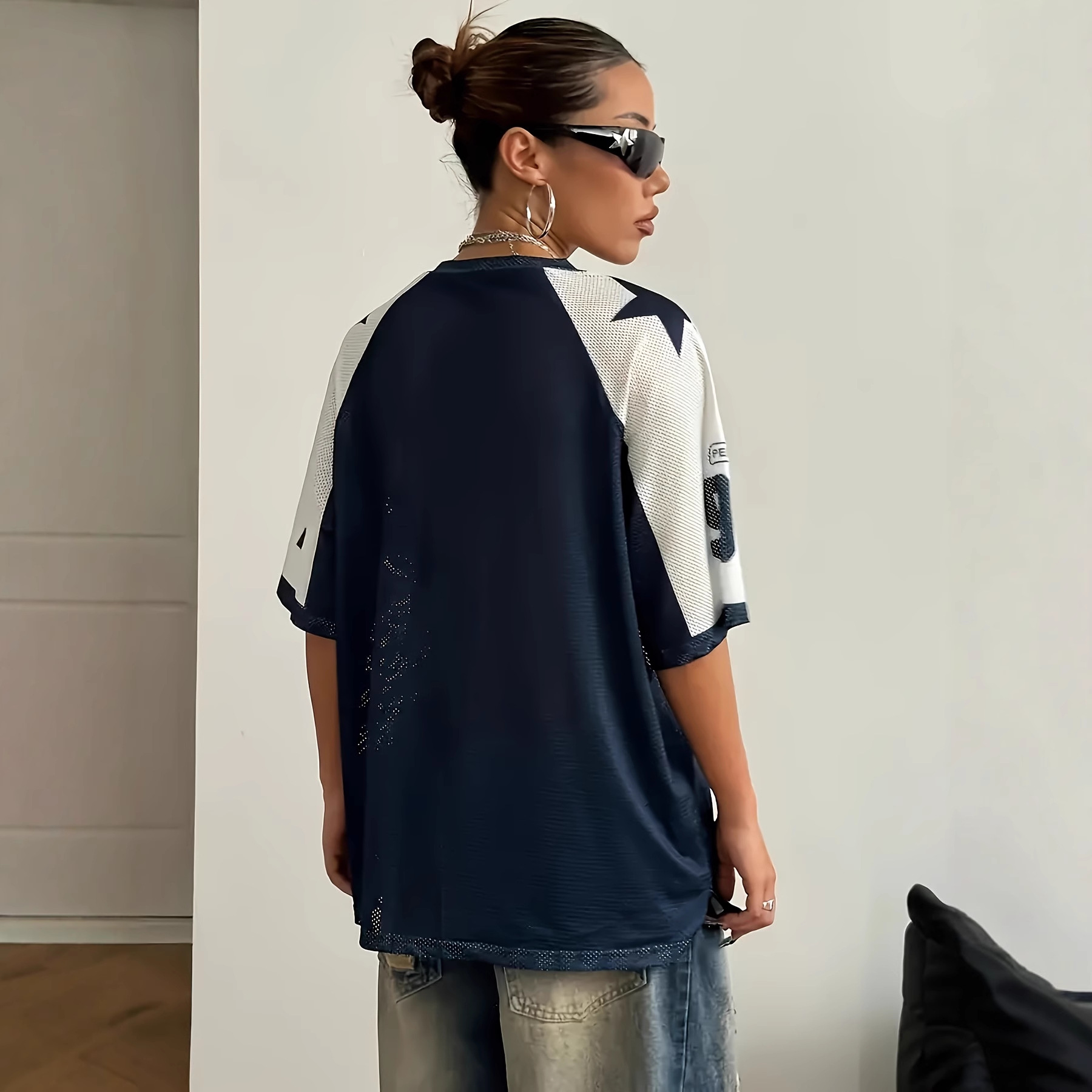 跨境亚马逊运动风数字印花撞色拼接网眼短袖t恤球衣宽松上衣