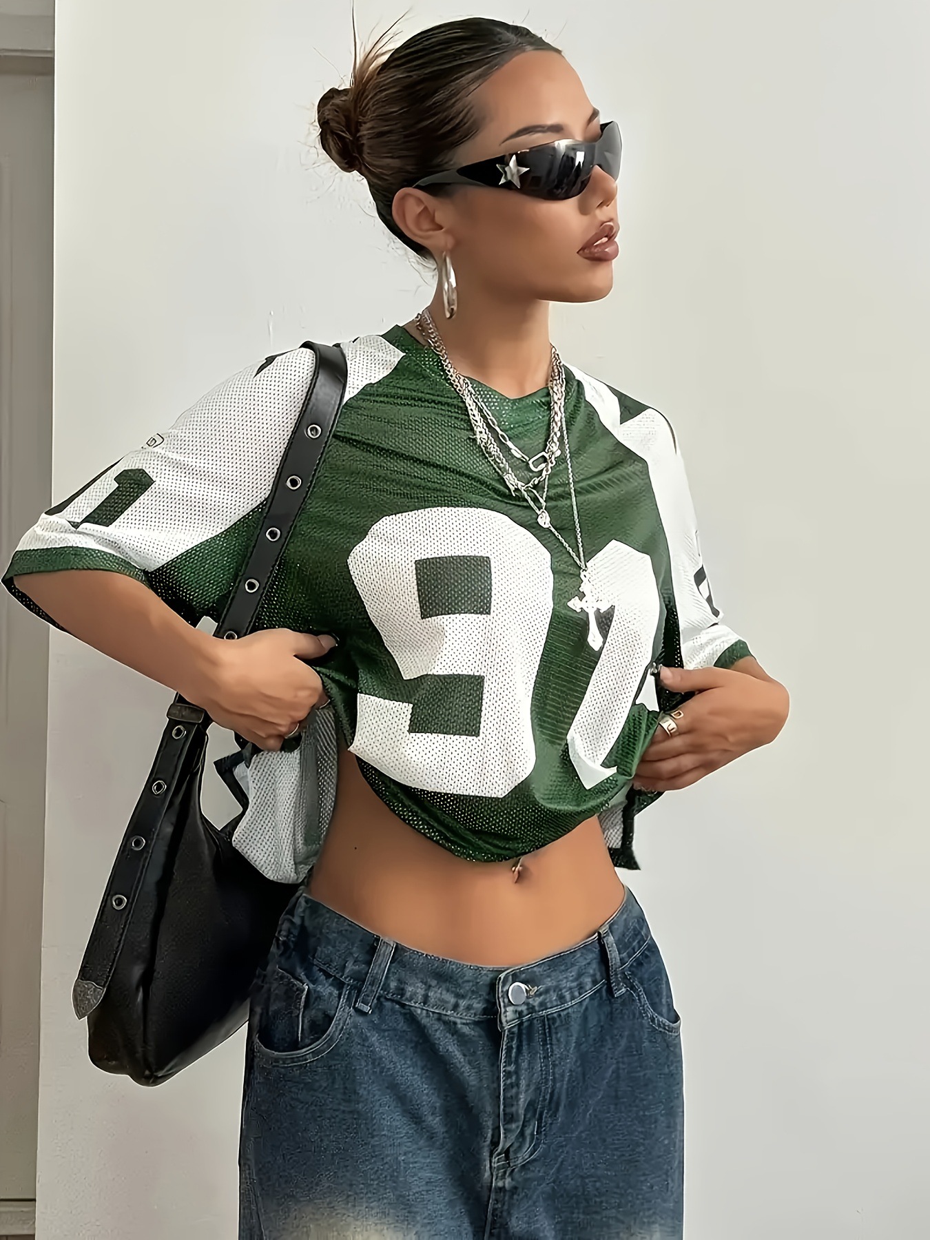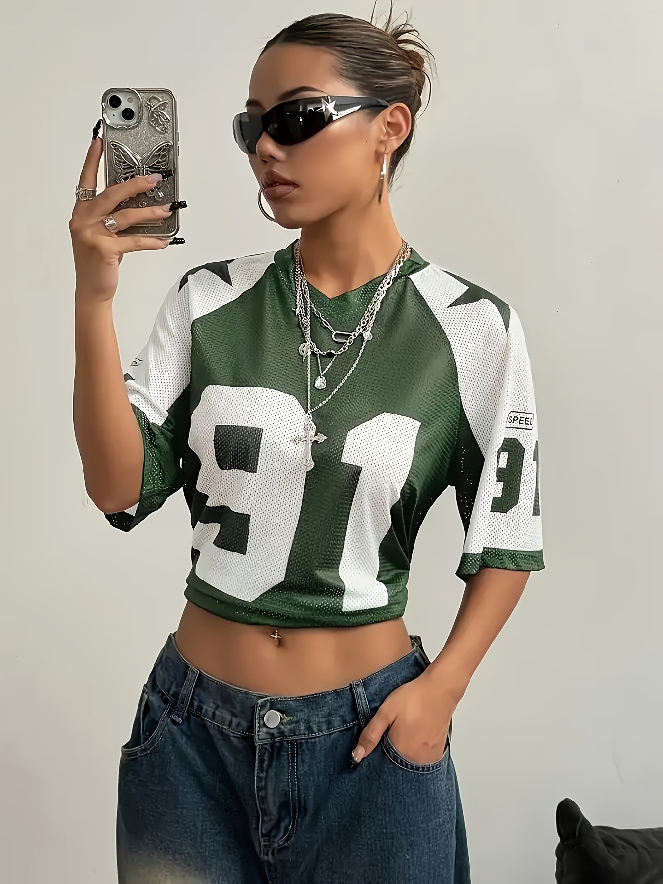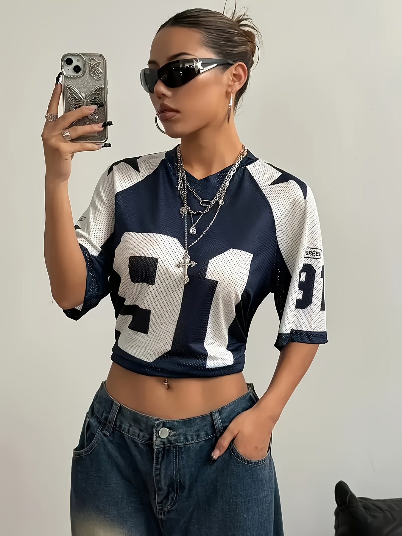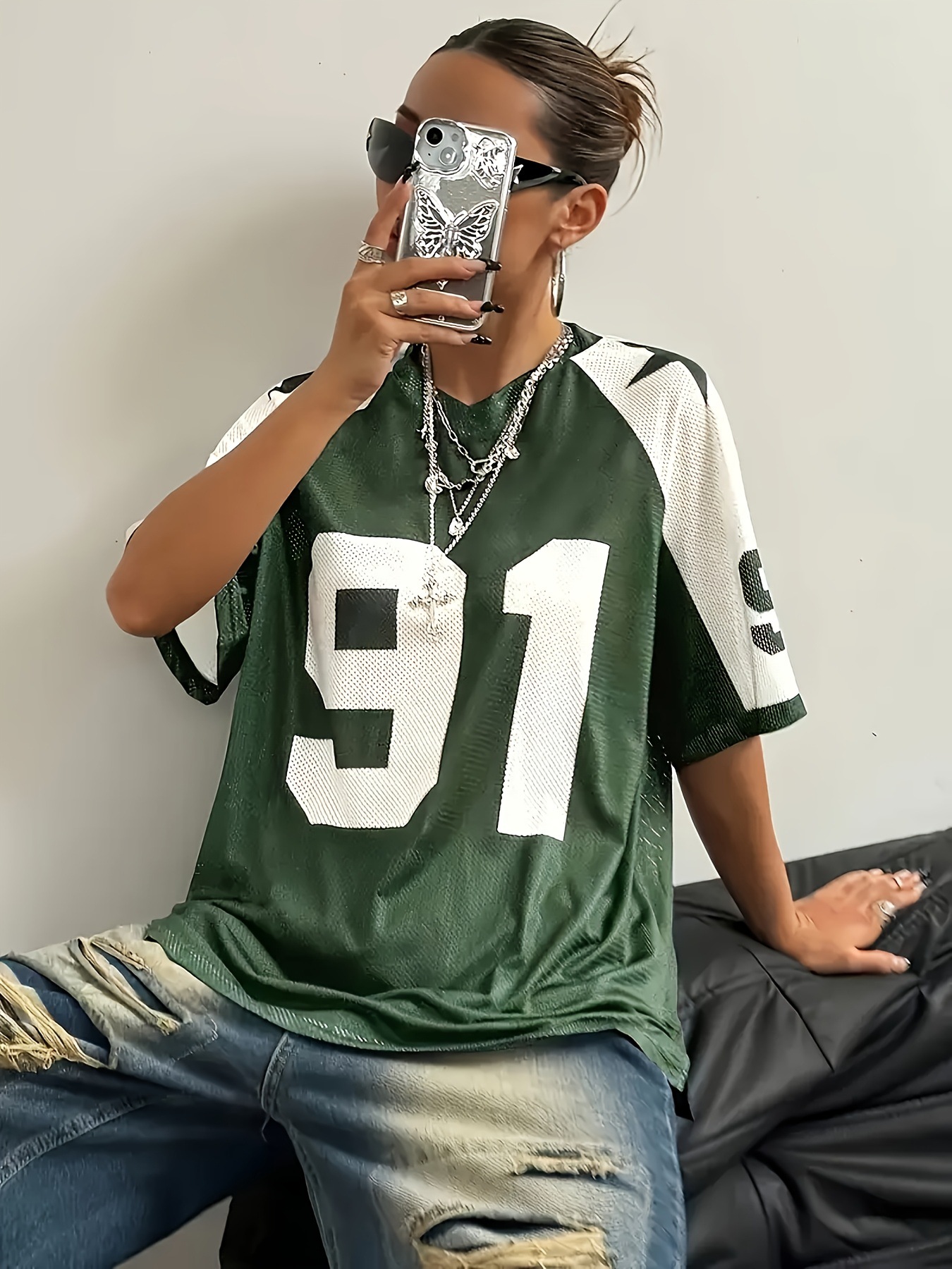 跨境亚马逊运动风数字印花撞色拼接网眼短袖t恤球衣宽松上衣
