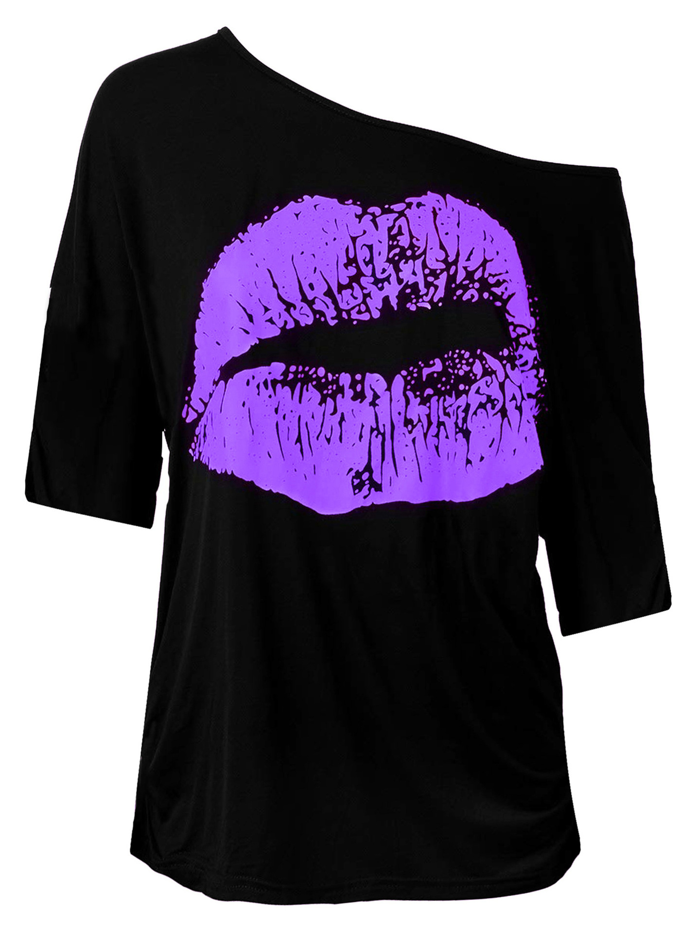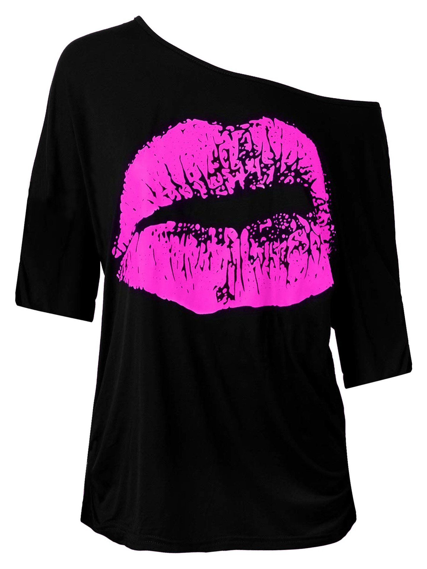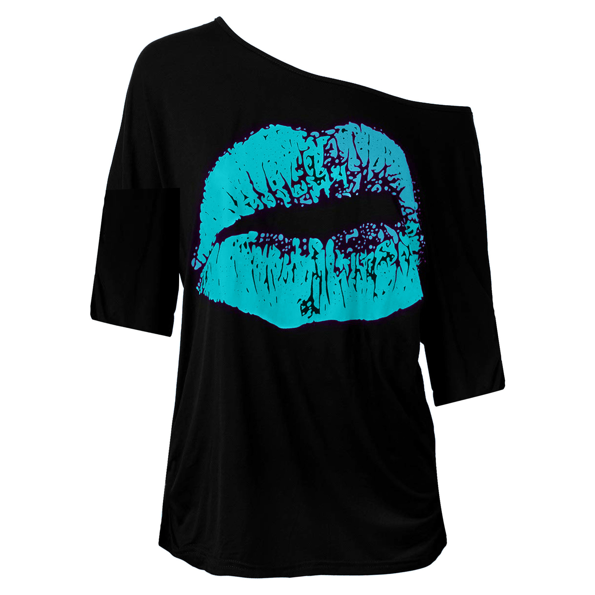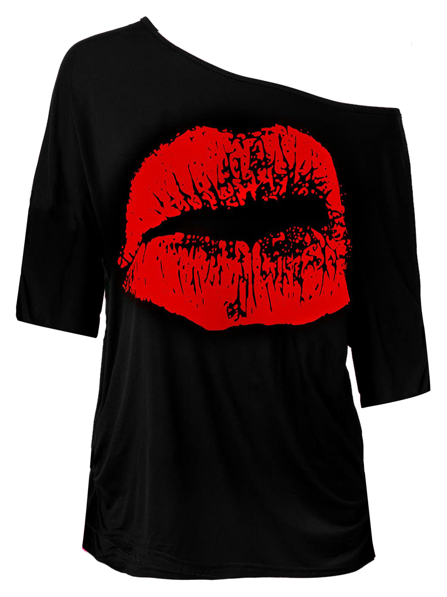 亚马逊欧美春秋女跨境怀旧大嘴唇印花80 年代服装女斜肩T恤