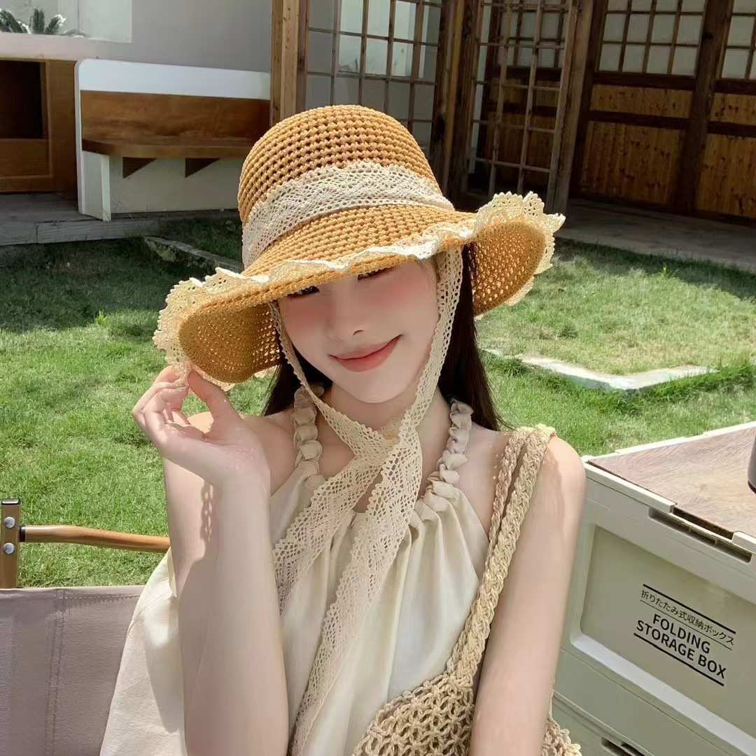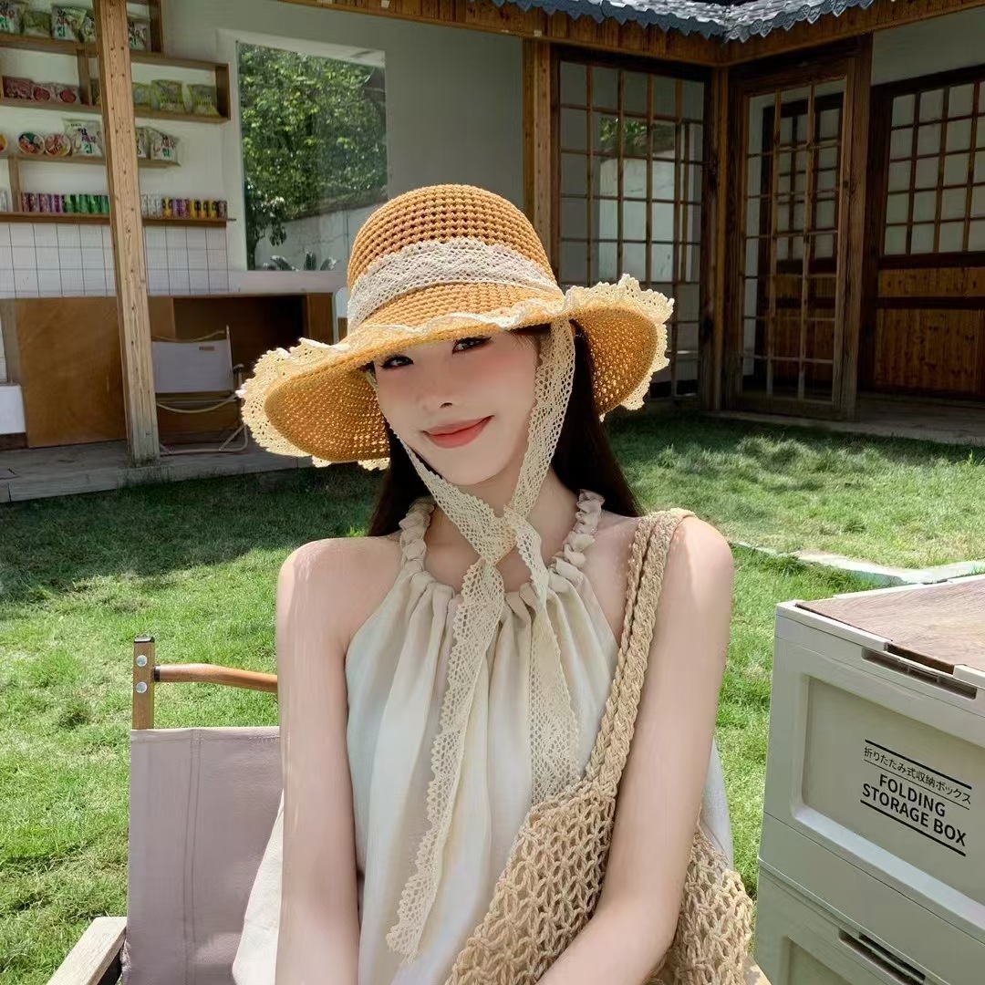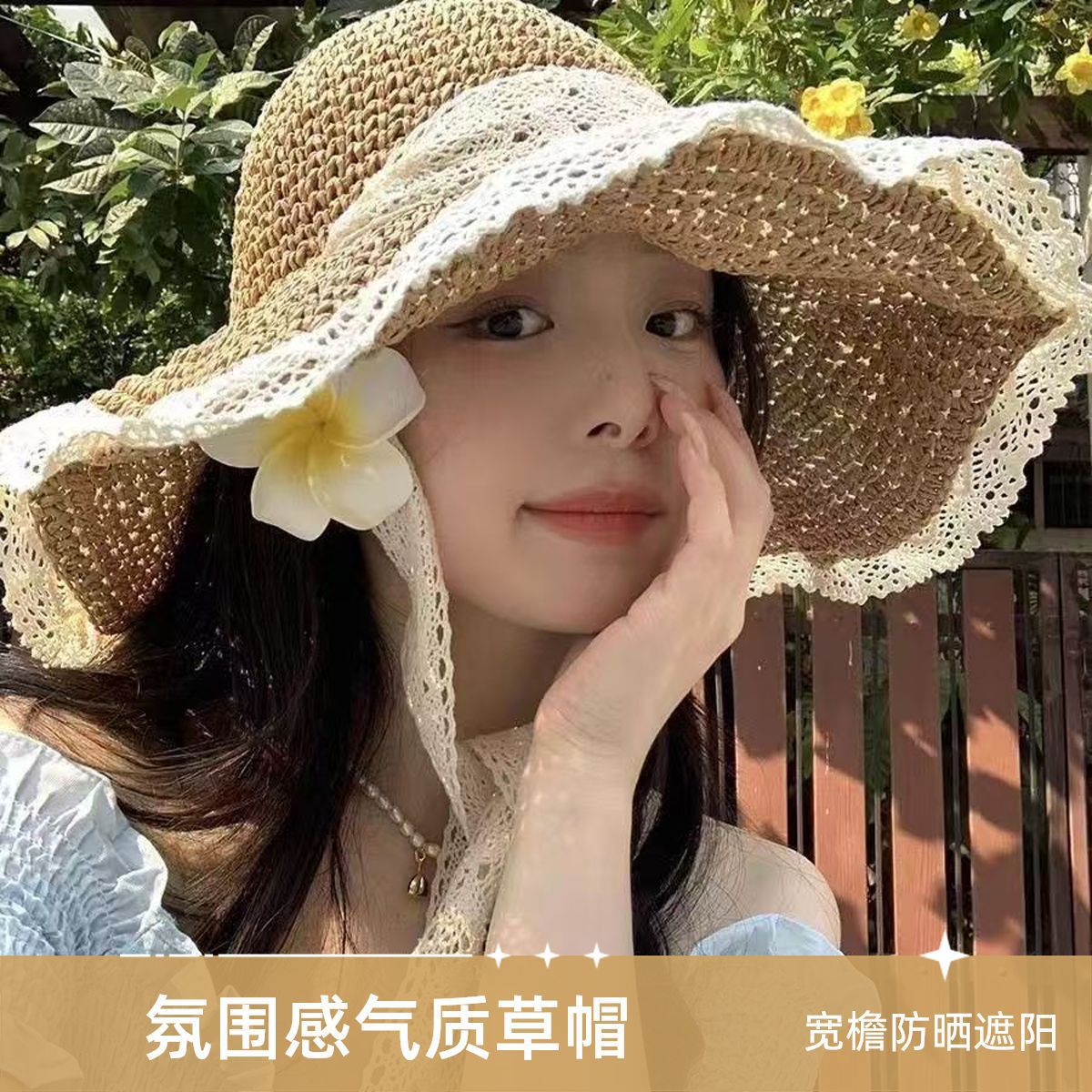 ins草帽海边帽子系带草编帽女夏出游防晒沙滩太阳帽蕾丝边遮阳帽