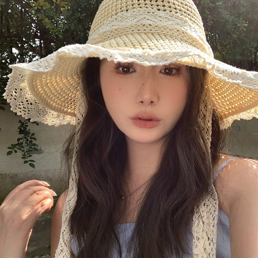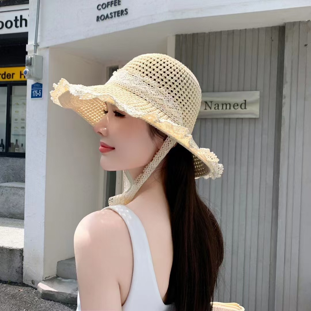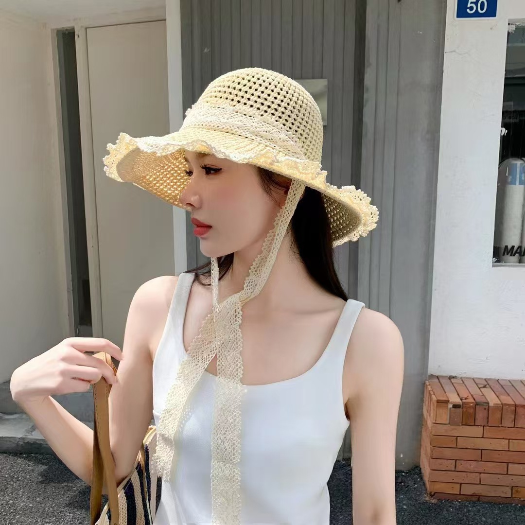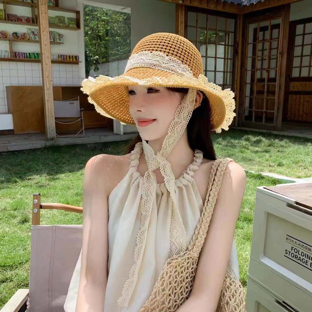 ins草帽海边帽子系带草编帽女夏出游防晒沙滩太阳帽蕾丝边遮阳帽