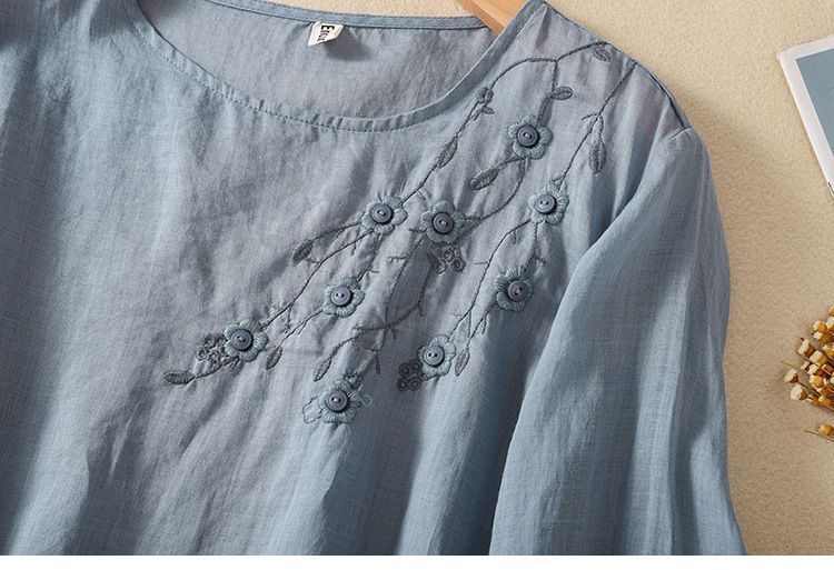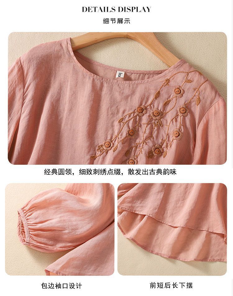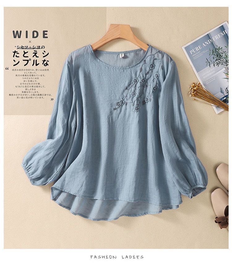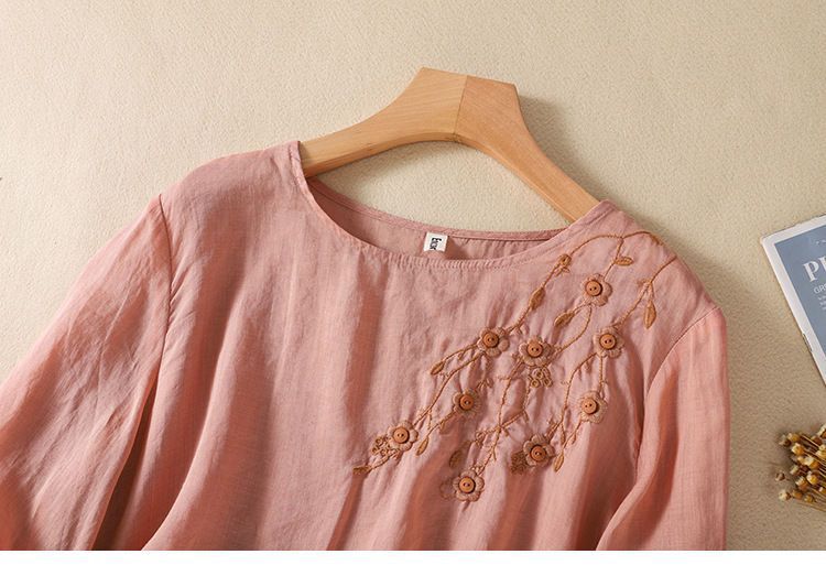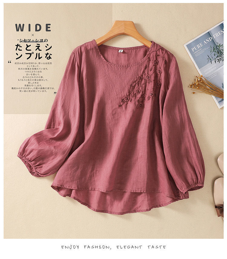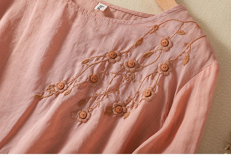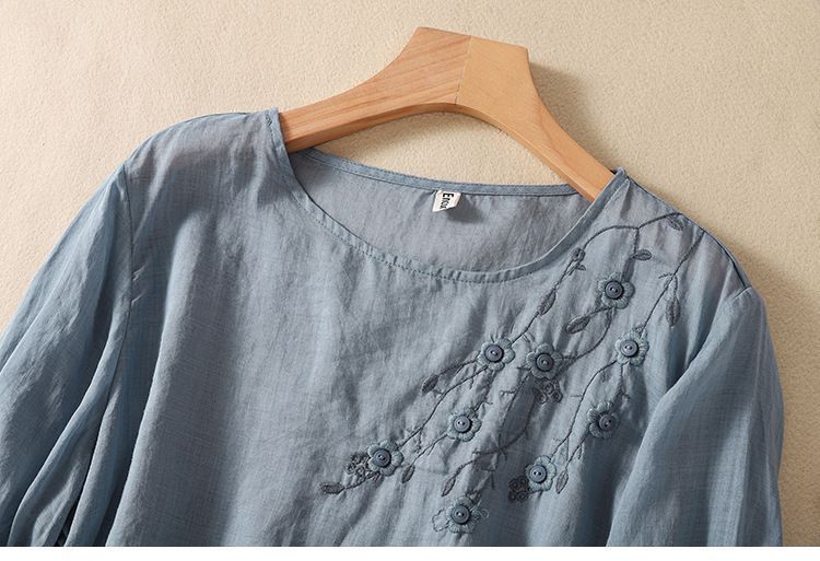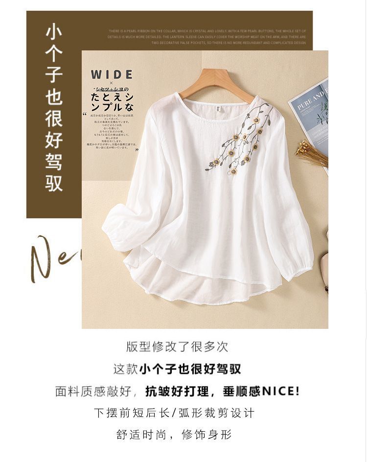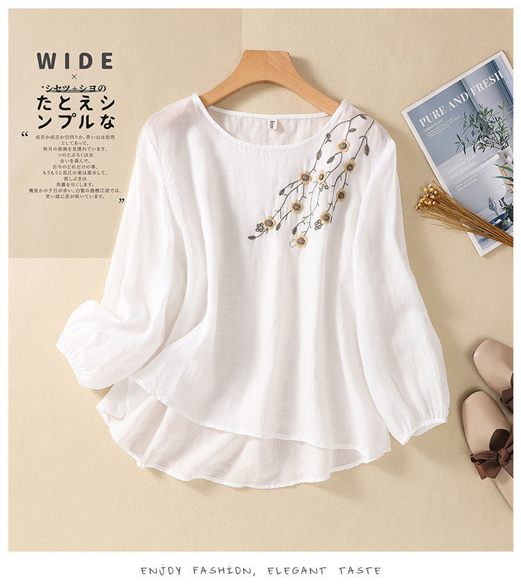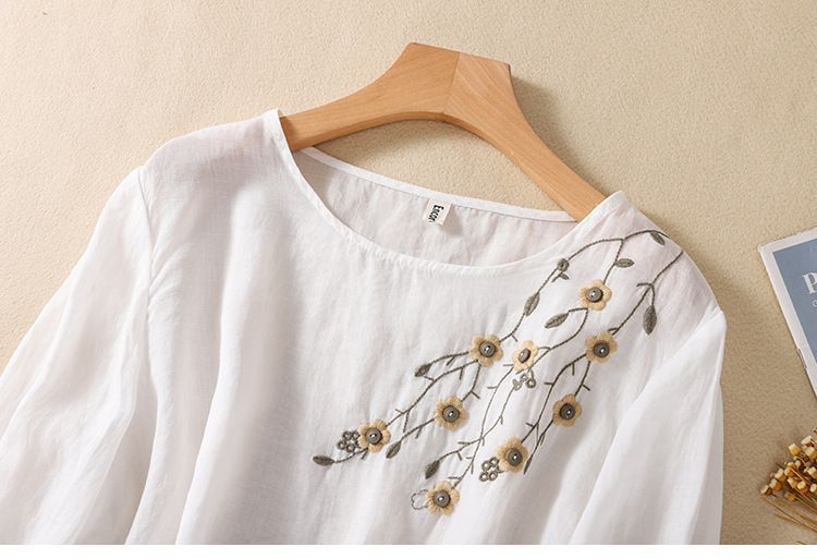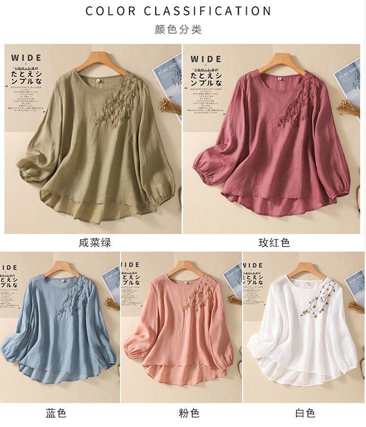 棉质】2023春夏新款刺绣圆领长袖T恤女复古文艺宽松套头绣花上衣