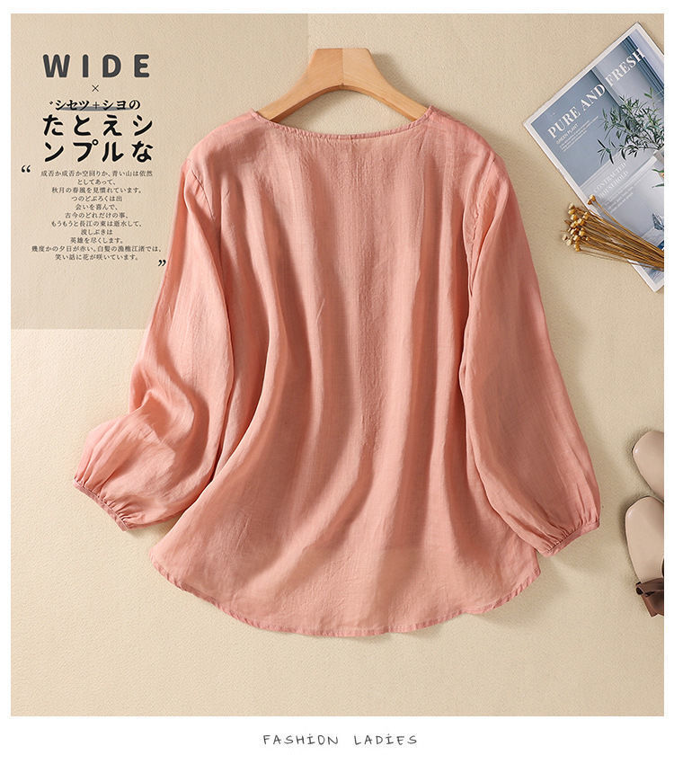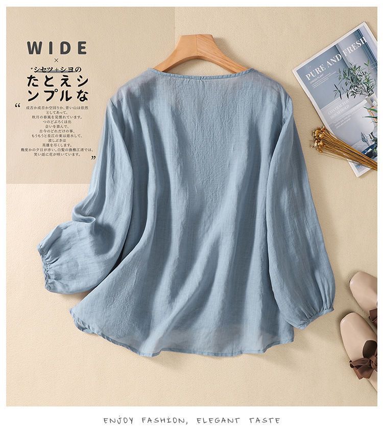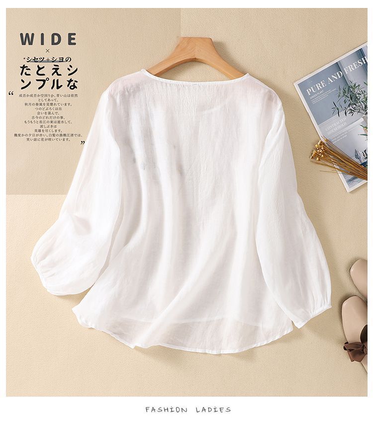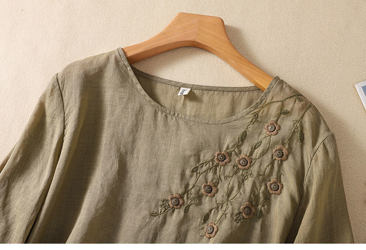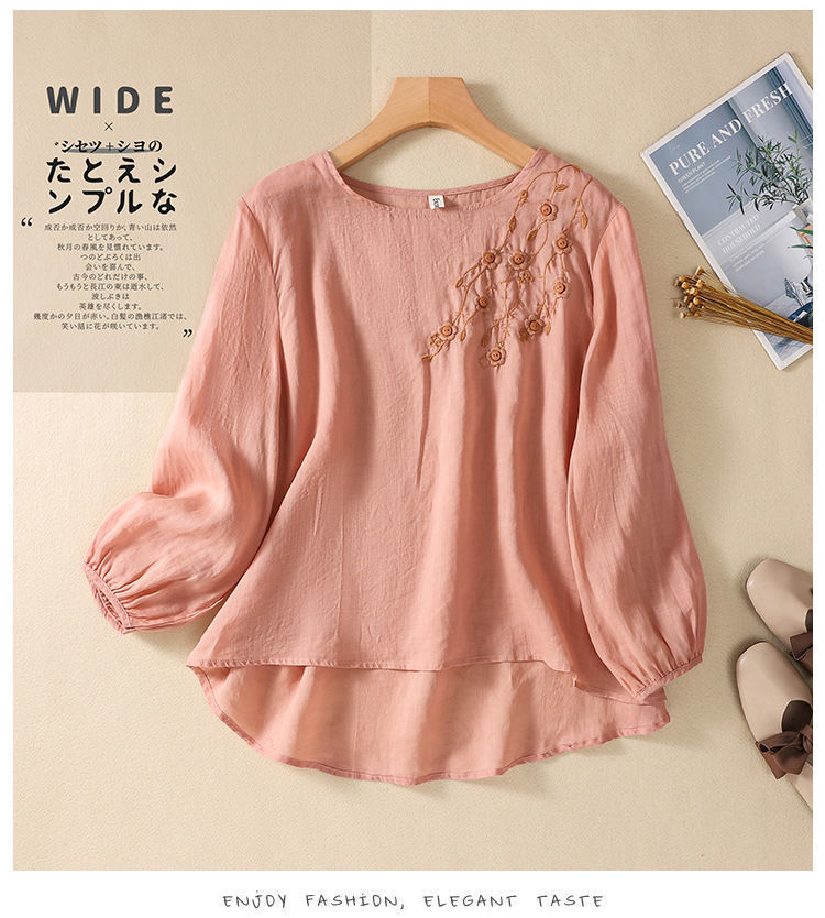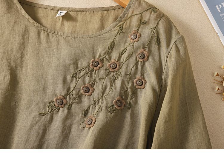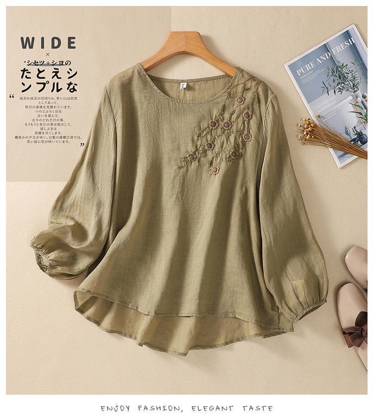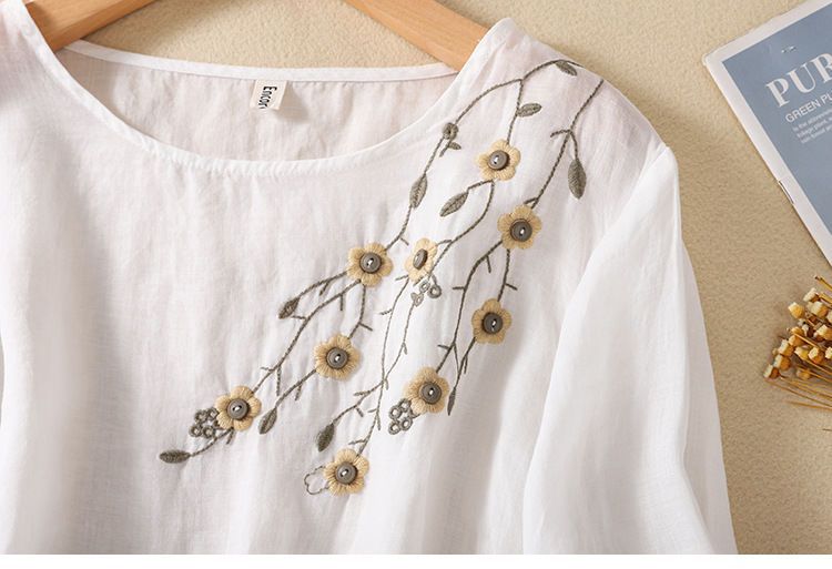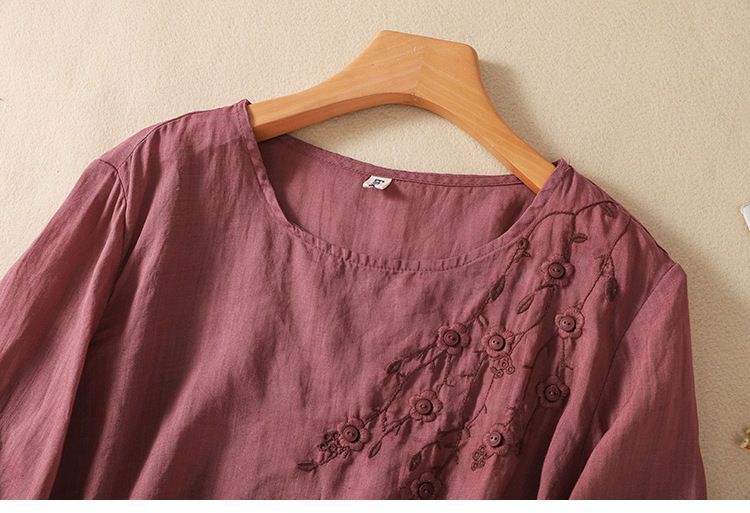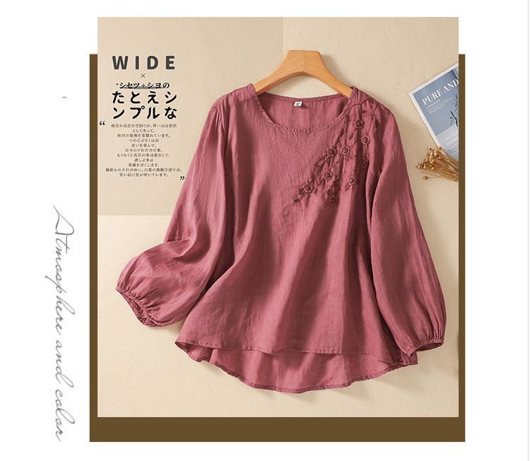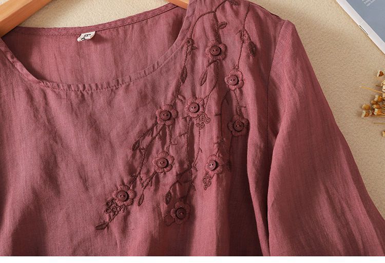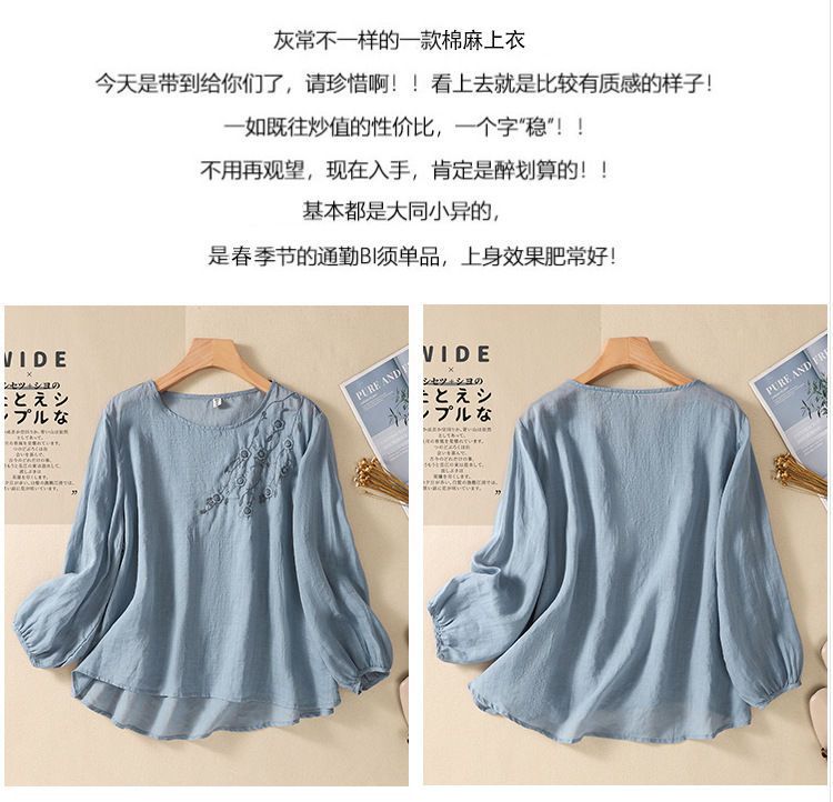 棉质】2023春夏新款刺绣圆领长袖T恤女复古文艺宽松套头绣花上衣