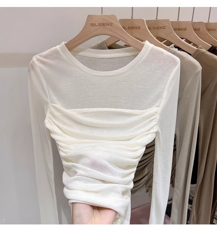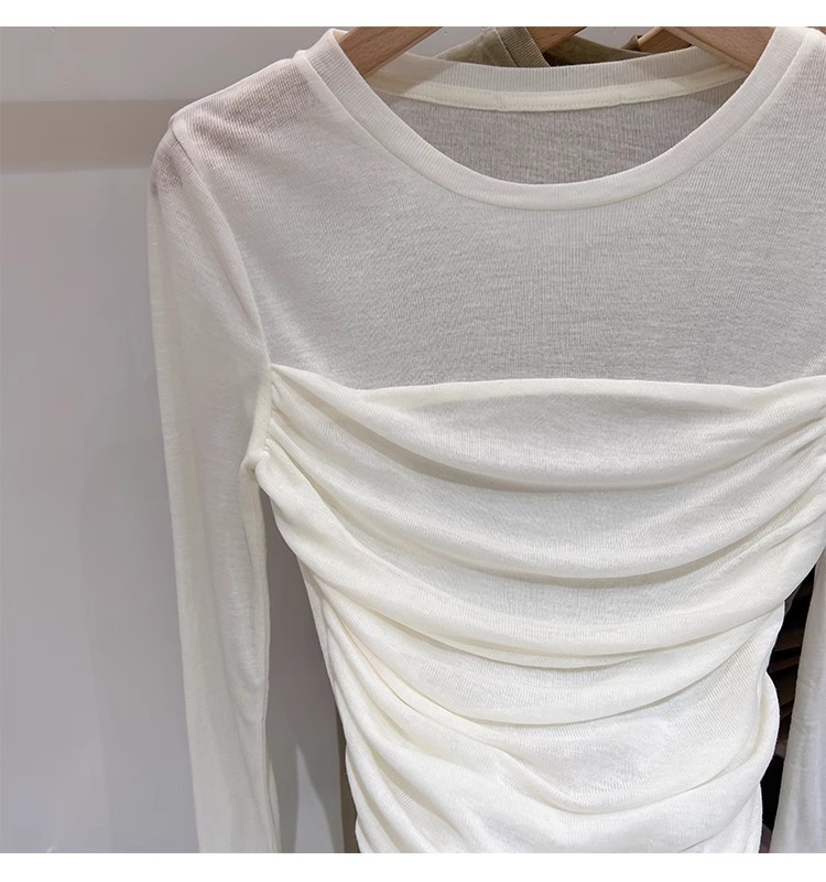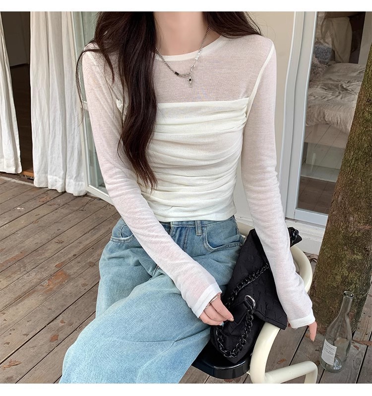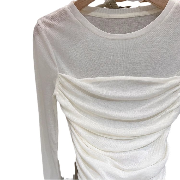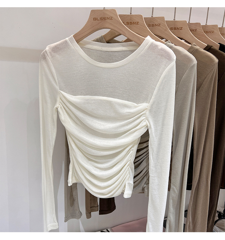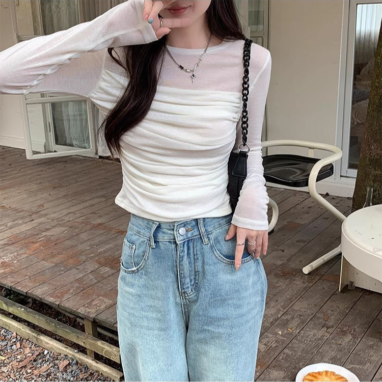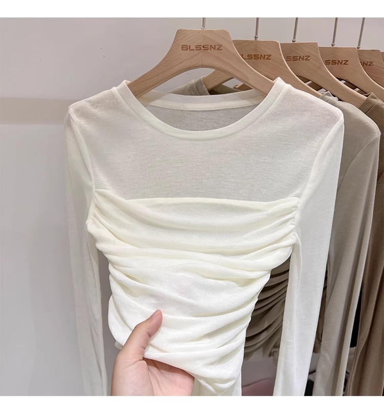 网纱长袖t恤女春夏款设计感小众褶皱修身打底衫短款长袖上衣潮入