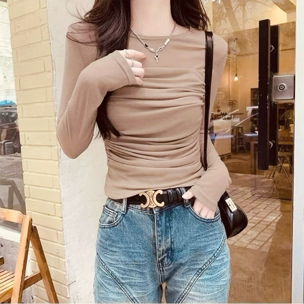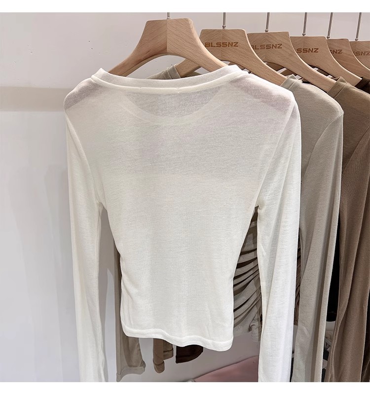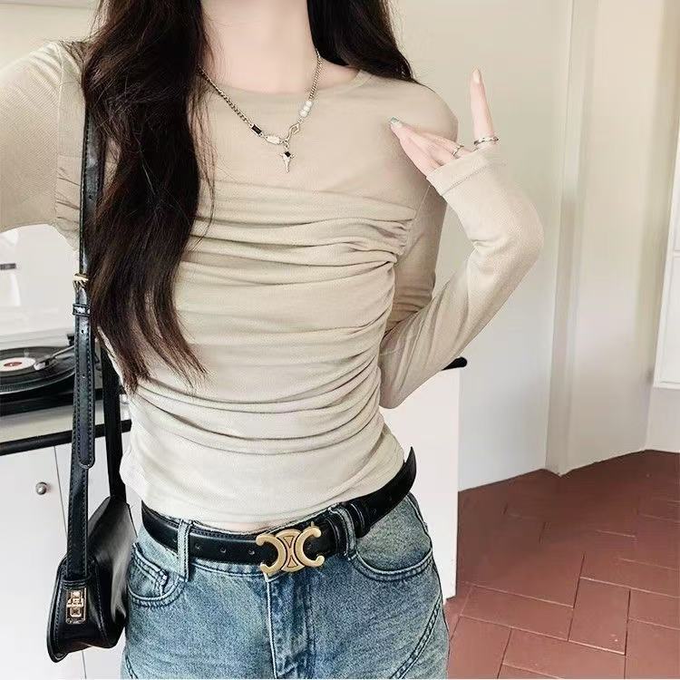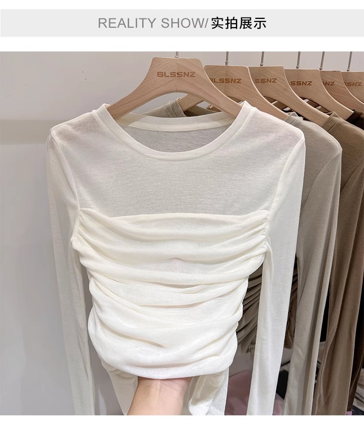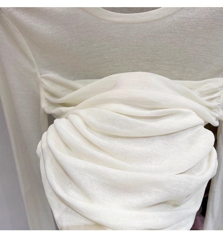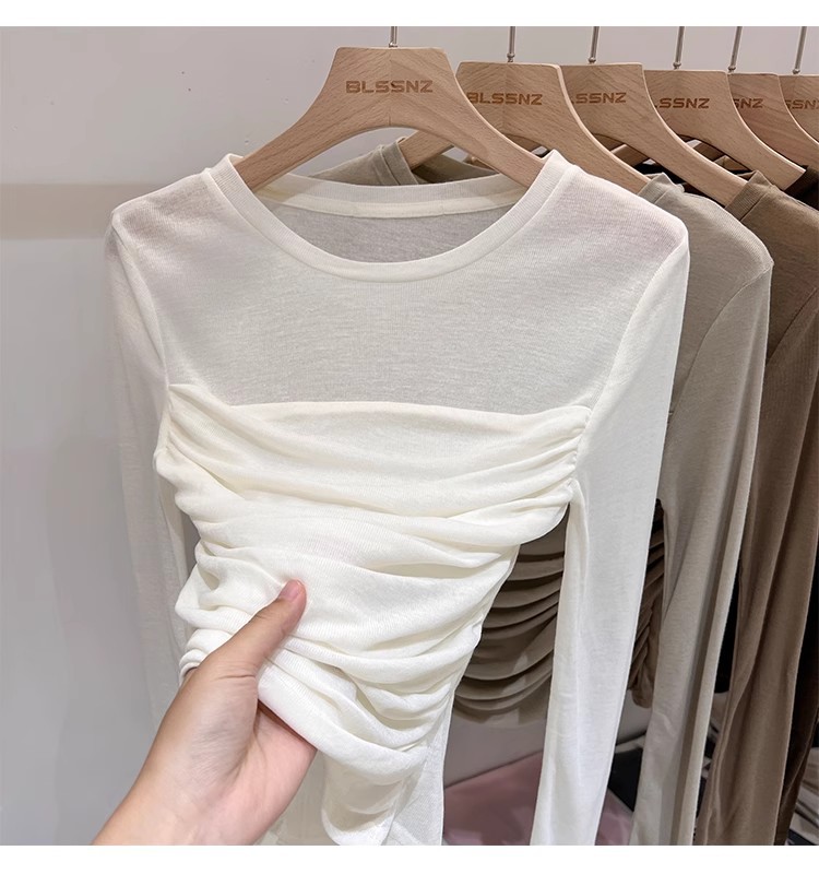 网纱长袖t恤女春夏款设计感小众褶皱修身打底衫短款长袖上衣潮入