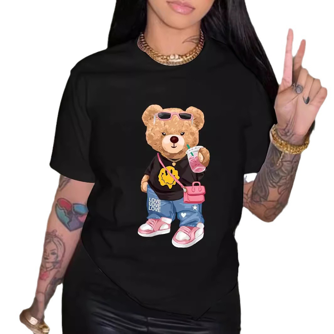 外贸现货夏季印花时尚酷炫小熊印花T恤短袖圆领休闲上衣夏季女装