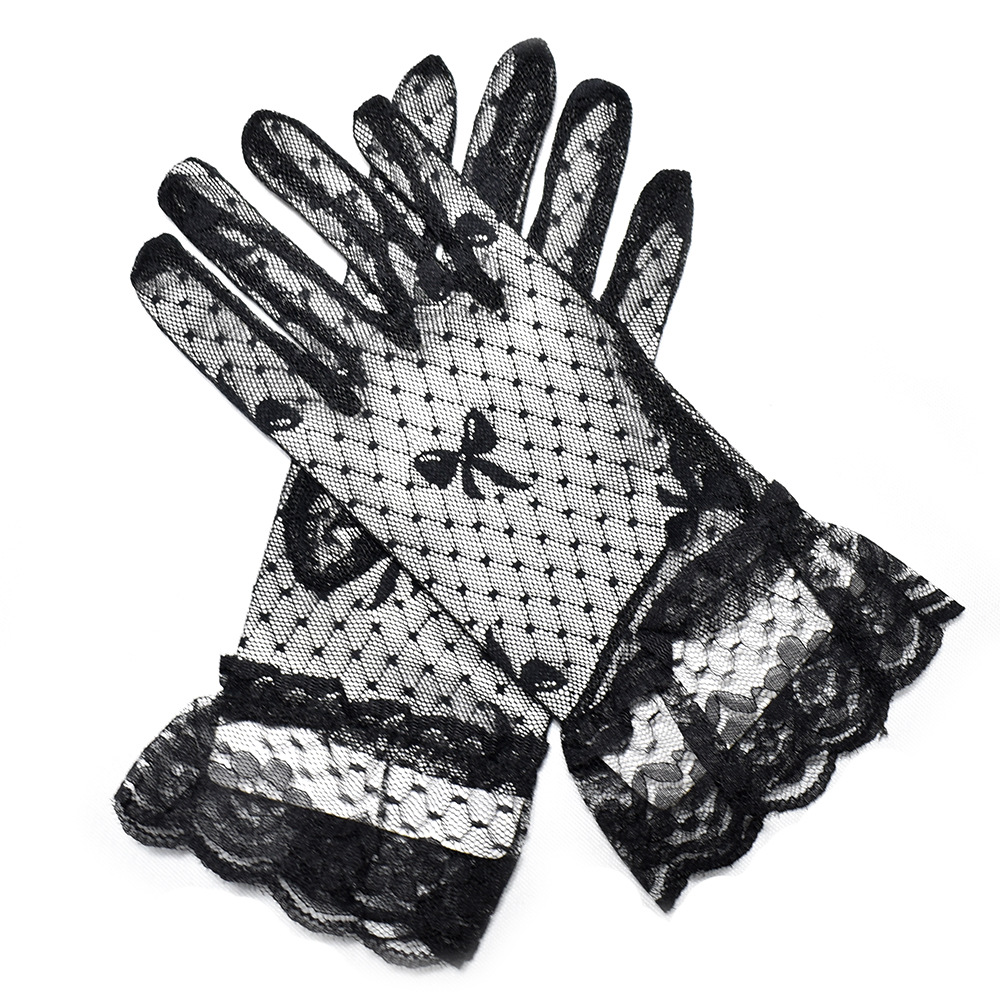 女士夏季防晒手套 格子网纱蝴蝶结创意 黑色蕾丝花边 礼仪手套女