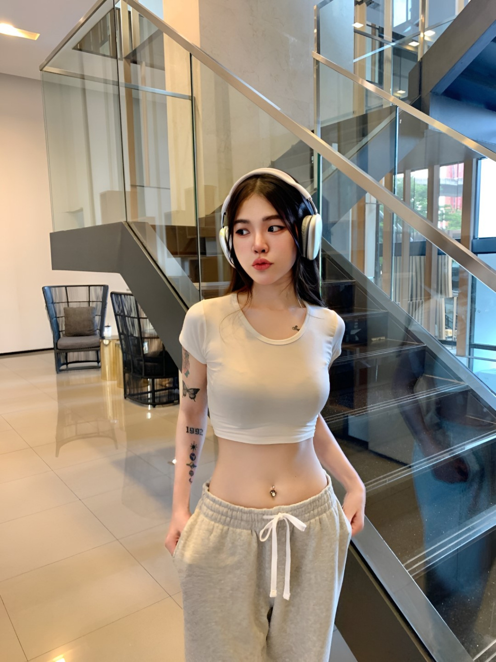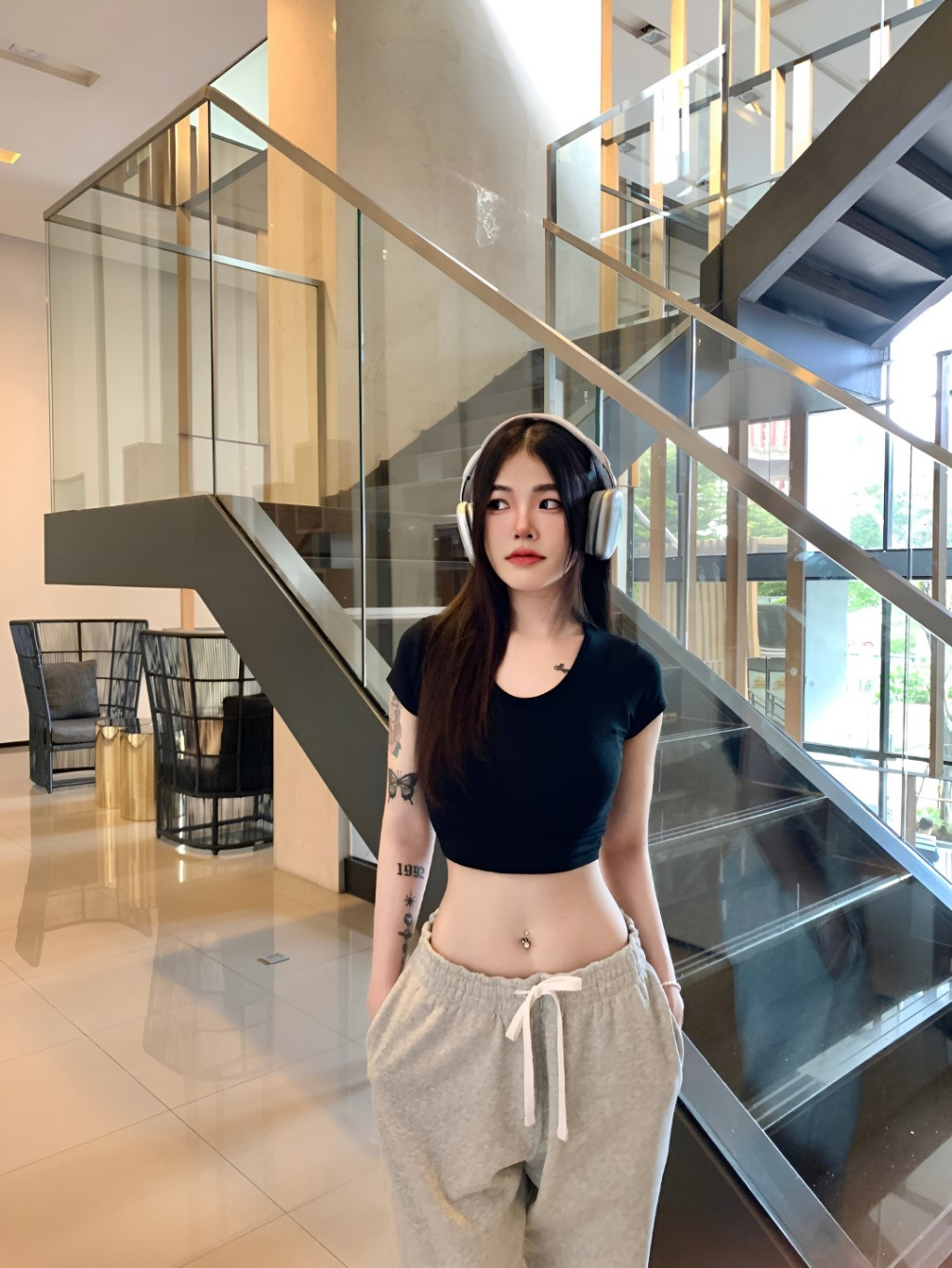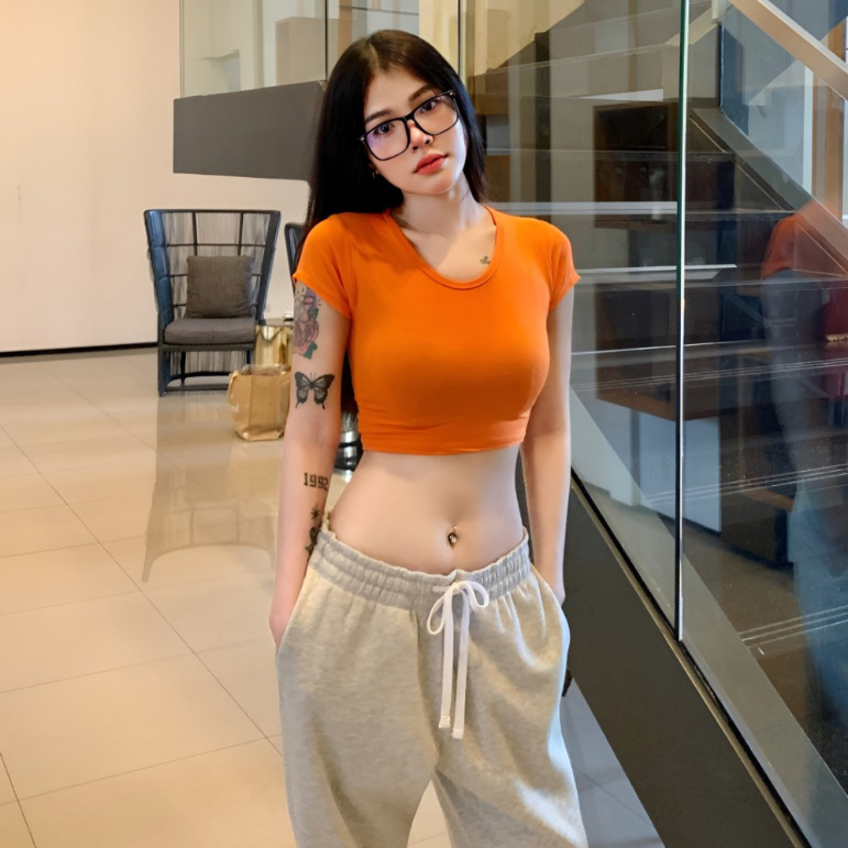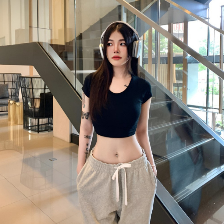ins辣妹性感露脐短款纯色T恤女新款修身显瘦纯欲U领打底上衣女T潮