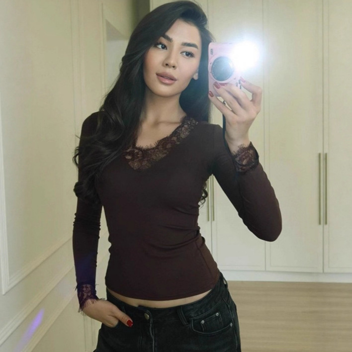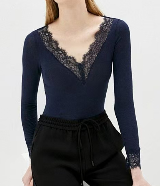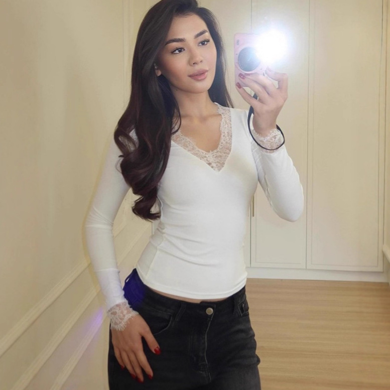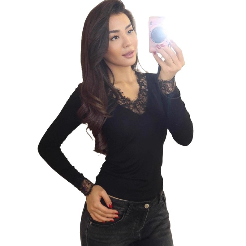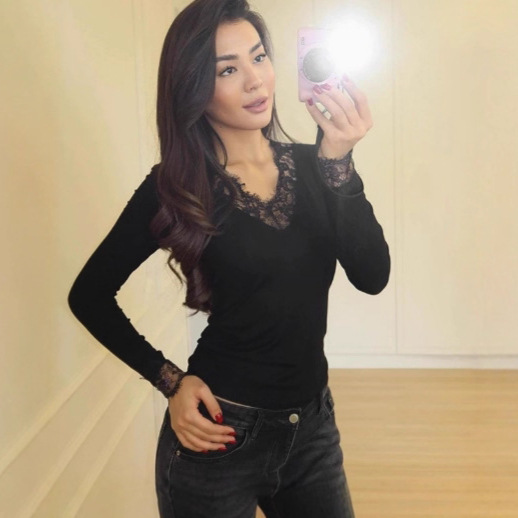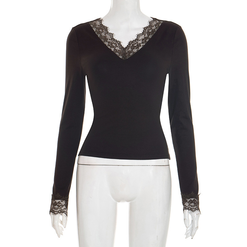 纯欲性感新款V领蕾丝花边长袖T恤女春秋辣妹修身显瘦打底上衣女潮