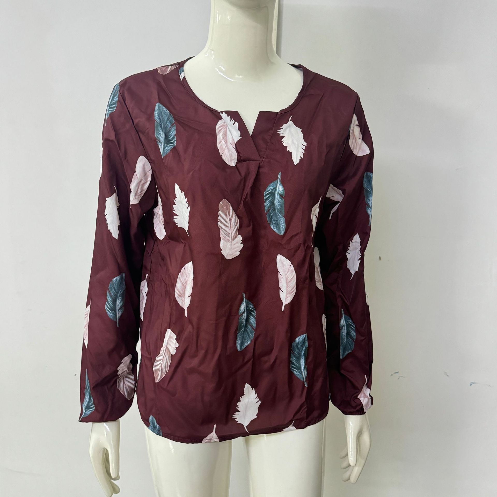 2025年秋冬跨境新款亚马逊欧美女装V领羽毛印花长袖宽松T恤女上衣