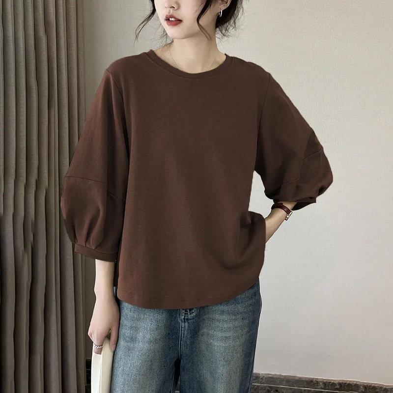 港风文艺复古灯笼袖T恤衫休闲七分袖上衣女装2025春夏季新款百搭