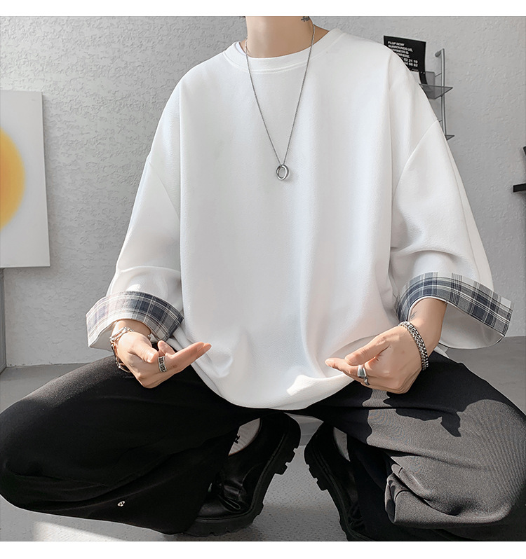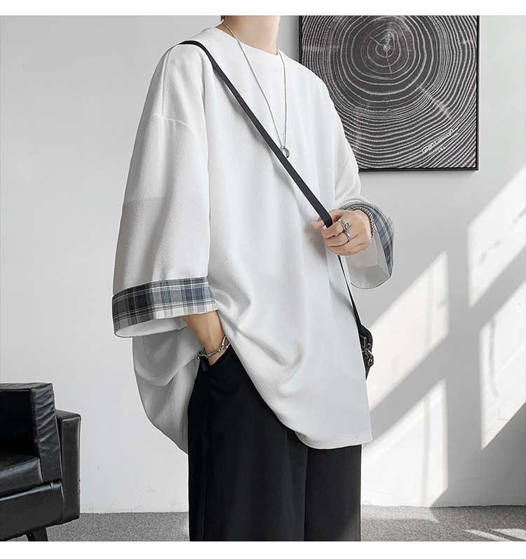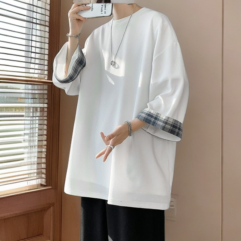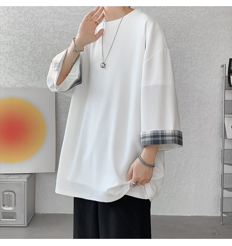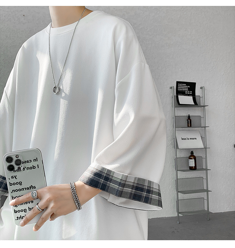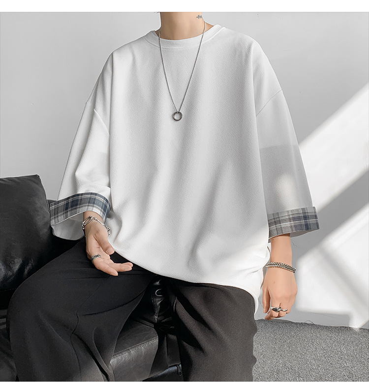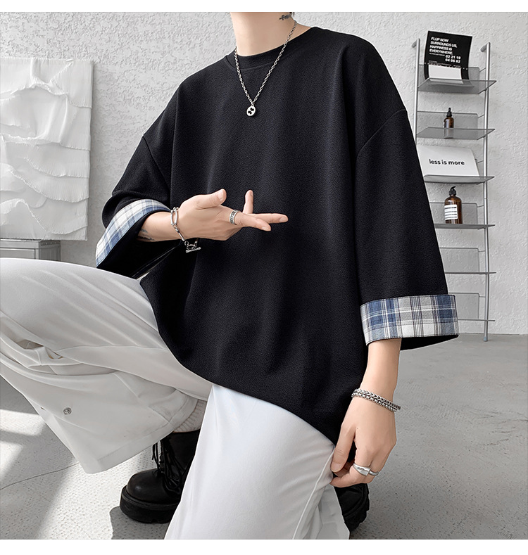 潮牌7分袖T恤男夏季格子拼接设计感小领口短袖潮流百搭七分袖体恤