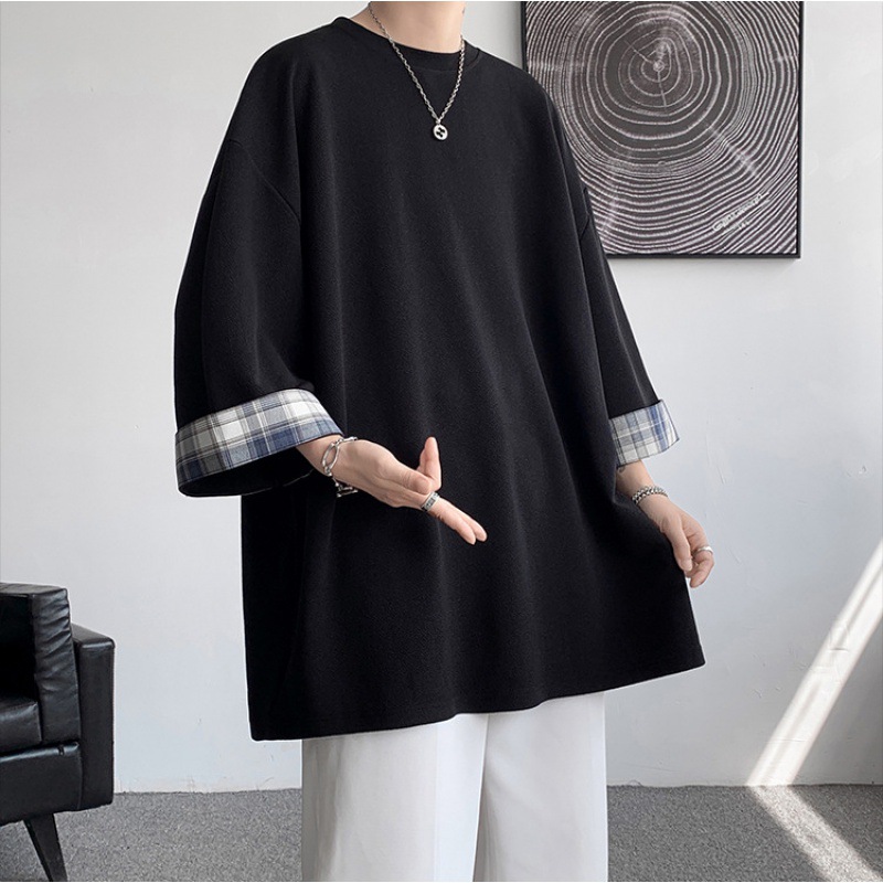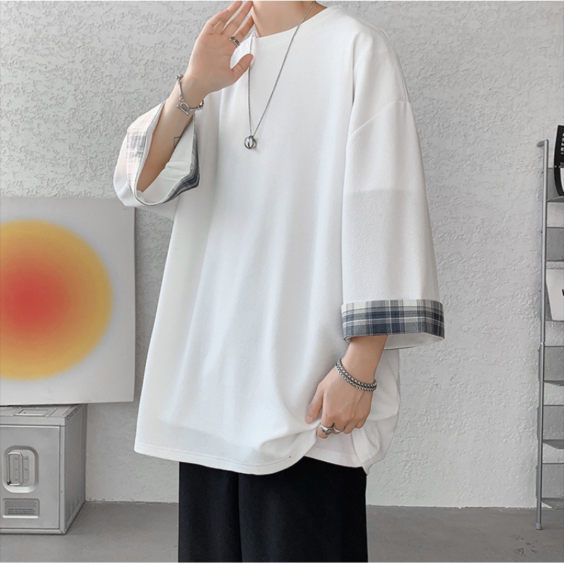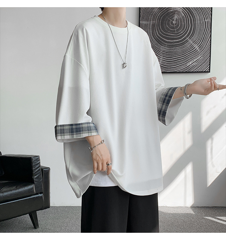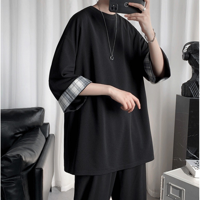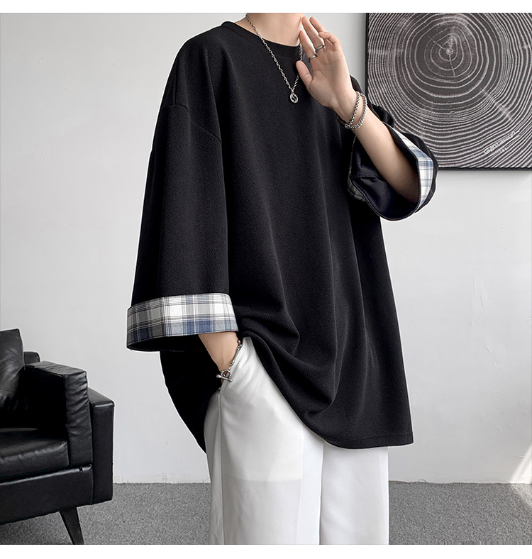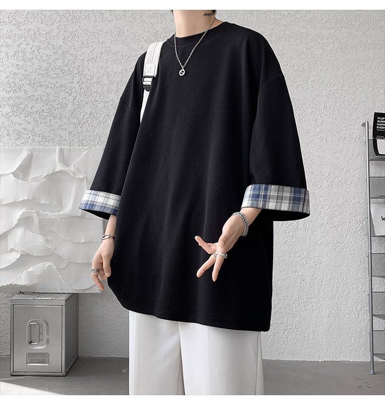 潮牌7分袖T恤男夏季格子拼接设计感小领口短袖潮流百搭七分袖体恤