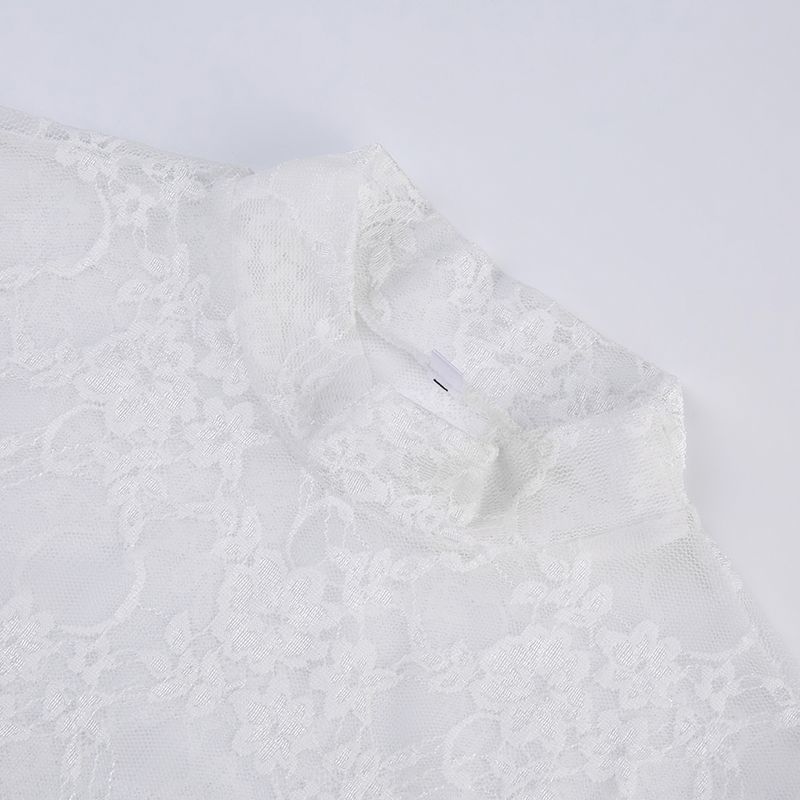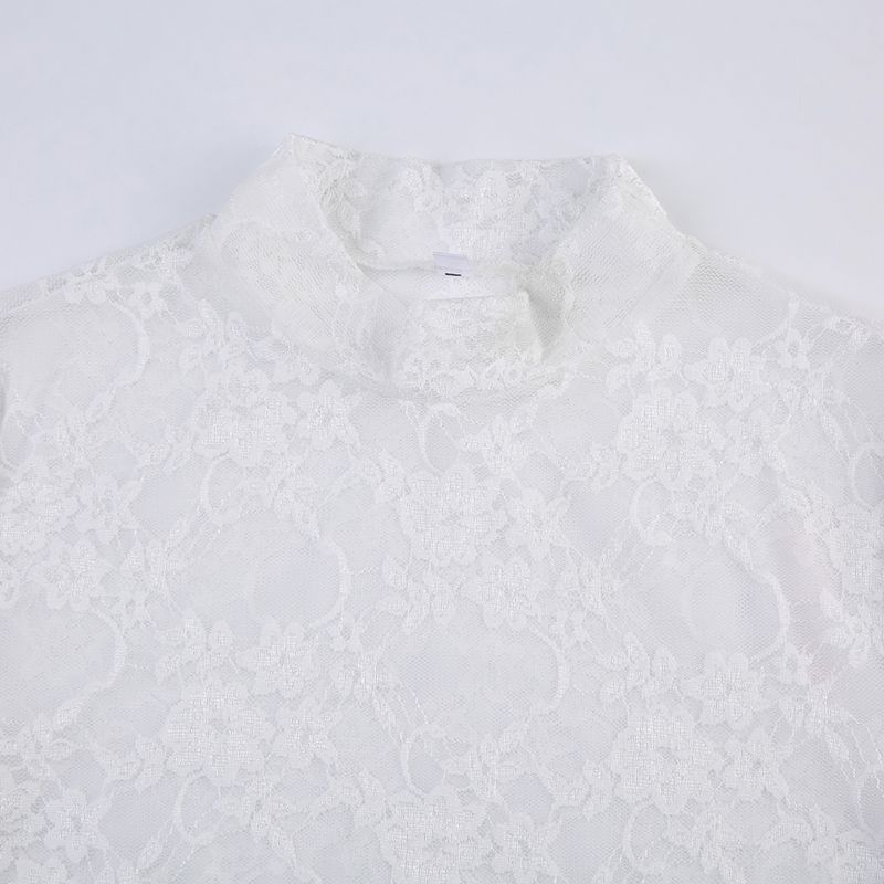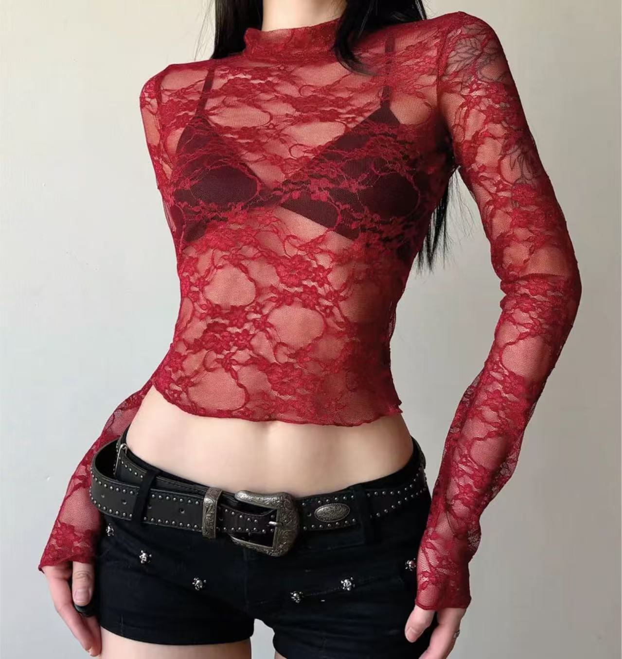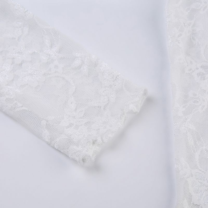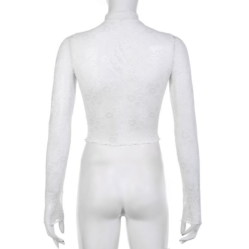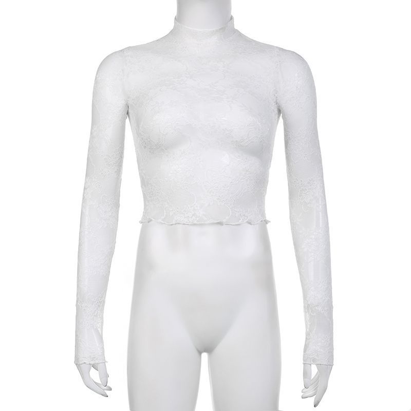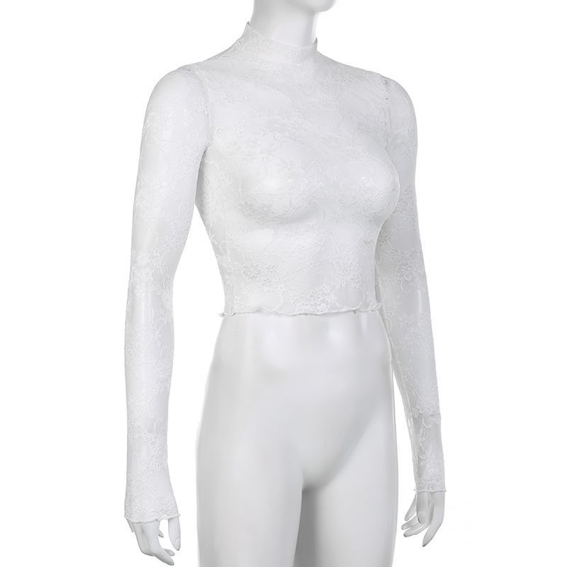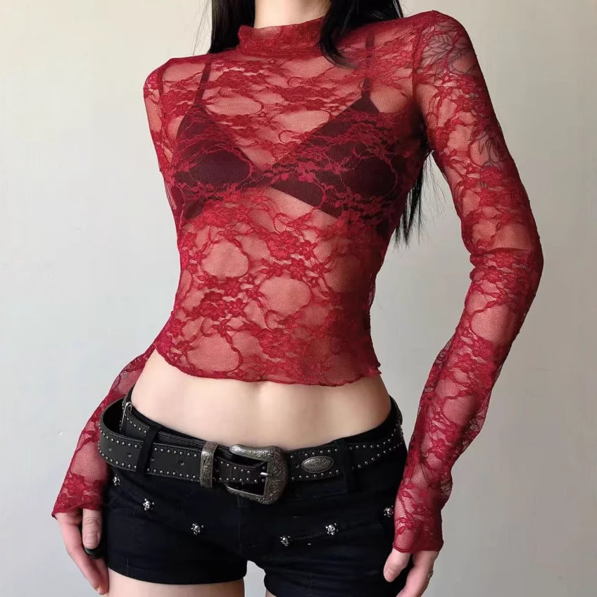 法式轻奢风蕾丝网纱长袖T恤女轻薄透视防晒衫修身辣妹上衣