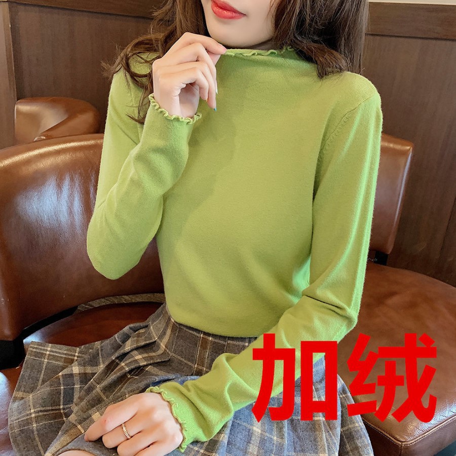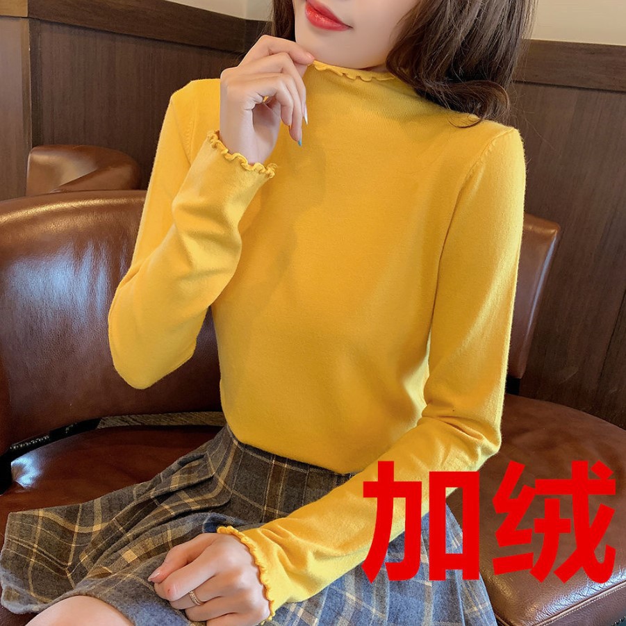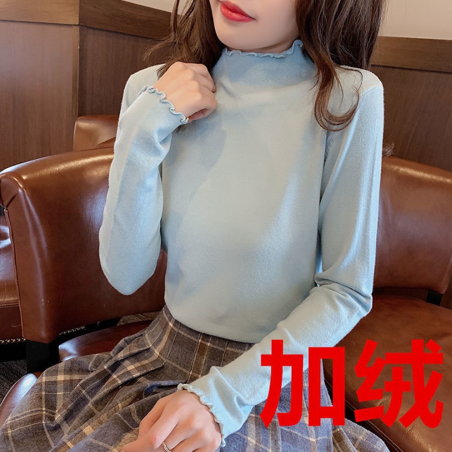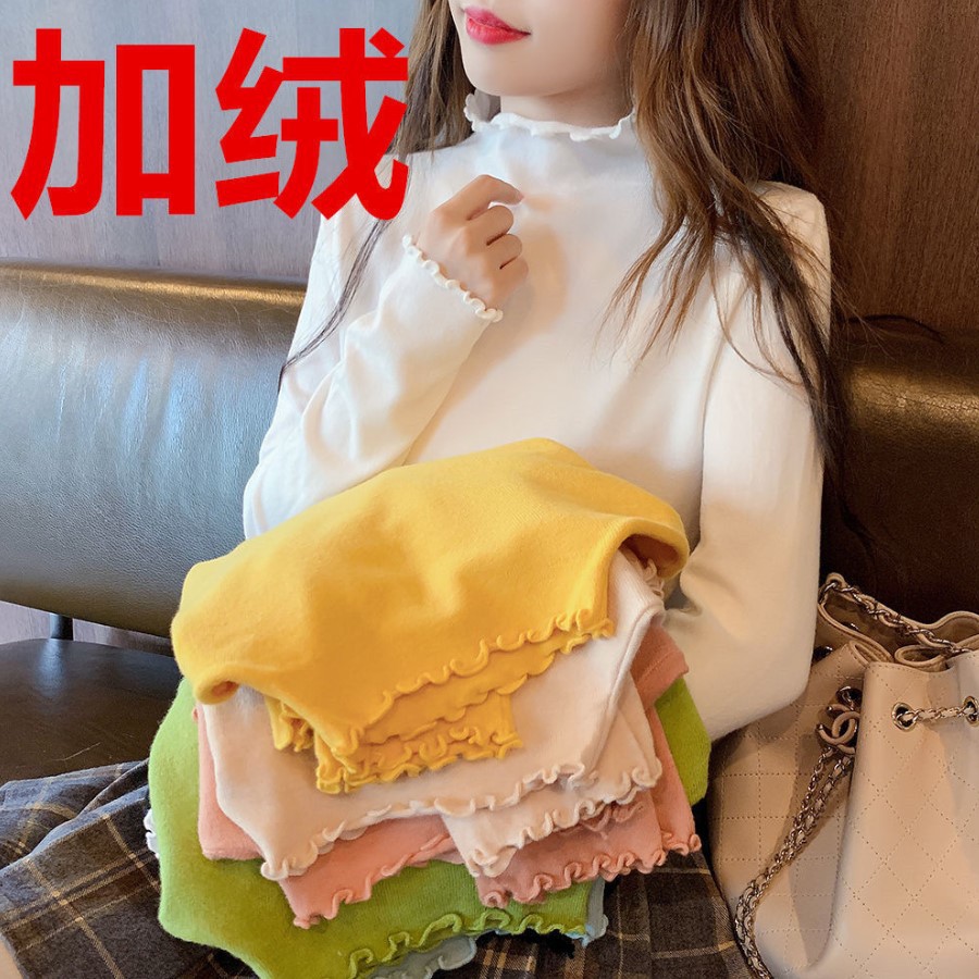 薄绒网红木耳边半高领打底衫女秋冬新款修身内搭长袖t恤洋气上衣
