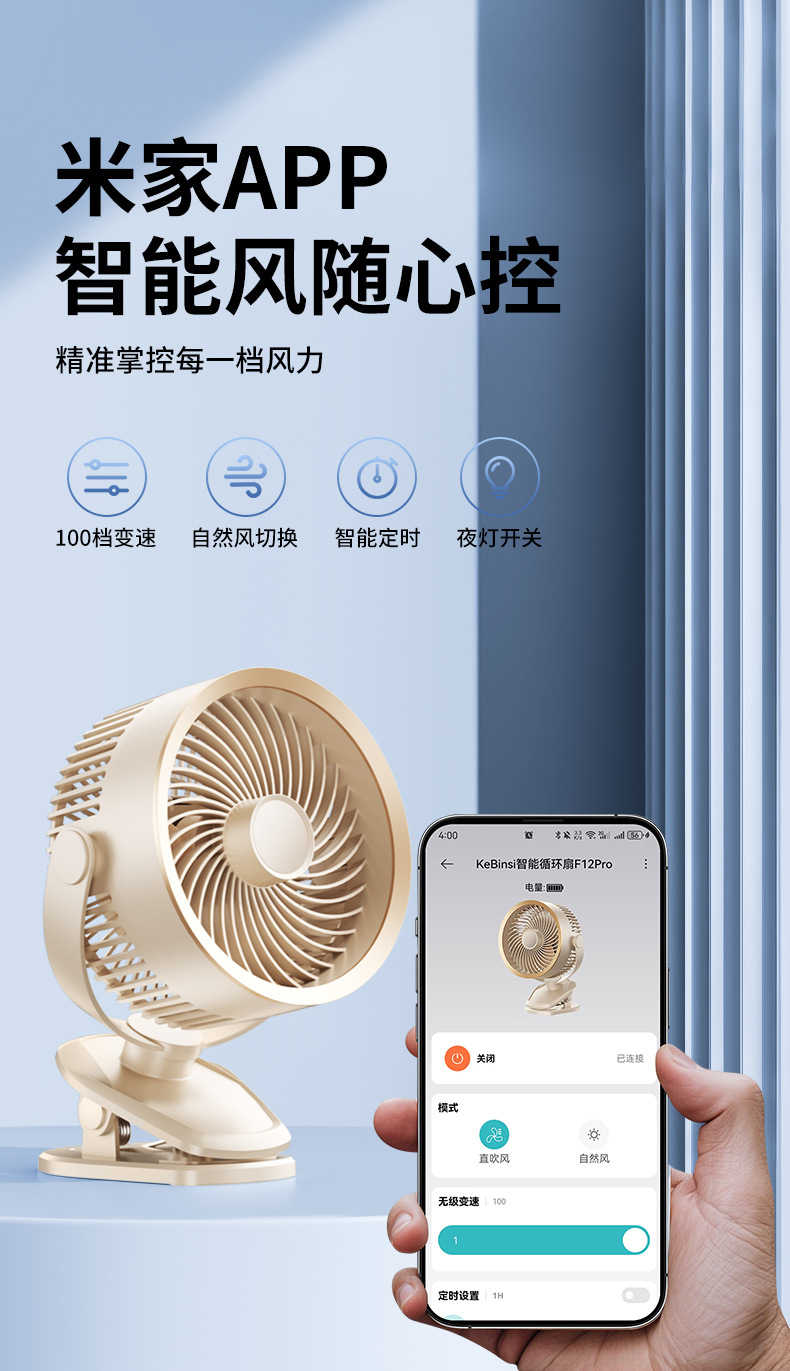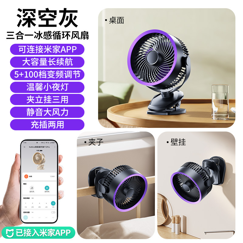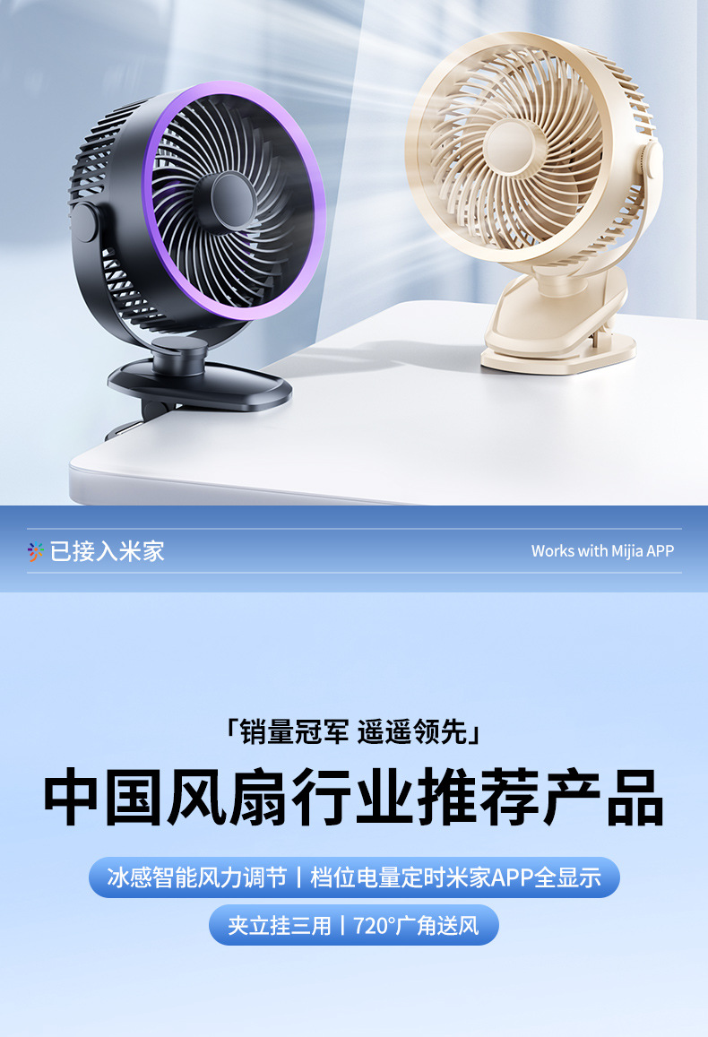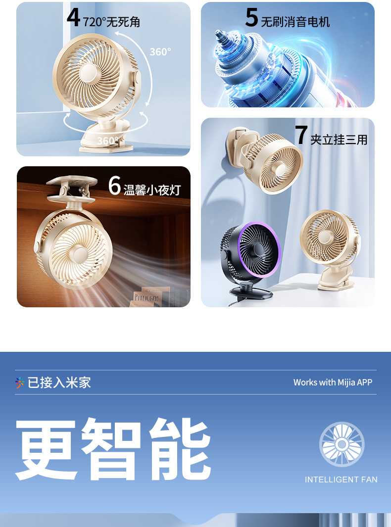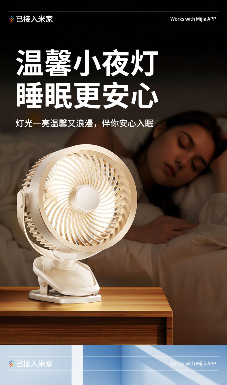 跨境新款夹子风扇夜灯照明迷你充电空气循环米家APP控制壁挂风扇