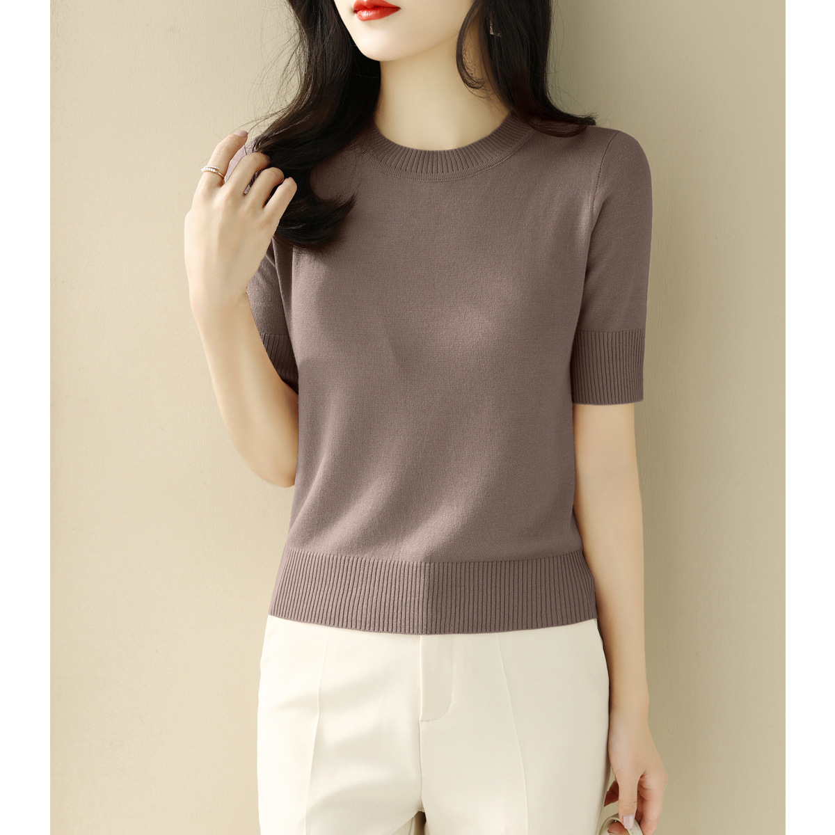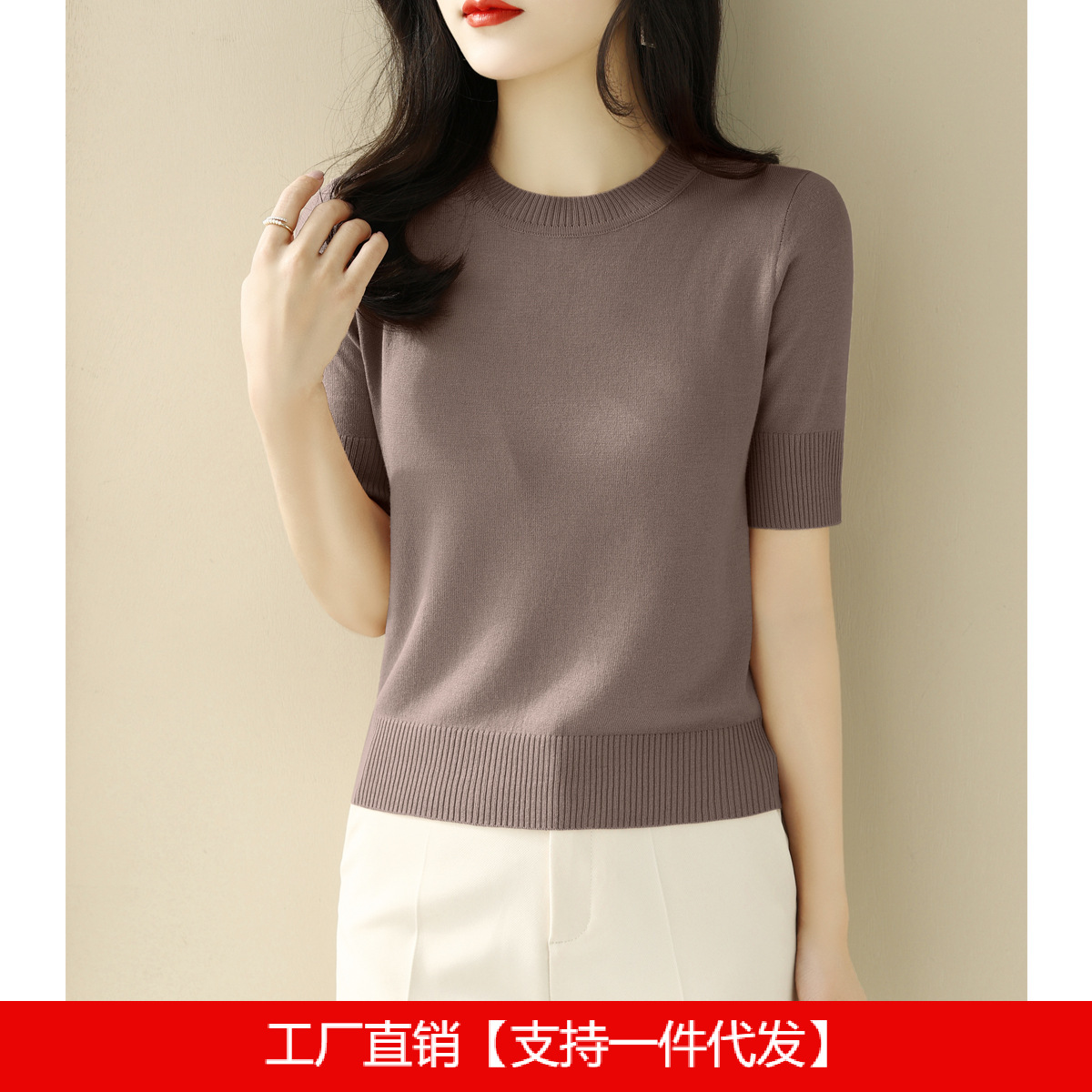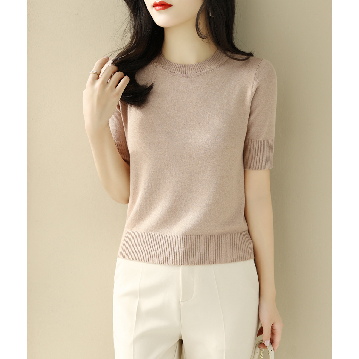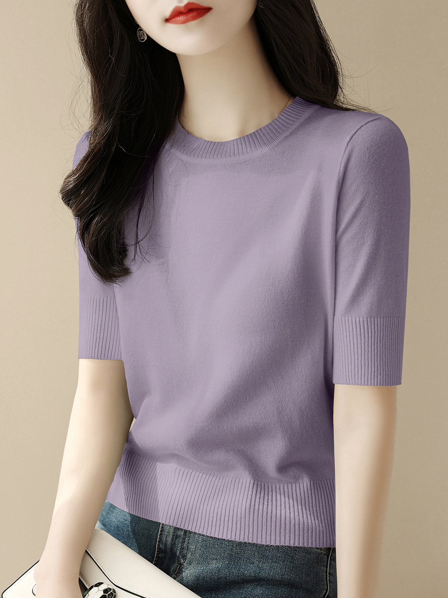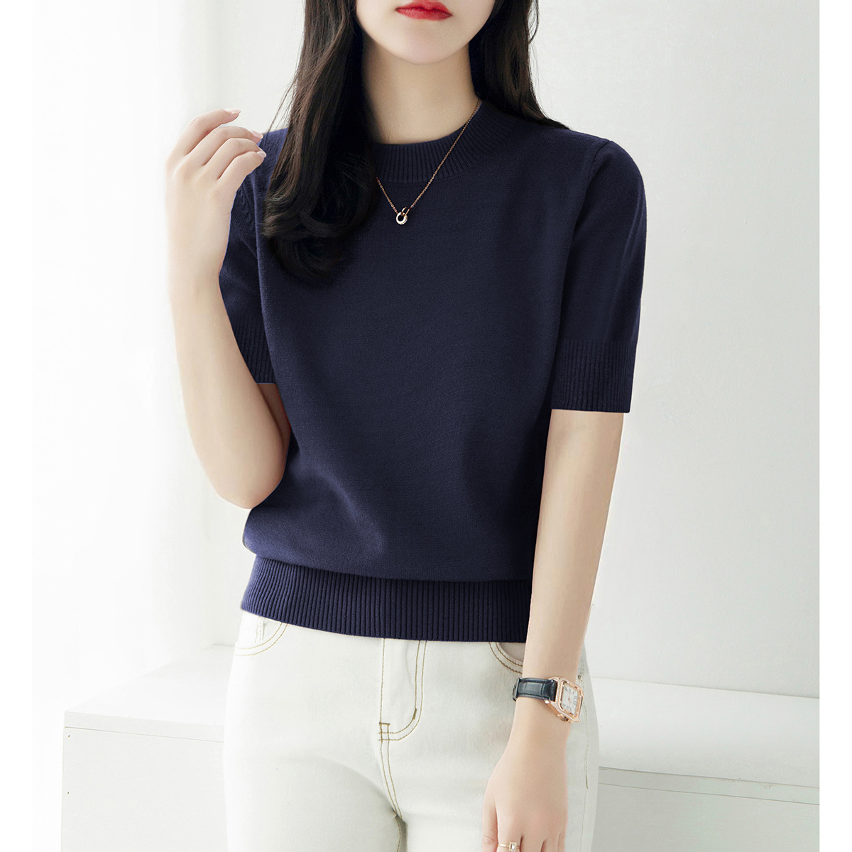 夏季白色穿搭短款半高圆领宽松显瘦短袖t恤针织衫女新款打底上衣