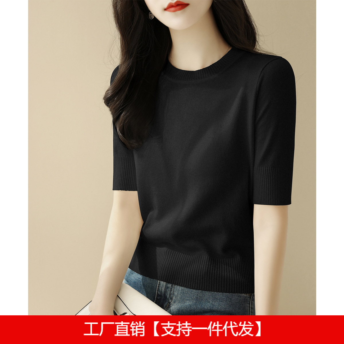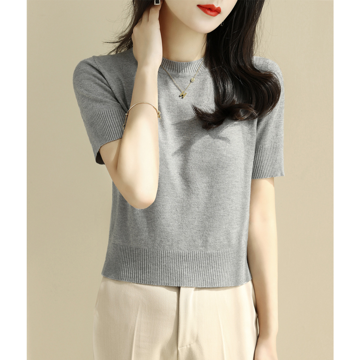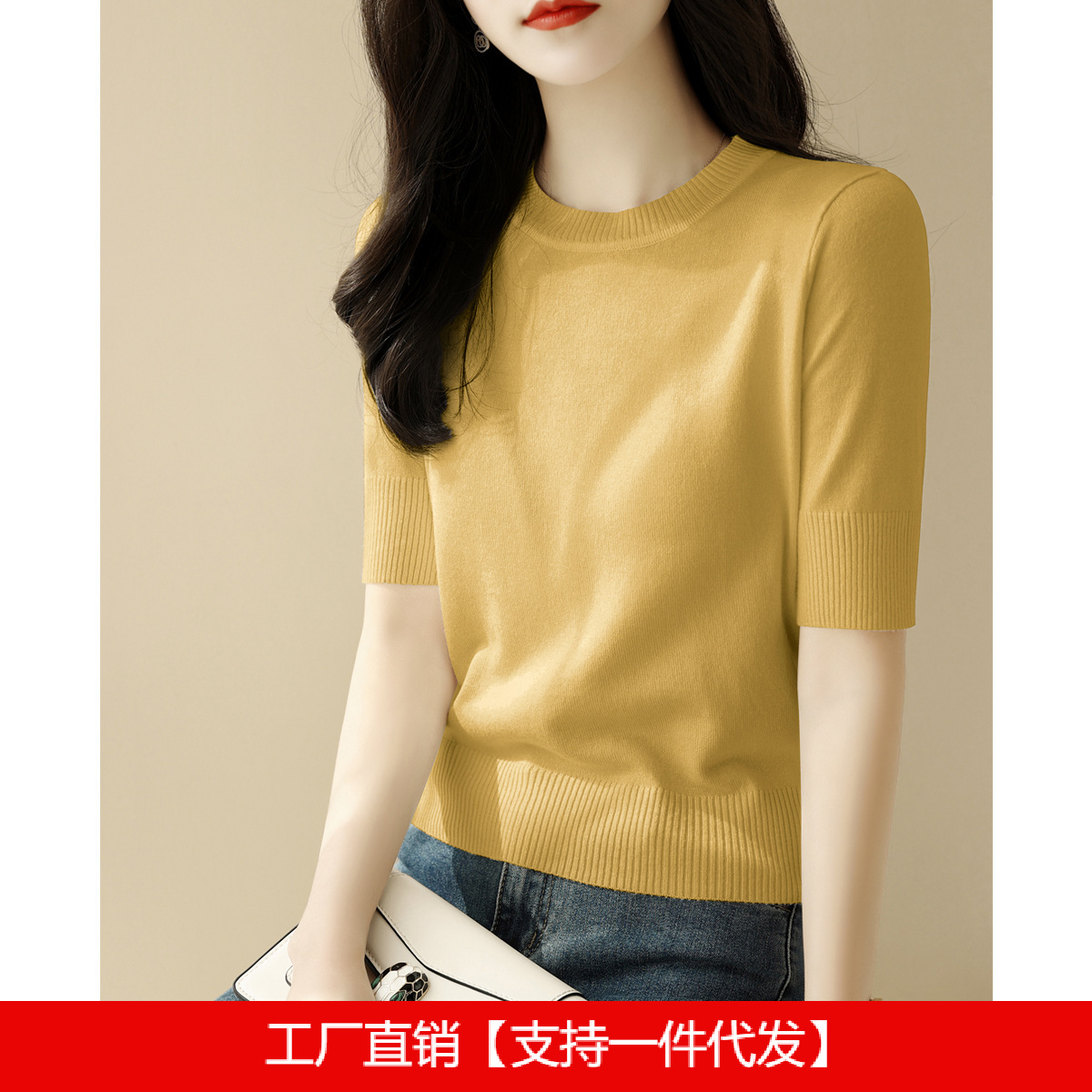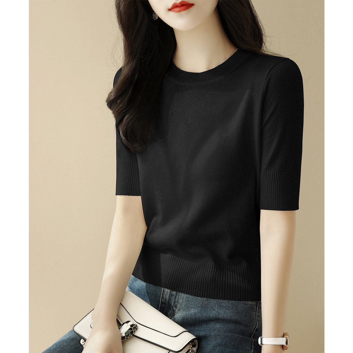 夏季白色穿搭短款半高圆领宽松显瘦短袖t恤针织衫女新款打底上衣