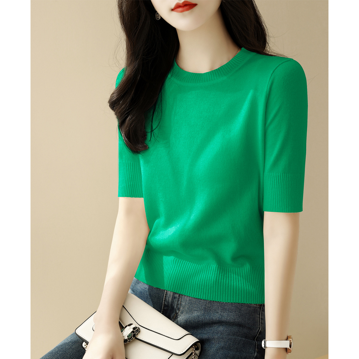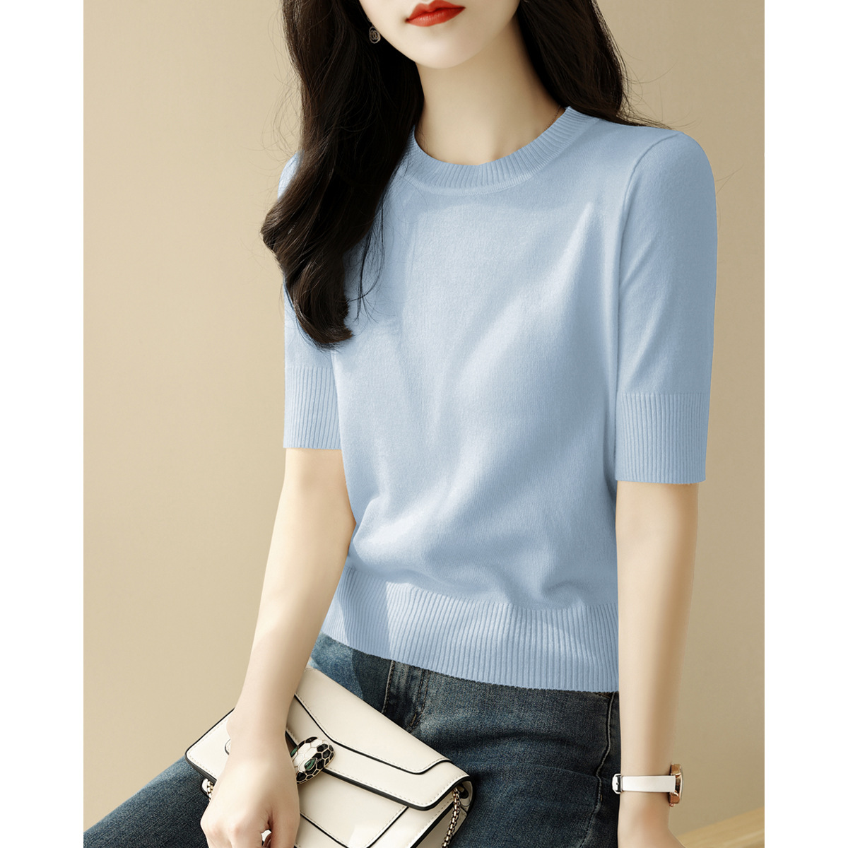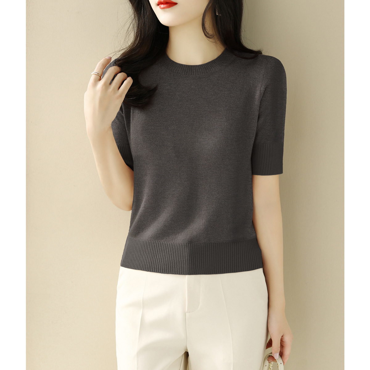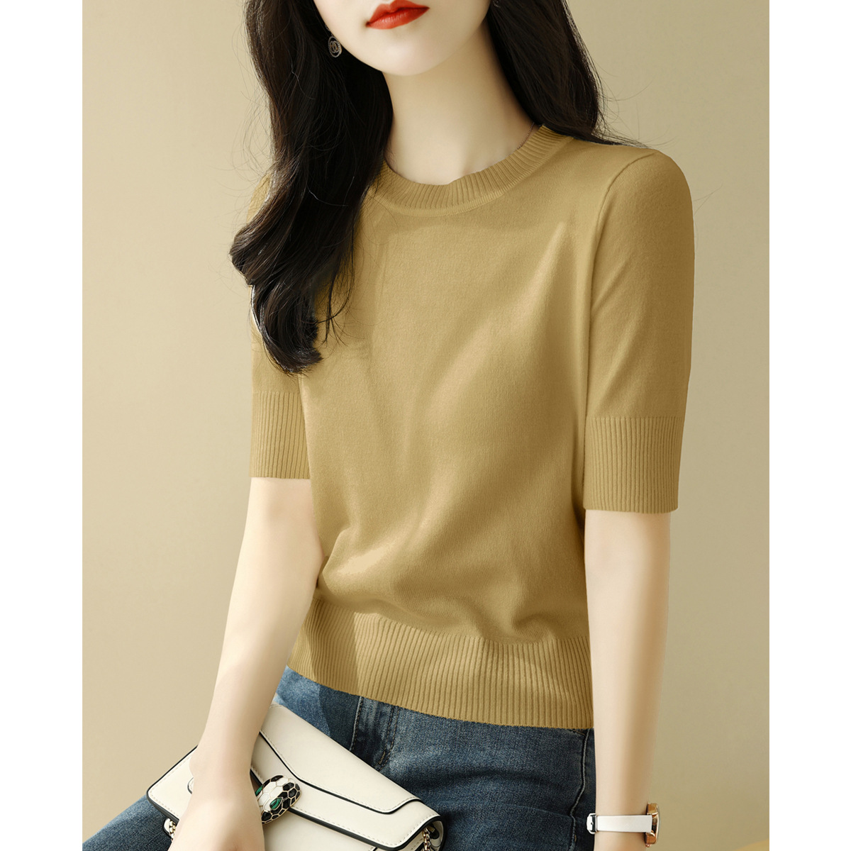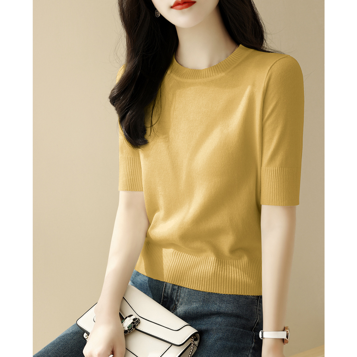 夏季白色穿搭短款半高圆领宽松显瘦短袖t恤针织衫女新款打底上衣